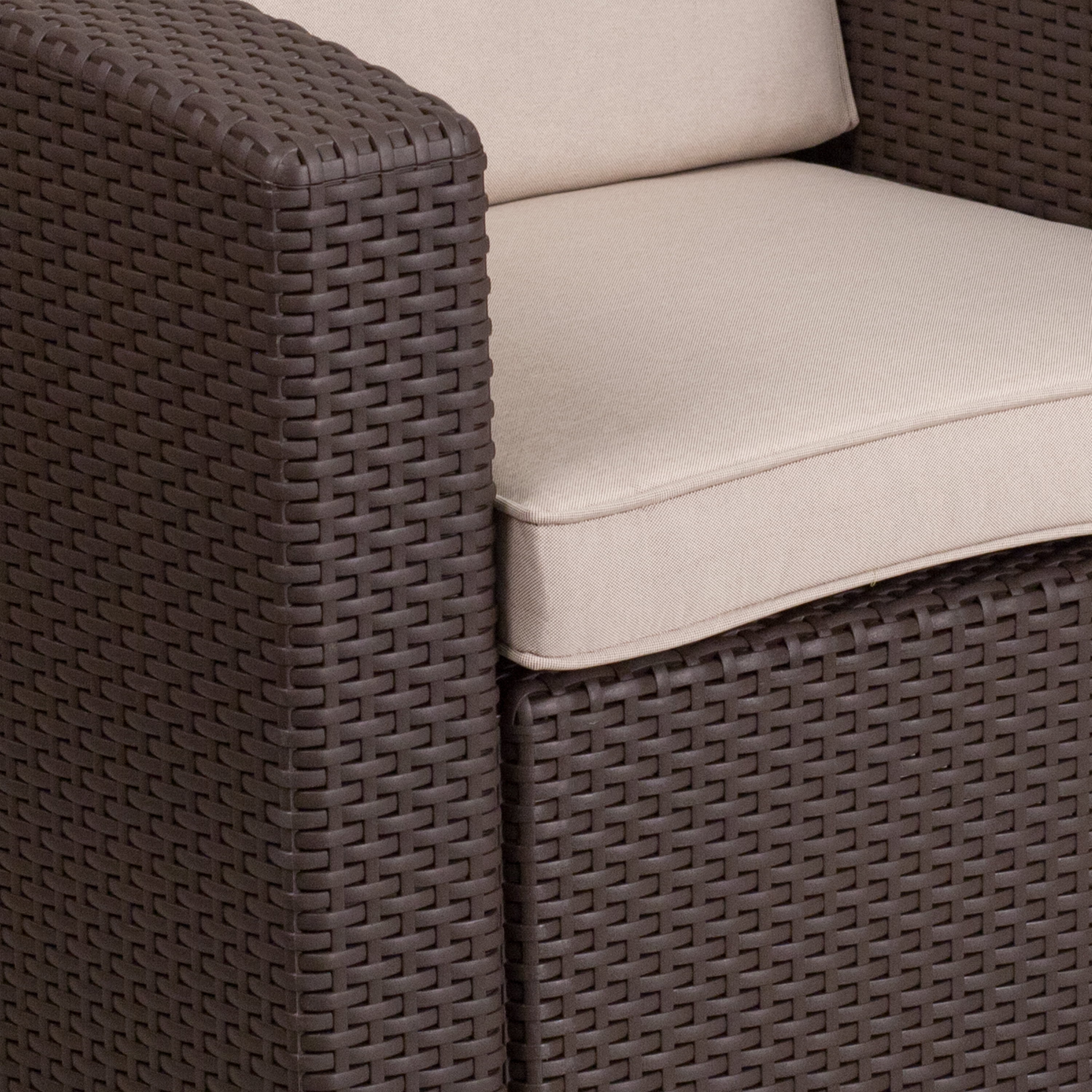 Contemporary Outdoor Chair Chocolate Brown Frame Finish Curved Arms All-Weather Beige Removable Cushion Cover Dense Foam Cushion CAL 117 Fire Retardant Foam Deep Seated Comfort Durable Resin Frame Construction Plastic Block Feet Overall Height Without Cushion: 30″; Back Height From Seat Without Cushion: 16.25″; Seat Depth Without Cushion: 21″