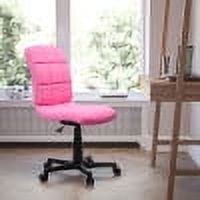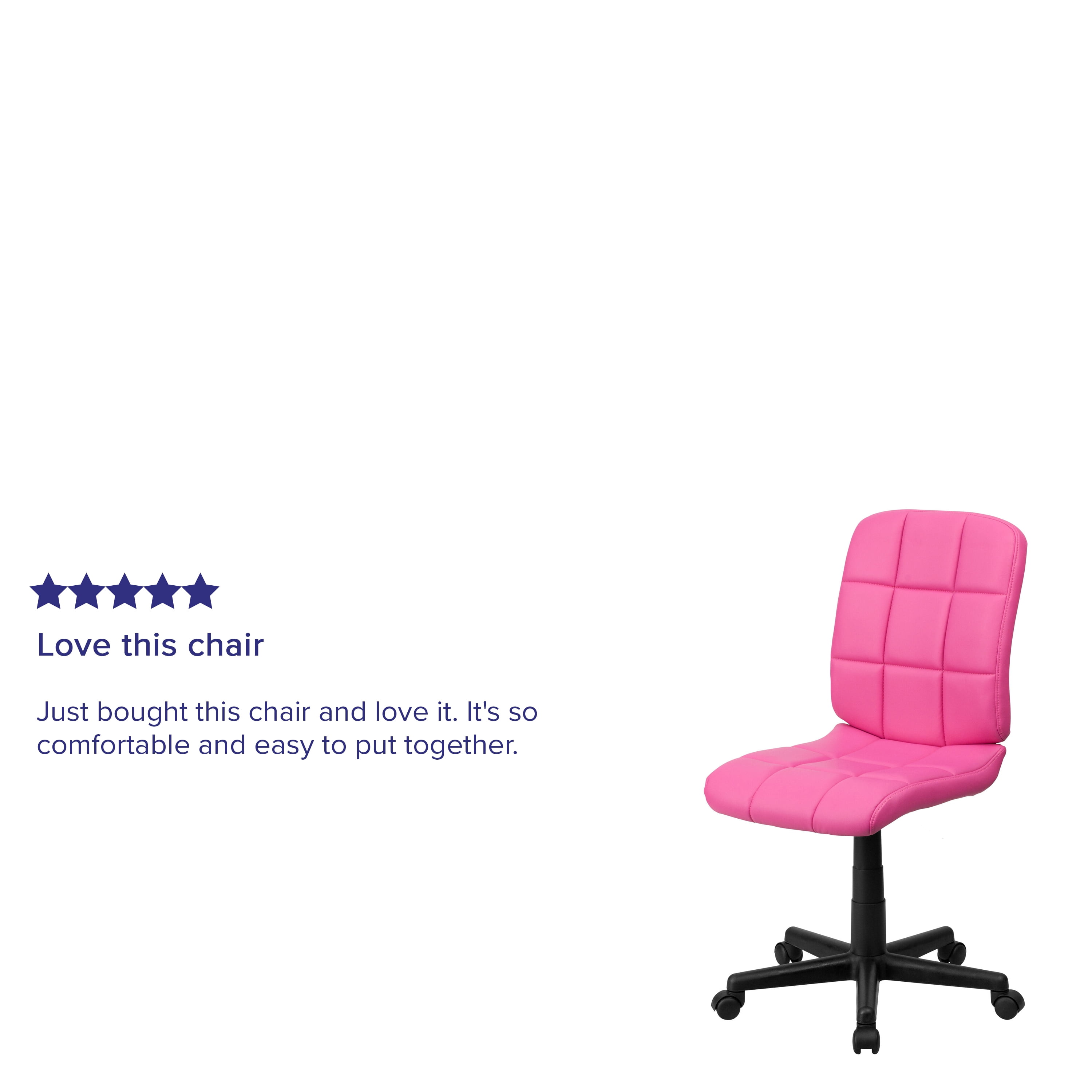 Flash Furniture Clayton Mid-Back Pink Quilted Vinyl Swivel Task Office Chair Modern Adjustable Task Office Chair for home or business use Pink Quilted Vinyl Tufted Upholstery for a classic look Mid-Back Design supports the mid to upper back region Padded Upholstered Seat with CAL 117 Fire Retardant Foam Waterfall Seat Edge reduces pressure on your legs, improves circulation 360 Degree Swivel Seat allows you to reach multiple work surfaces Pneumatic Seat Height Adjustment for a custom fit 5-Star Nylon Base with Dual-Wheel Casters provide effortless mobility Armless swivel task chair perfect for use in small office spaces, home offices and dorm rooms PRODUCT MEASUREMENTS: Overall Size: 23″W x 24″D x 34-38.75″H; Seat Size: 16.5″W x 16.5″D x 16.75-21.75″H; Back Size: 16.5″W x 19″H