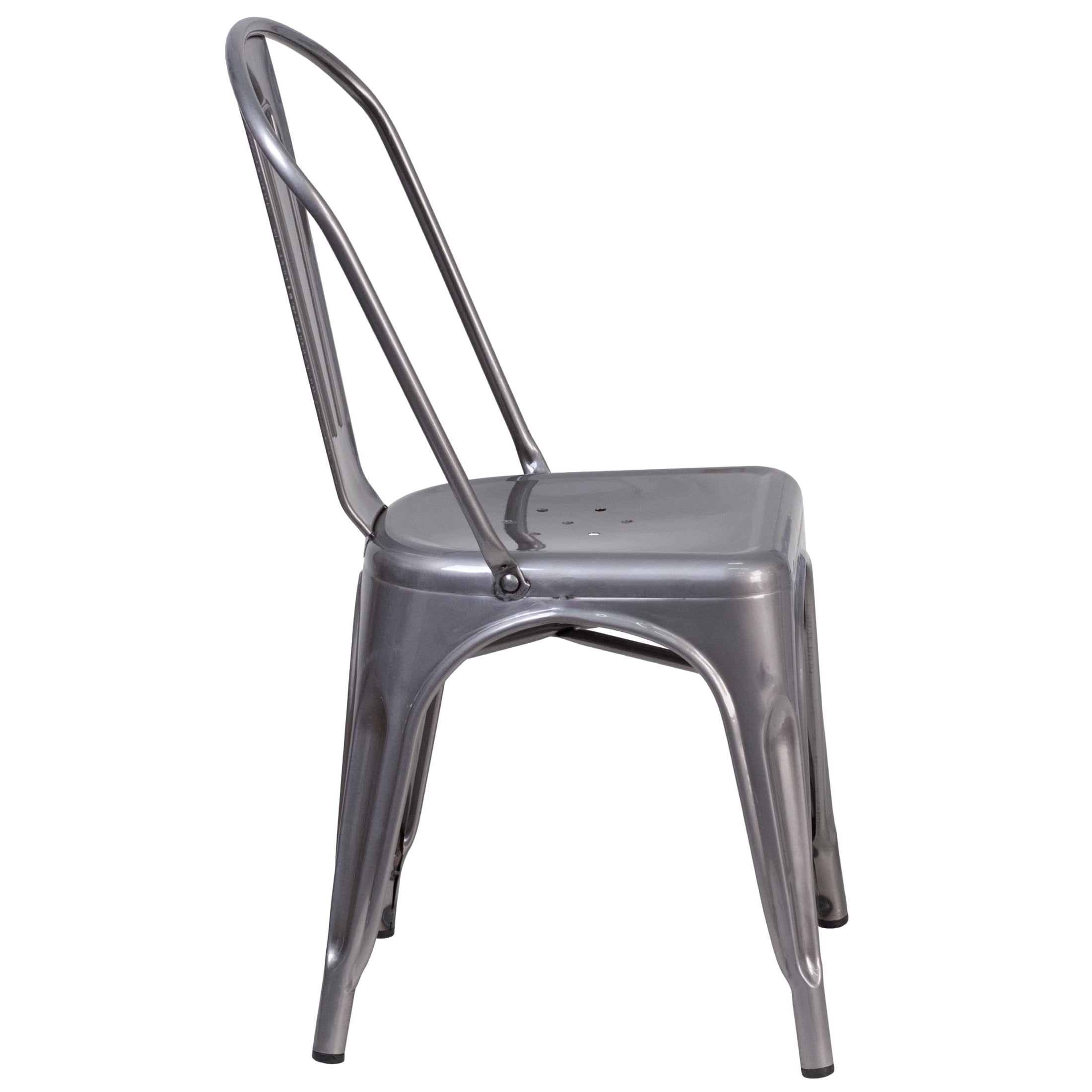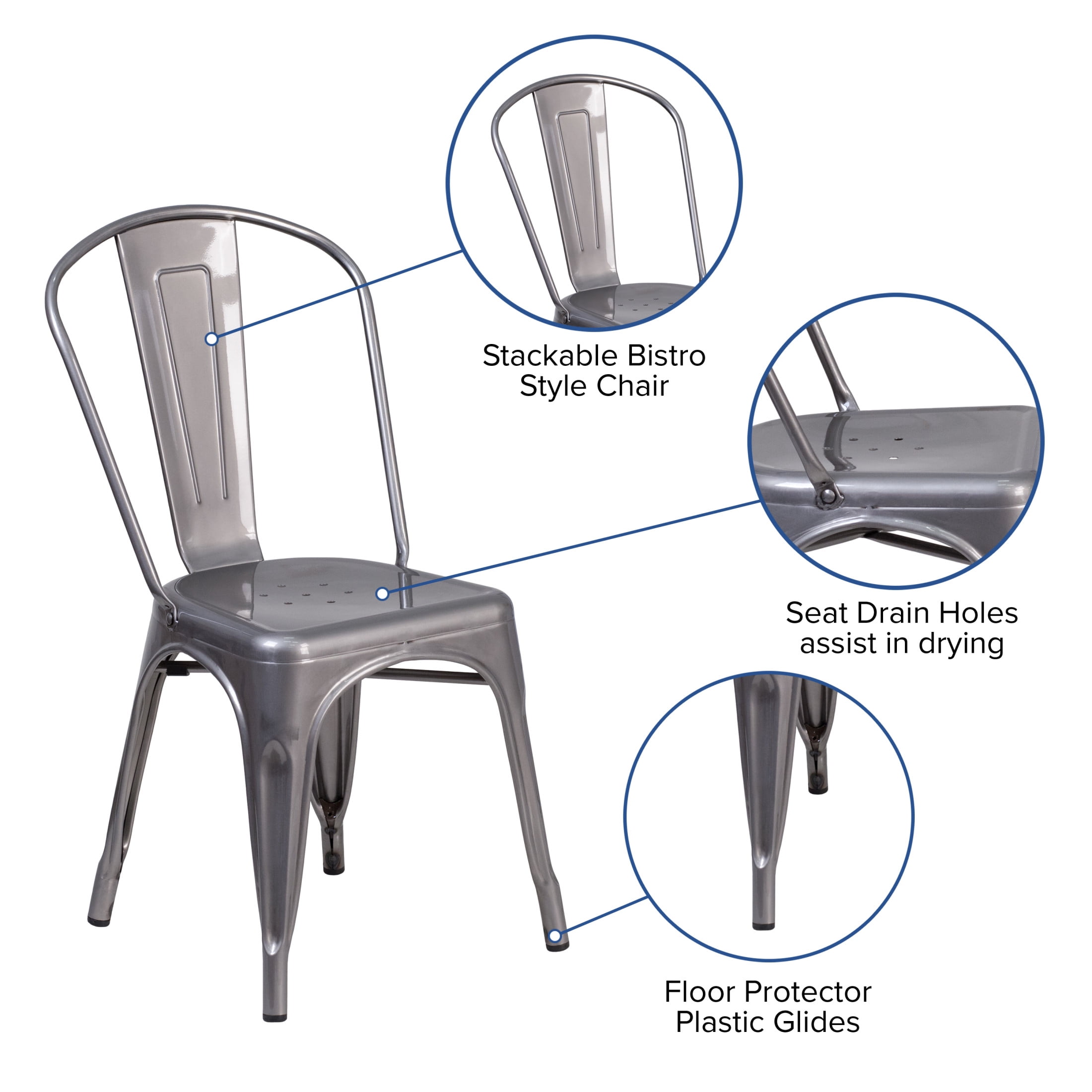 Instantly add an urban look and feel to your dining area with this clear coated stackable metal chair with vertical slat back. This chair’s curved, vertical slat back provides firm spinal support and ensures guests are at a comfortable height to enjoy your signature drinks, appetizers, entrees and desserts. Additionally, its flat, drain hole seat is easy to clean which is a must in the hospitality industry. Made of sturdy metal, this chair is durable enough to withstand years of use. An under-seat cross brace provides additional stability while the lightweight design allows for easy movement and transportation. This metal dining chair can be stacked up to 15 high when you need to clean the floors or for storage when not in use. Plastic caps on the cross brace protect the finish when stacked. Add this bistro style chair anywhere you want a sleek, modern look.