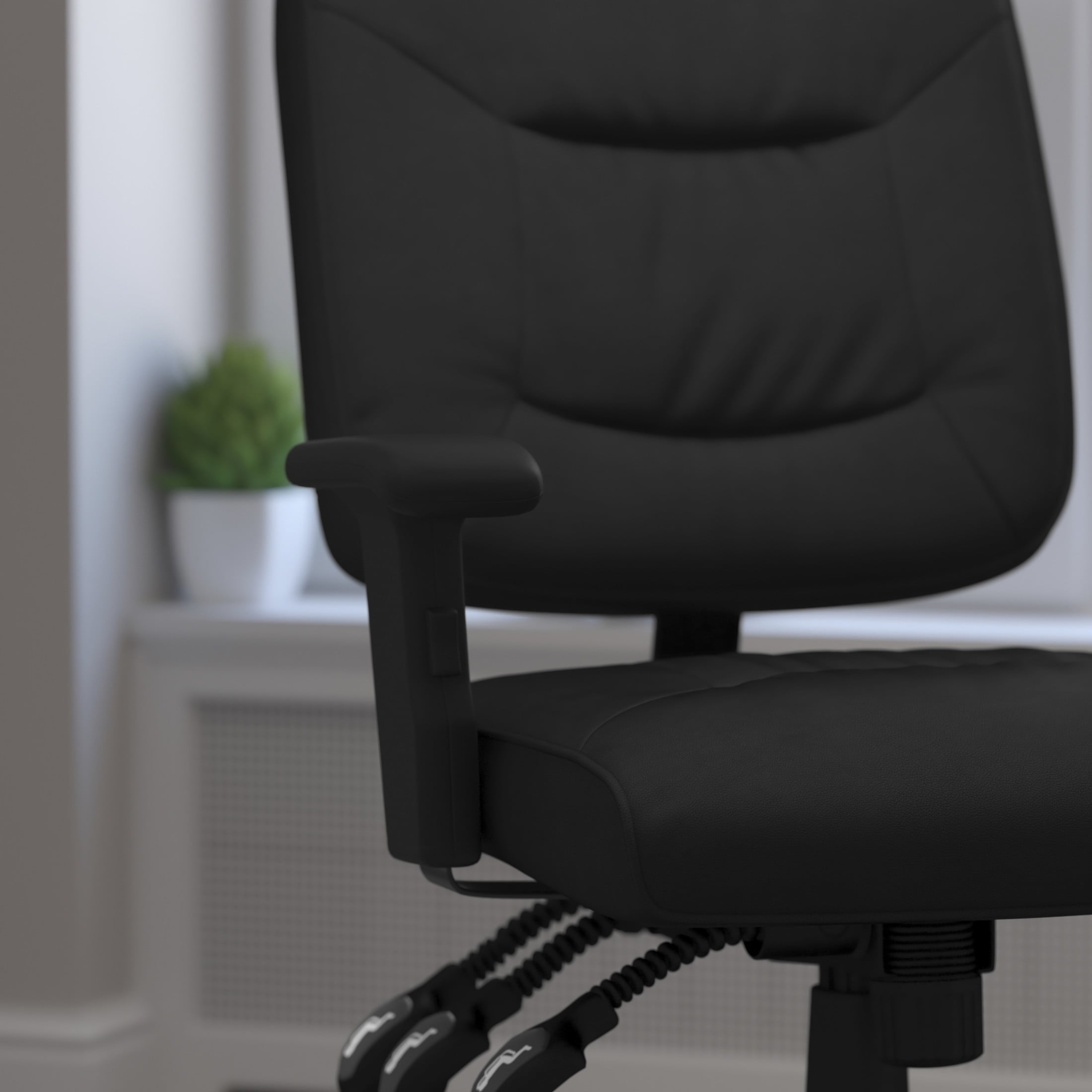 Flash Furniture Cole Mid-Back Black LeatherSoft Multifunction Swivel Ergonomic Task Office Chair with Adjustable Arms Contemporary Task Office Chair Black LeatherSoft Upholstery Mid-Back Design Tufted Back Triple Paddle Control Mechanism Back Height Adjustment Knob positions the lumbar support to reduce back pain Infinite-Locking Back Angle Adjustment helps reduce disc pressure by changing the angle of your torso Multi-Tilt Lock Mechanism rocks/tilts and locks the chair in infinite positions Tilt Tension Adjustment Knob adjusts the chair’s backward tilt resistance CA117 Fire Retardant Foam Waterfall Seat reduces pressure on your legs Swivel Seat Pneumatic Seat Height Adjustment Height Adjustable Padded Arms Heavy Duty Nylon Base Dual Wheel Casters LeatherSoft is leather and polyurethane for added Softness and Durability PRODUCT MEASUREMENTS: Overall Size: 25″W x 25″D x 34-40.25″H; Seat Size: 18.25″W x 18.5″D x 18.25-22.25″H; Back Size: 18.25″W x 16.75″H; Arm Size: 6.25-9″H from seat