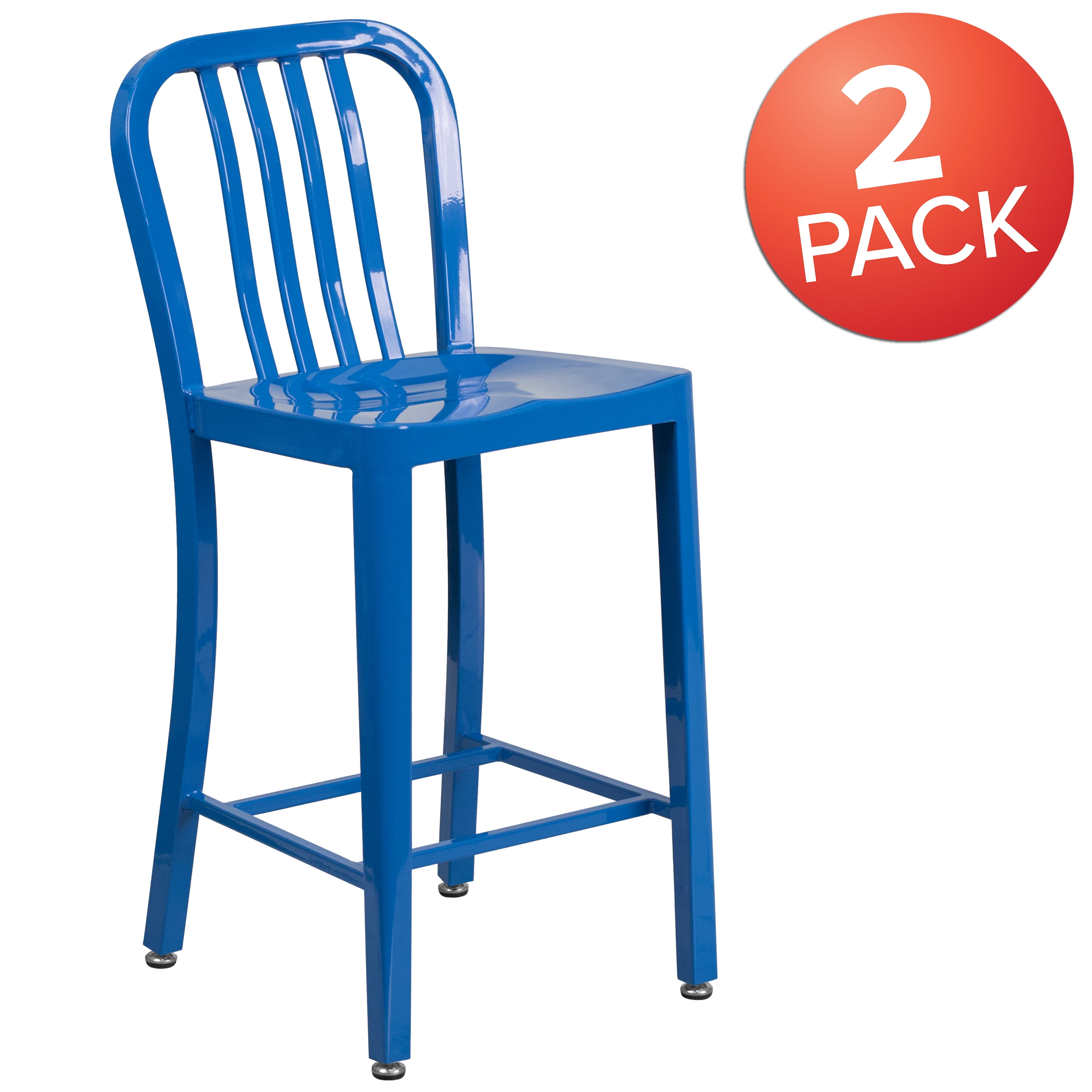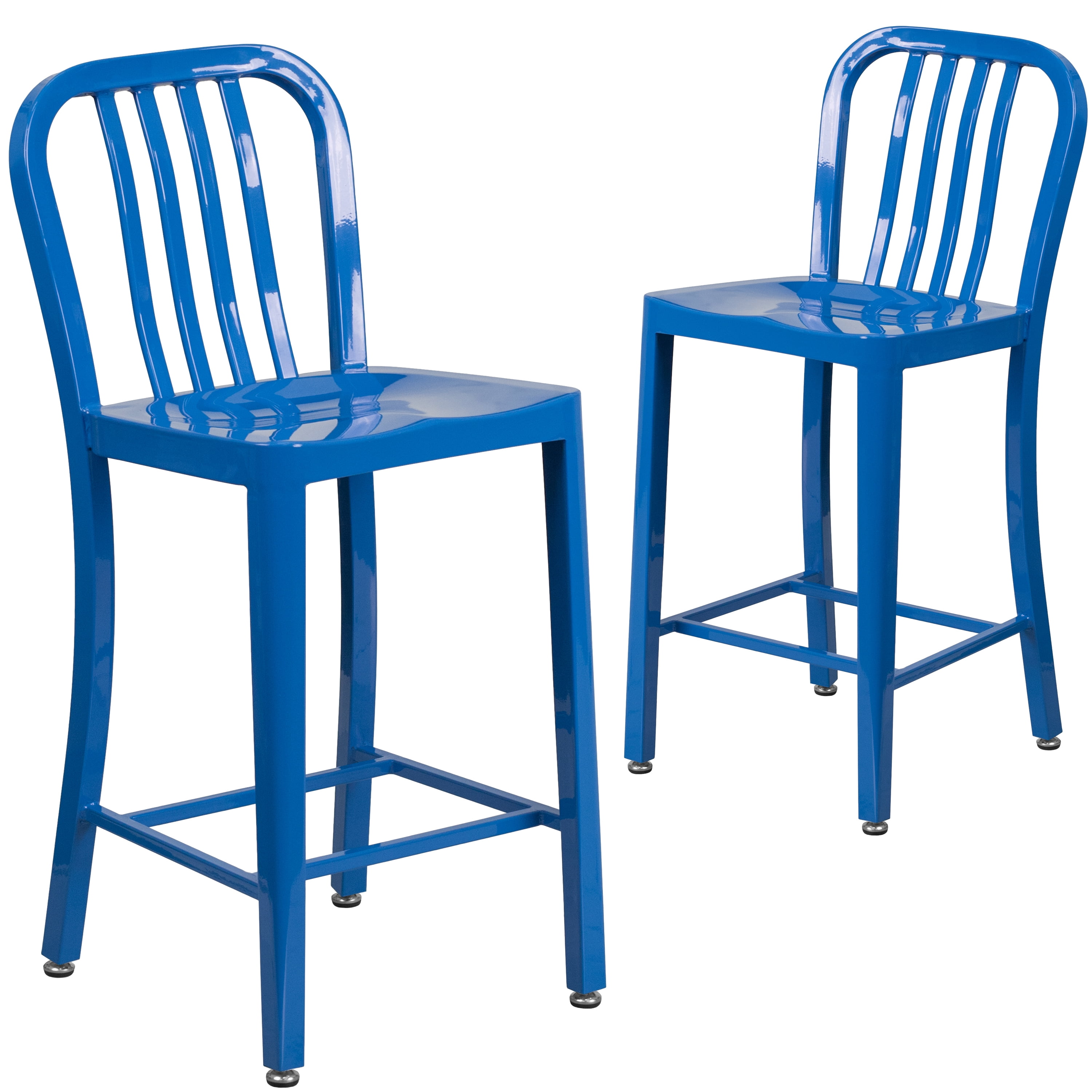 Set of 2 Industrial Modern Counter Stools 500 lb. Static Weight Capacity Curved Vertical Slat Back Ergonomic Contoured Seat Galvanized Steel Construction Blue Powder Coated Frame Finish Screw Leveling Floor Glides Designed for Indoor or Outdoor Use Designed for Commercial or Residential Use