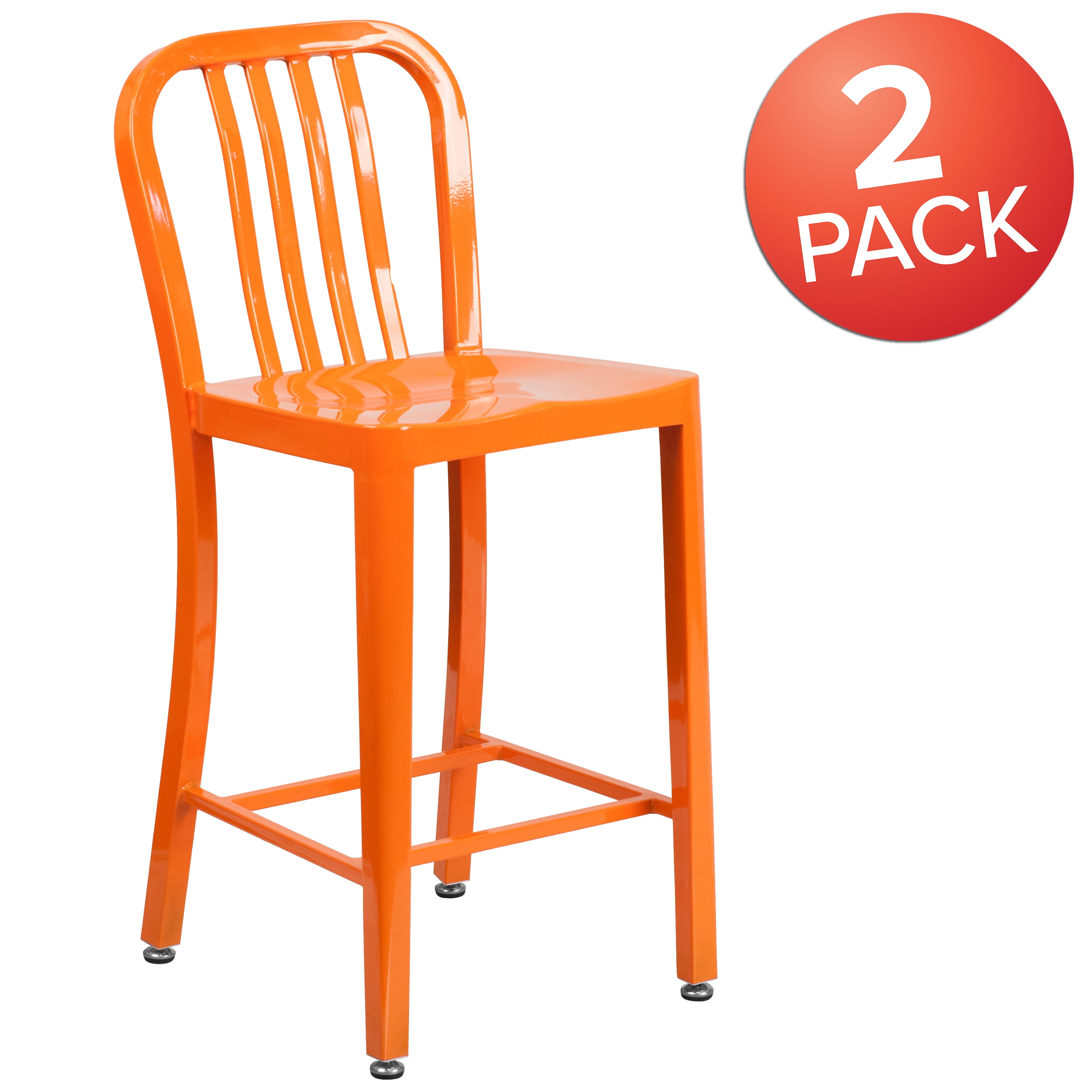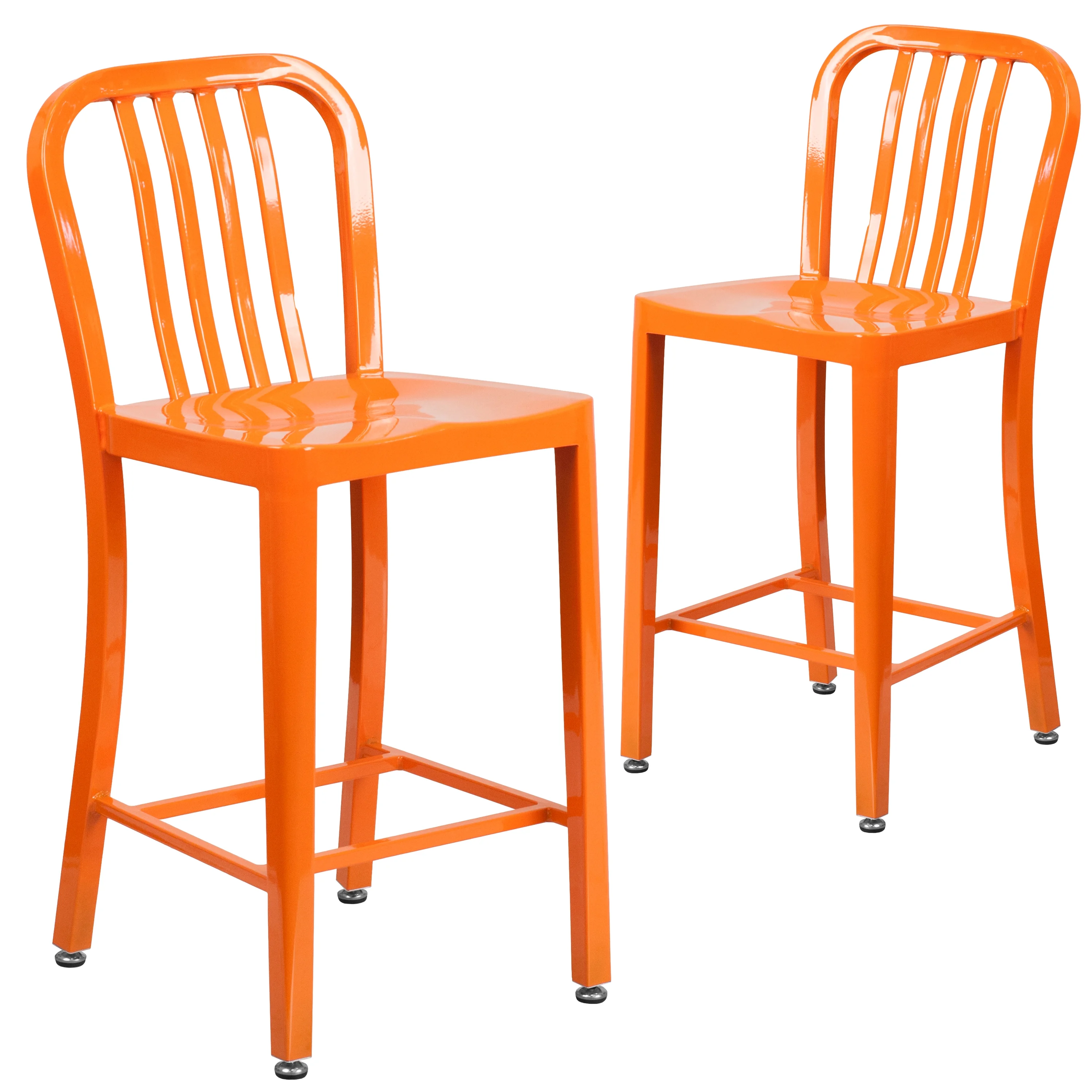 Set of 2 Industrial Modern Counter Stools 500 lb. Static Weight Capacity Curved Vertical Slat Back Ergonomic Contoured Seat Galvanized Steel Construction Orange Powder Coated Frame Finish Screw Leveling Floor Glides Designed for Indoor or Outdoor Use Designed for Commercial or Residential Use