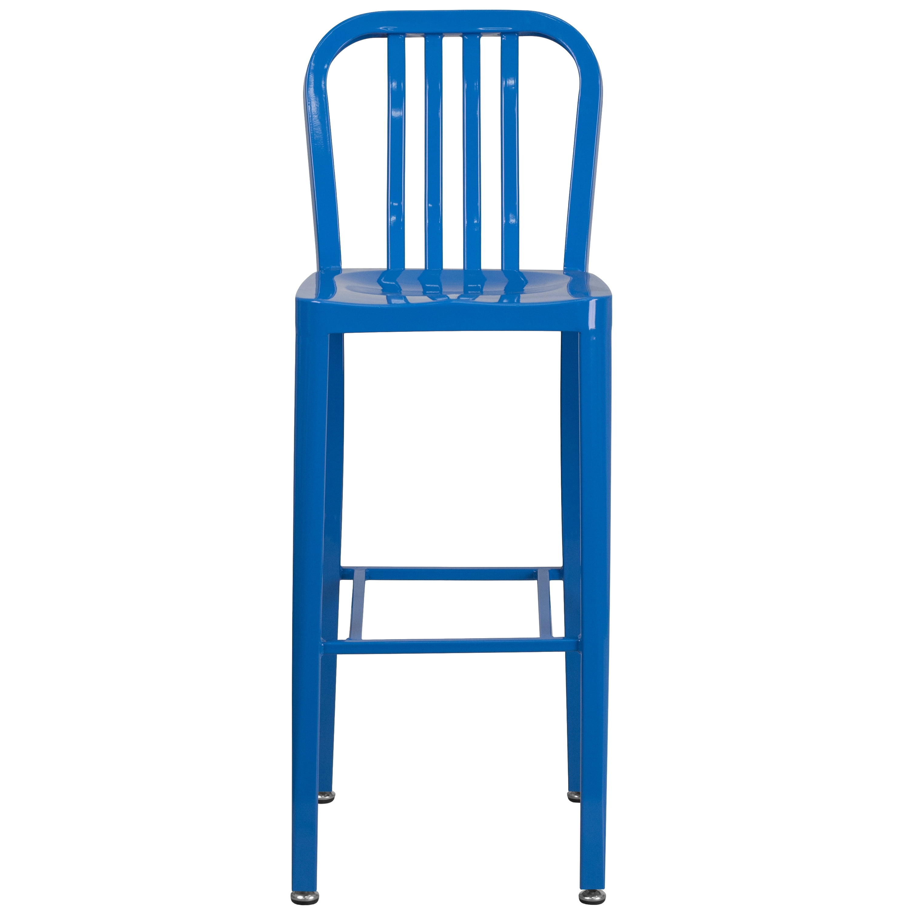 Invite family and friends over to hang out at your home bar or around your kitchen island on these comfortable colorful metal dining stools. Bring outdoors to enjoy the warm weather on your patio while sitting around your bar height patio table. The versatile 30″ bar stool will look great in any environment: kitchen, restaurants, bars, bistros, or your local greasy spoon. If you’re looking for a trendy stool for your restaurant that will hold its style throughout the years, this colorful restaurant bar stool will not disappoint. Crafted from durable galvanized steel metal upgradeed in a glossy finish, this blue metal stool with back was designed to withstand regular use in the fast-paced restaurant industry. Patrons have a suitable resting place for their feet for comfort if your bar or bar height table doesn’t include a footrest. Uneven floors are no problem with adjustable screw leveling floor glides. Pair these kitchen stools with our matching blue metal chairs and counter height bar stools to have seating at your dining table, kitchen island and home bar. Coordinate the seating in your restaurant with the same style of seating at your bar and restaurant tables. These bar chairs can be used year-round outside, for longevity protect the frame from long periods of wet weather.