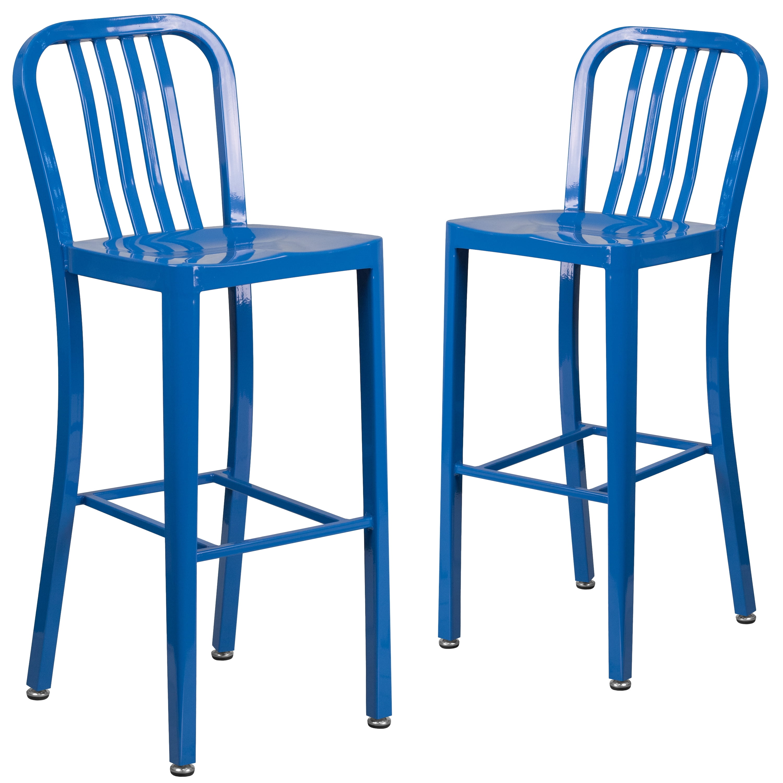 Set of 2 Industrial Modern Bar Stools 500 lb. Static Weight Capacity Curved Vertical Slat Back Ergonomic Contoured Seat Galvanized Steel Construction Blue Powder Coated Frame Finish Screw Leveling Floor Glides Designed for Indoor or Outdoor Use Designed for Commercial or Residential Use