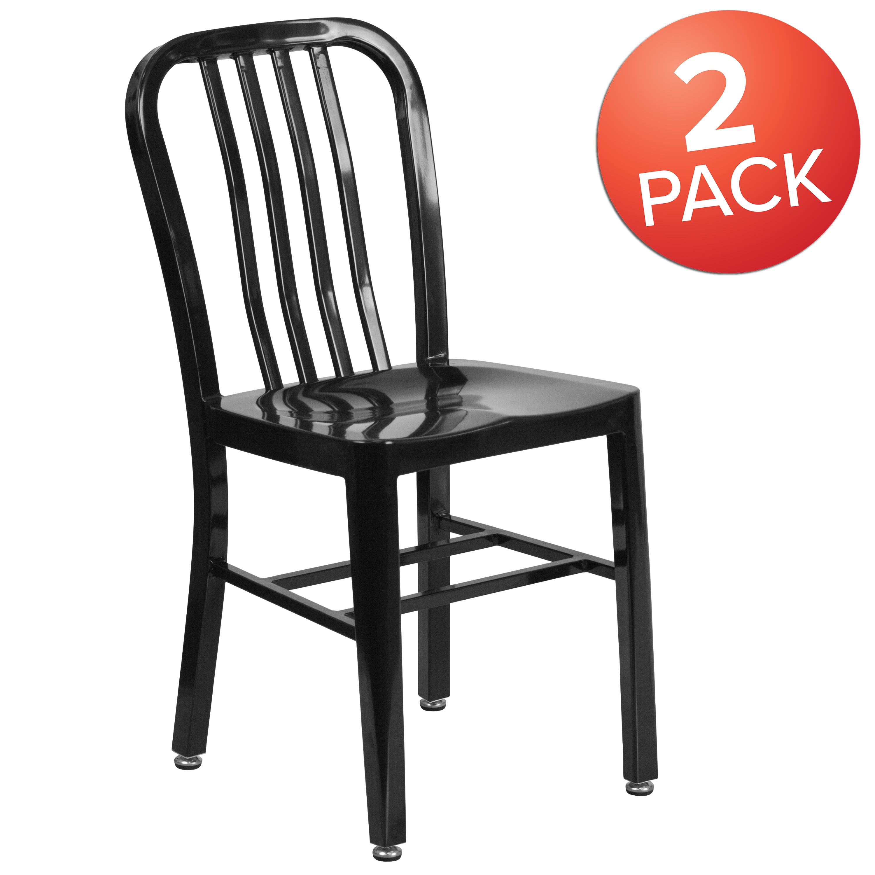 Set of 2 Industrial Modern Chairs 500 lb. Static Weight Capacity Curved Vertical Slat Back Ergonomic Contoured Seat Galvanized Steel Construction Black Powder Coated Frame Finish Screw Leveling Floor Glides Designed for Indoor or Outdoor Use Designed for Commercial or Residential Use