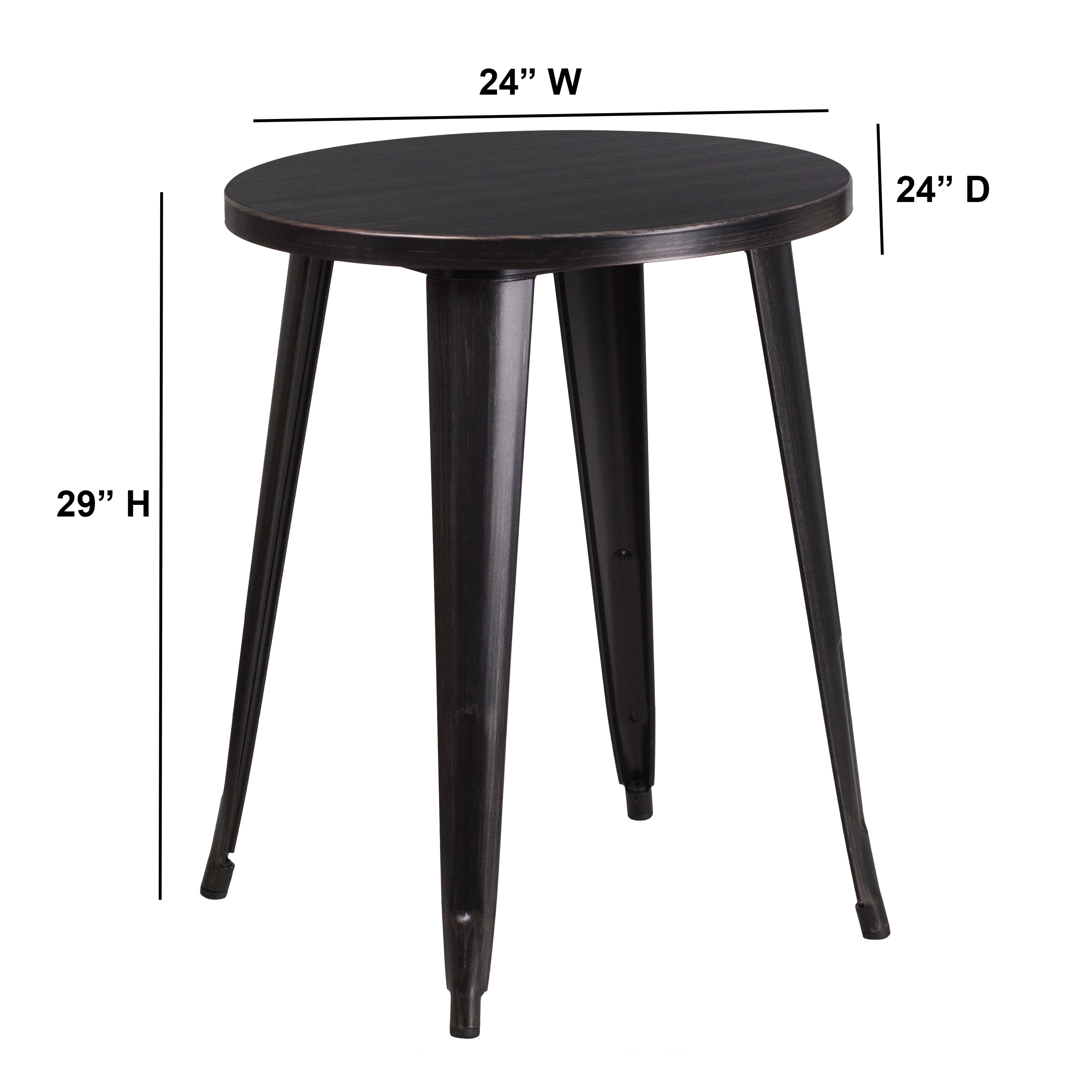 Metal Cafe Table Top Size: 24″ Round Base Size: 20″W Smooth Top with 1.25″ Thick Edge Black-Antique Gold Powder Coat Finish Brace underneath top provides extra stability Protective Rubber Floor Glides Designed for Indoor and Outdoor Use Designed for Commercial and Residential Use PRODUCT MEASUREMENTS: Overall Size: 24″W x 24″D x 29″H