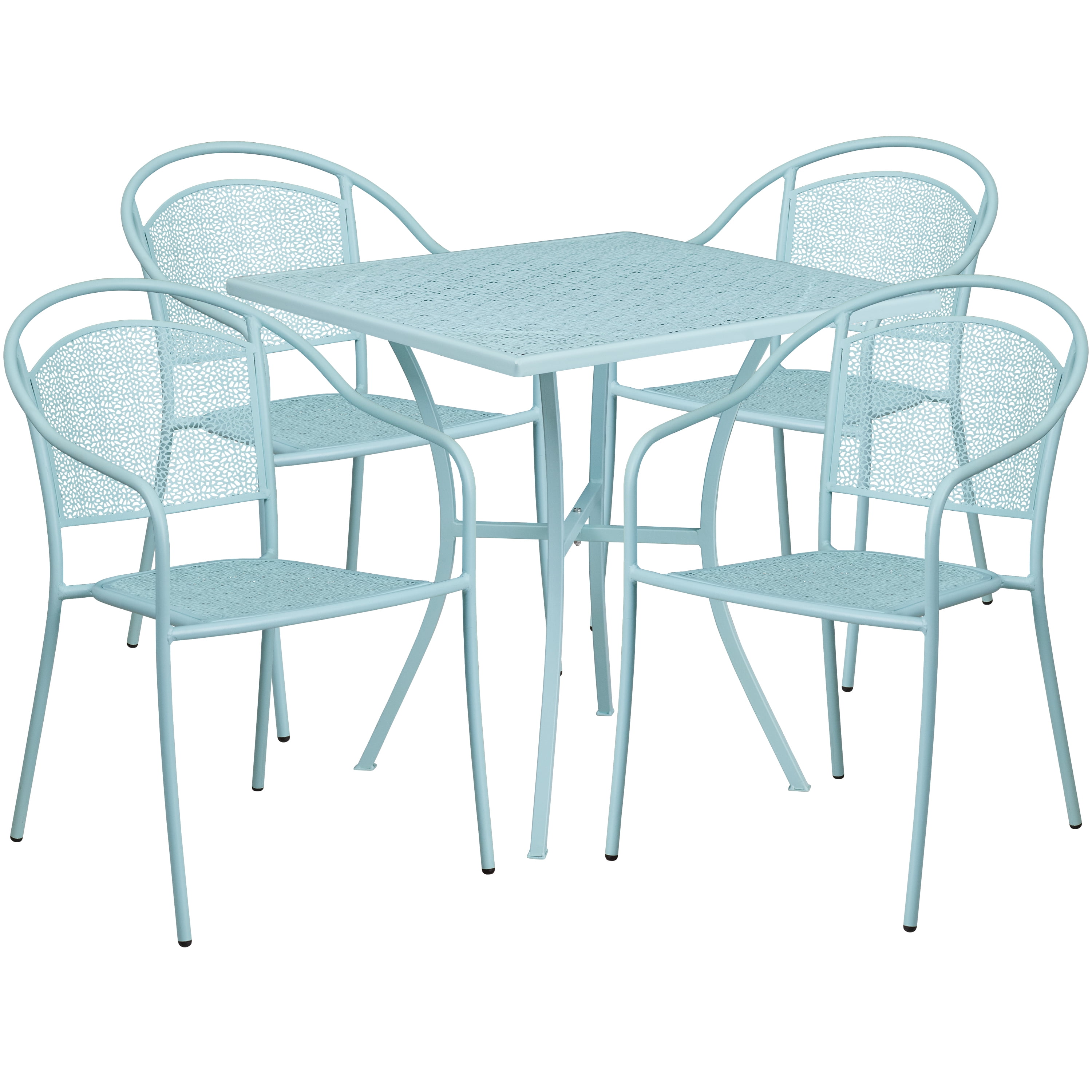 Flash Furniture Commercial Grade 28″ Square Sky Blue Indoor-Outdoor Steel Patio Table Set with 4 Round Back Chairs