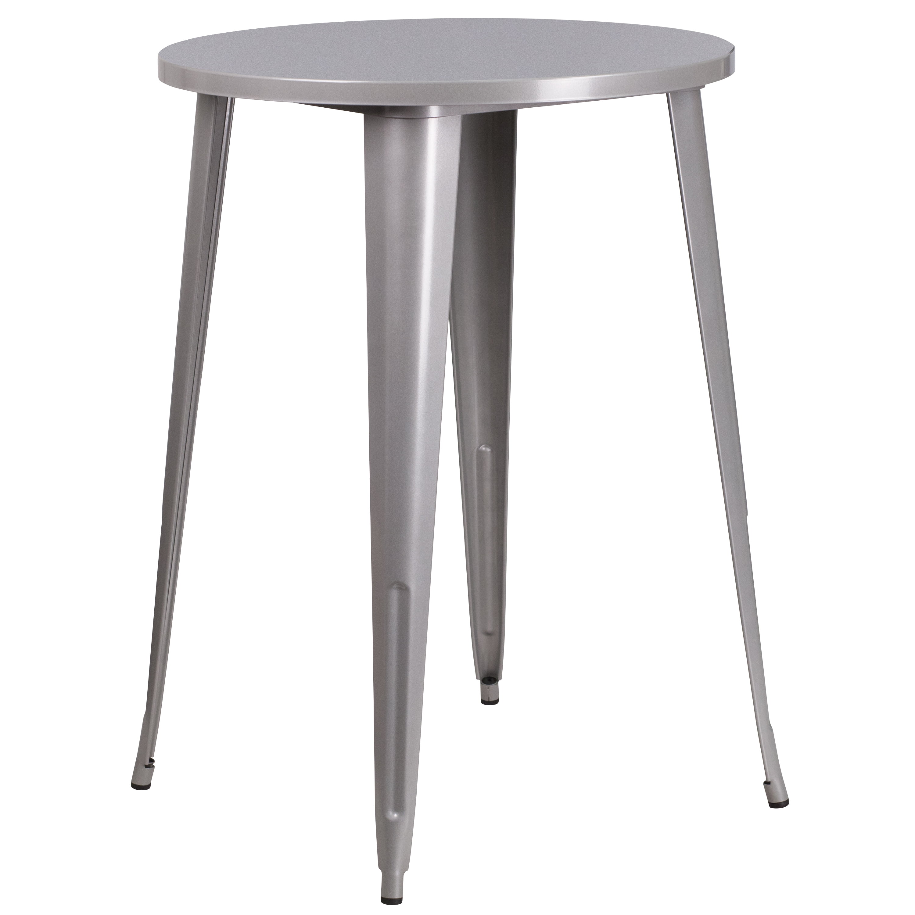 Bar Height Table and Stool Set Set Includes Table and 4 Stools Silver Powder Coat Finish Designed for Indoor and Outdoor Use Designed for Commercial and Residential Use Metal Cafe Bar Table Top Size: 30″ Round 1.25″ Thick Edge Top Brace underneath top provides extra stability Protective Rubber Floor Glides Table Size: 30″W x 30″D x 41″H Base Size: 26″W Bistro Style Barstool 500 lb. Weight Capacity Stacks up to 8 Chairs High Curved Back with Vertical Slat Drain Holes in Seat Cross Brace under seat provides extra stability Footrest Protective Rubber Floor Glides Chair Size: 17.75″W x 20″D x 45.25″H Back Size: 17.75″W x 16.25″H Seat Size: 12″W x 12″D x 30.25″H