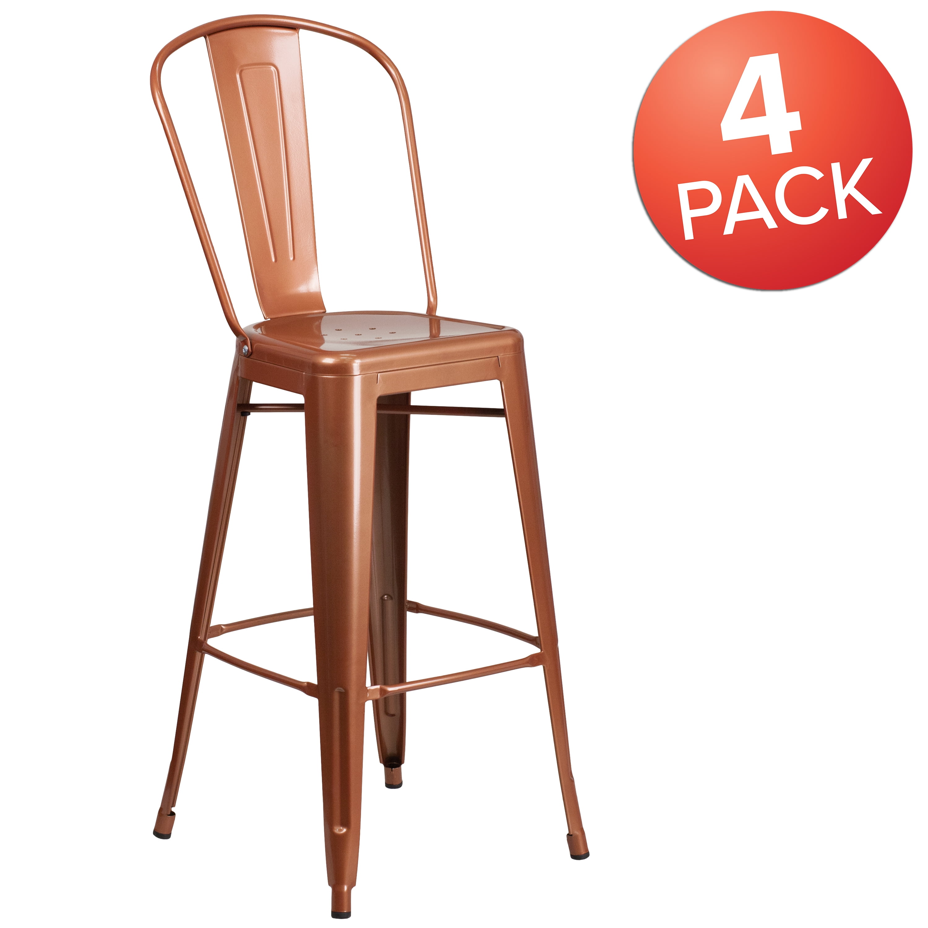 Set of 4 Bistro Style Metal Bar Stools 500 lb. Weight Capacity Curved Back with Vertical Slat Seat Drain Holes assist in drying, Seat Size: 14″W x 14″D Cross Brace under seat provides extra stability, Footrest Floor Protector Rubber Glides Powder Coated Frame Finish, Small Caps on cross brace protect finish when stacked Lightweight Design Designed for Indoor or Outdoor Use Designed for Commercial or Residential Use