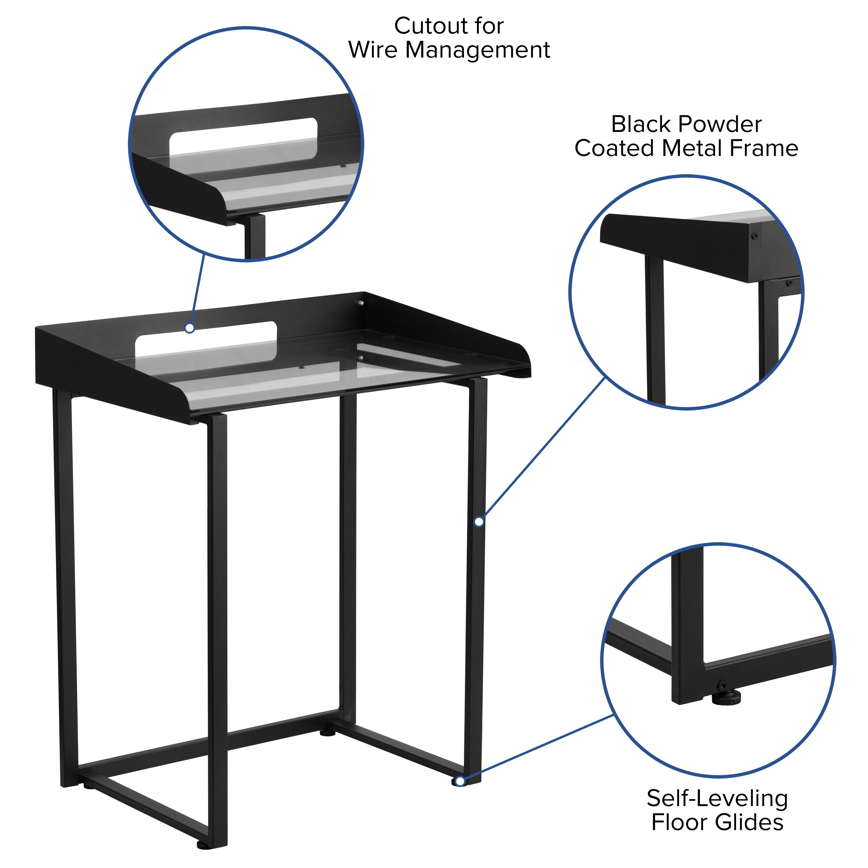 Looking for a solution for your lack of workspace? This compact workstation for small spaces like dorm rooms, condos and loft apartments is your answer. This contemporary desk with clear tempered glass and black frame provides a stylish surface to complete that term paper or business proposal. The clear, tempered glass surface is framed on three sides by short, vertical barriers to prevent papers or other objects from sliding off the back or sides. A cutout in the back barrier provides an outlet to route cables and cords out of your way, and the smooth, powder coated finish protects the frame from scratches. Self-leveling floor glides keep the desk from wobbling on uneven floor surfaces and protect your floor by sliding smoothly when you need to move it. When you have limited room and need to maximize your home, school or office space, this stylish little desk is a great option.