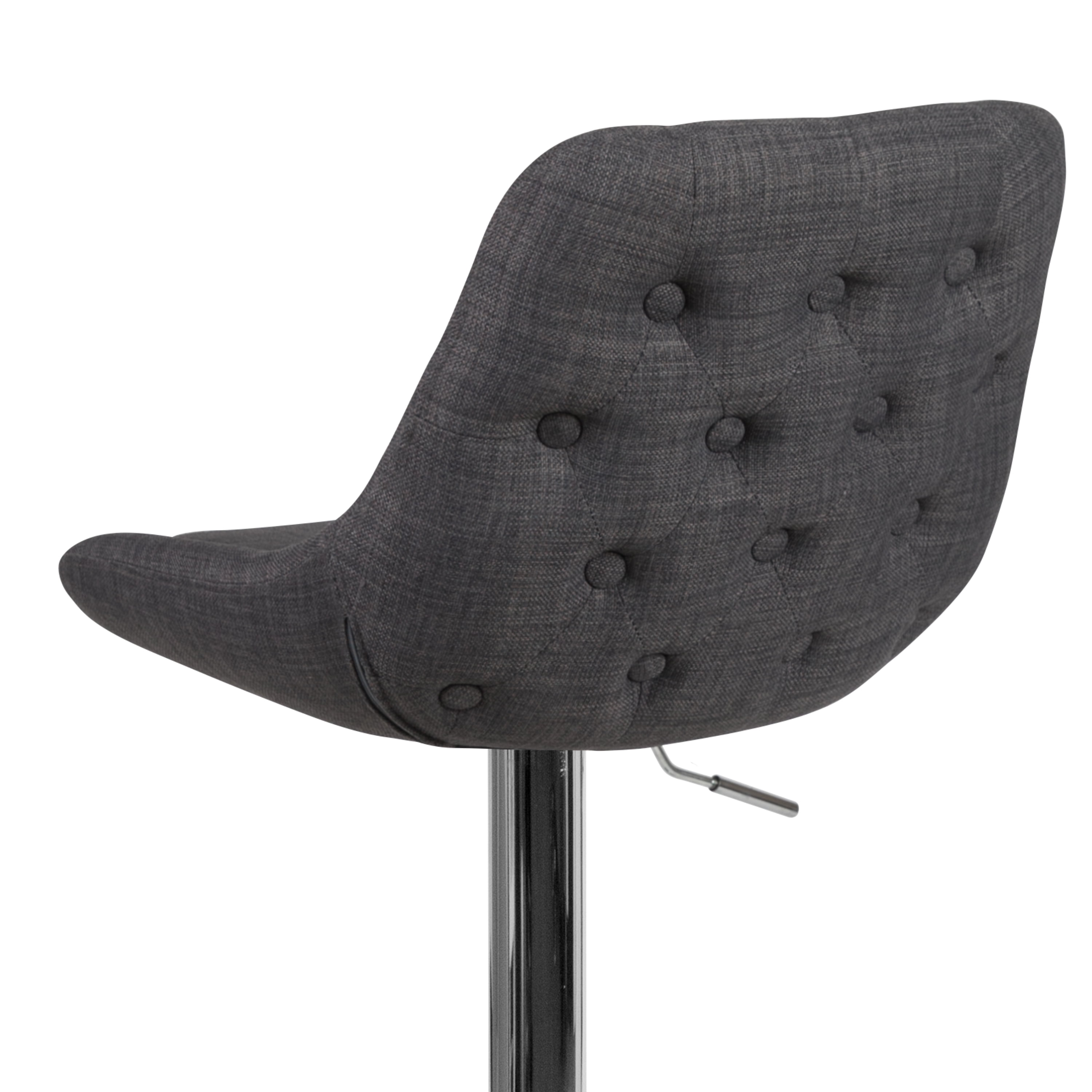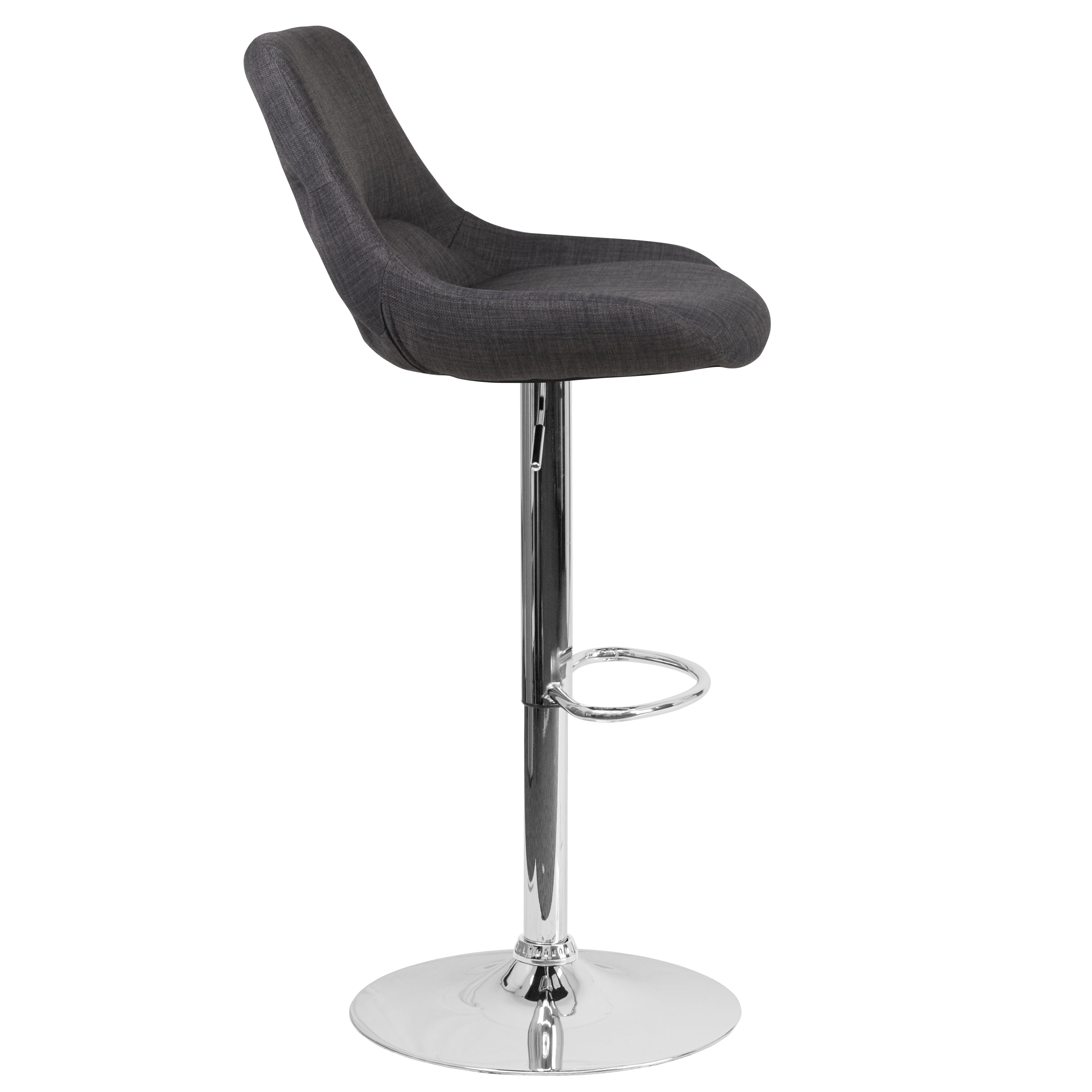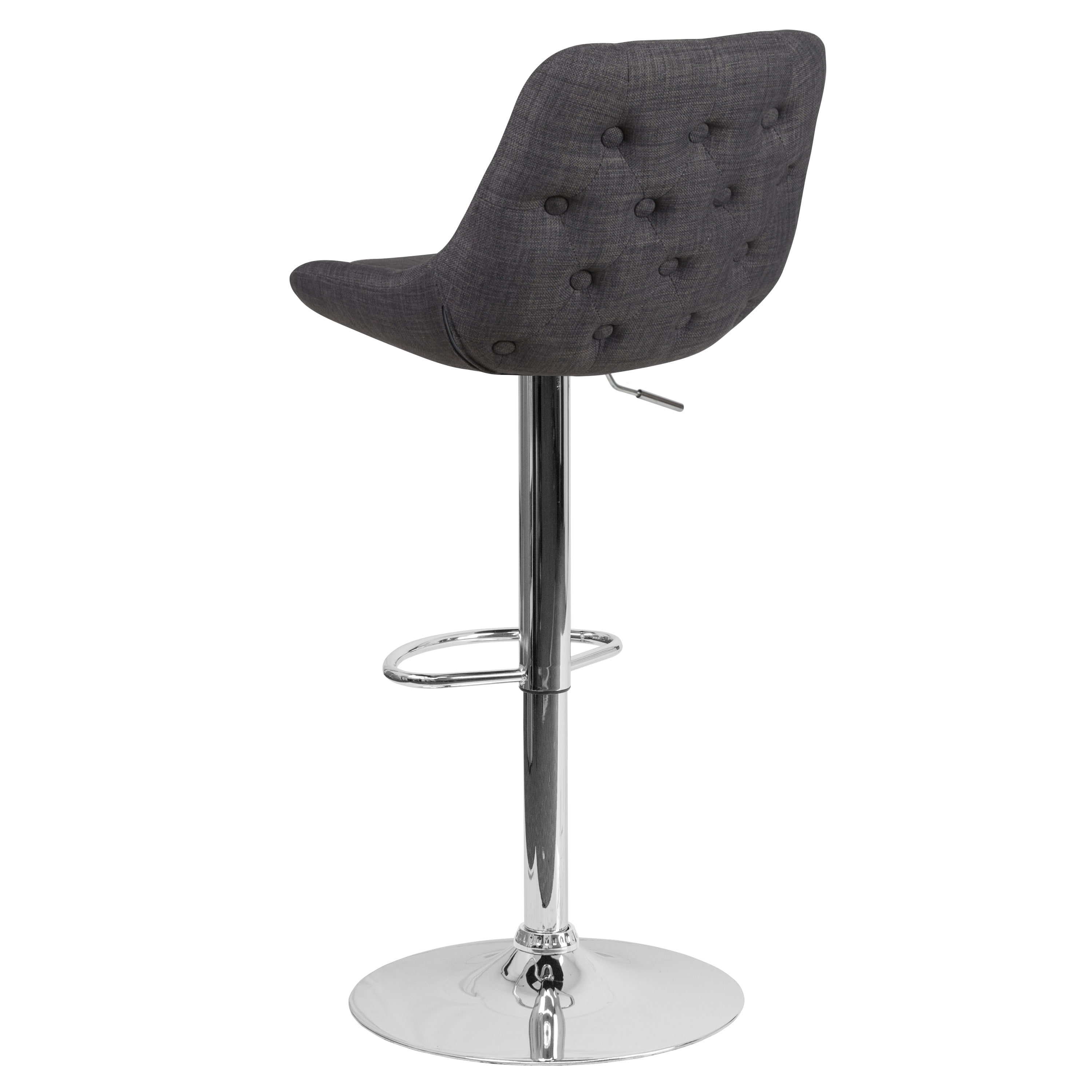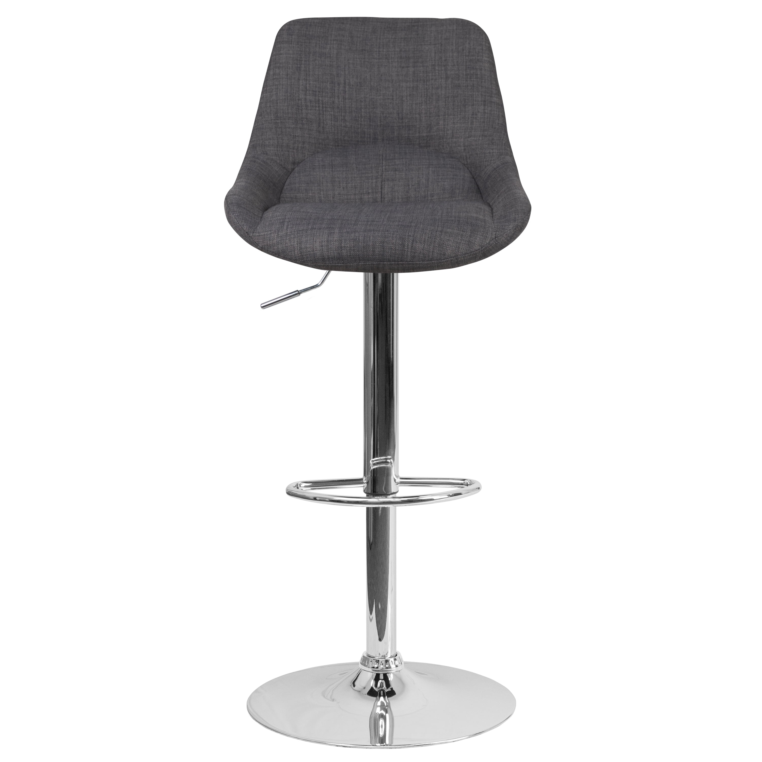 Flash Furniture Contemporary Dark Gray Fabric Adjustable Height Barstool with Chrome Base Contemporary Style Stool Full Back Support with Support Pillow Dark Gray Fabric Upholstery Padded Seat with CAL 117 Fire Retardant Foam 360 Degree Swivel Seat Gas Lift Seat Adjusts from Counter to Bar Height Footrest provides better sitting experience 17.75″ Round Chrome Base Designed for Residential Use Only PRODUCT MEASUREMENTS: Overall Size: 19″W x 22.5″D x 36.5-44.5″H; Seat Size: 14″W x 14.5″D x 25.5-33.5″H; Back Size: 14-18″W x 13″H