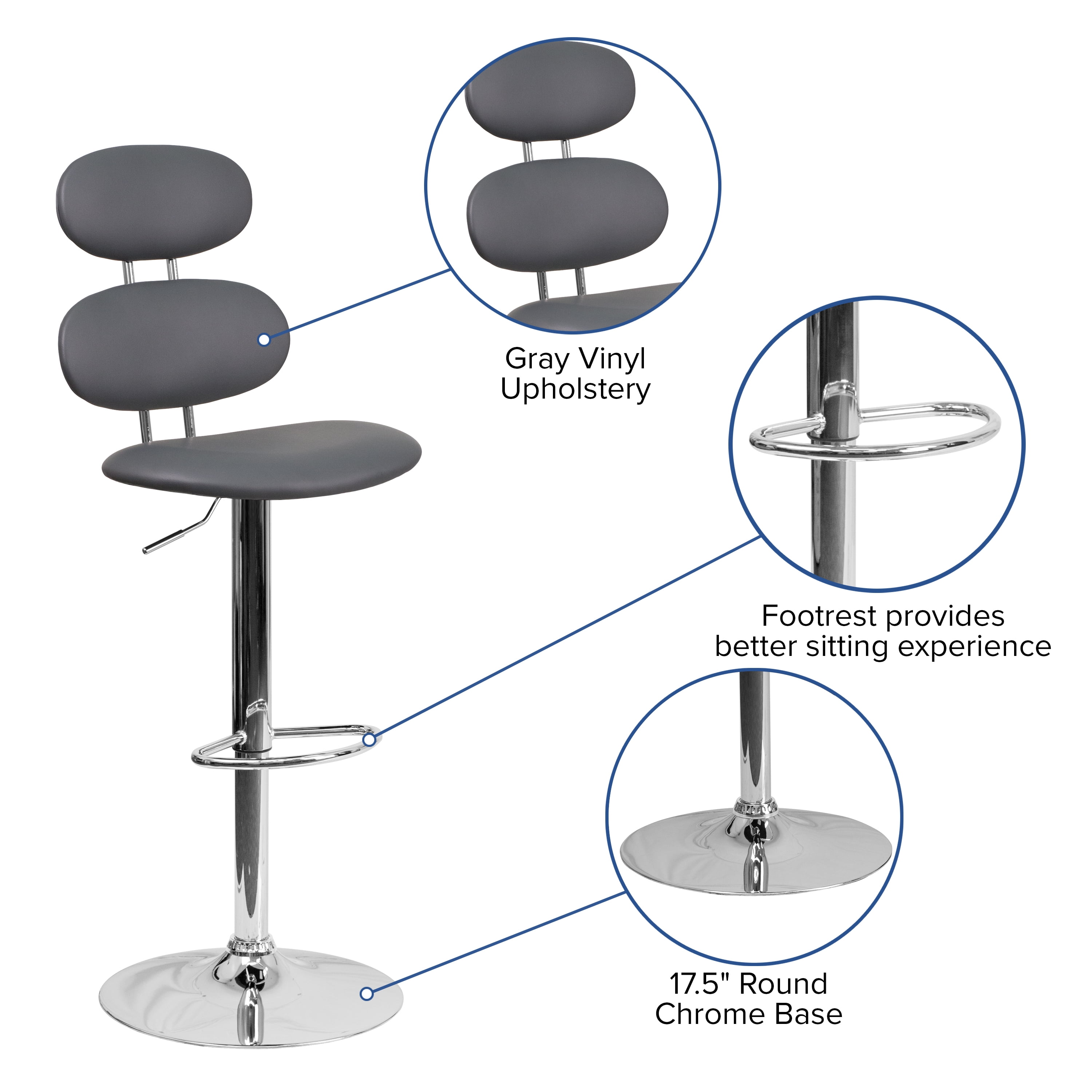 Retro-Contemporary Adjustable Swivel Bar Stool Full Back Support Gray Vinyl Upholstery Ellipse Back Design Padded Seat with CAL 117 Fire Retardant Foam 360 Degree Swivel Seat Gas Lift Seat adjusts from Counter to Bar Heights Footrest provides better sitting experience 17.625″ Round Chrome Base Designed for Residential Use Only
