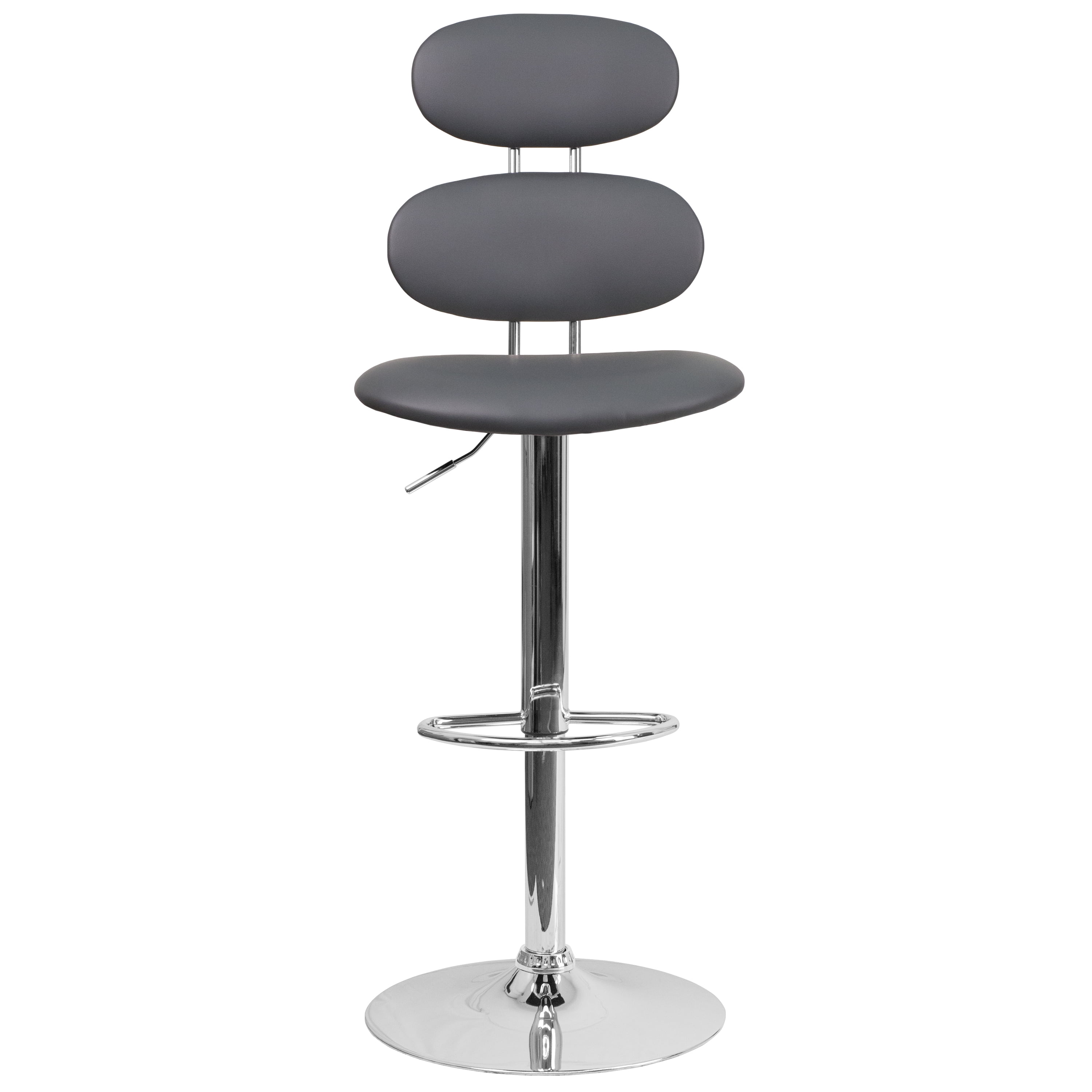 Be the trendsetter in your neighborhood and give your home decor that “wow” factor with this must have gray adjustable height bar stool. The uniquely designed ellipse back gives this stool a retro look and also provides full back support. The easy to clean vinyl upholstery is an added bonus when stool is used regularly. The height adjustable swivel seat adjusts from counter to bar height with the handle located below the seat. The chrome footrest supports your feet while also providing a contemporary chic design. To help protect your floors, the base features an embedded plastic ring.