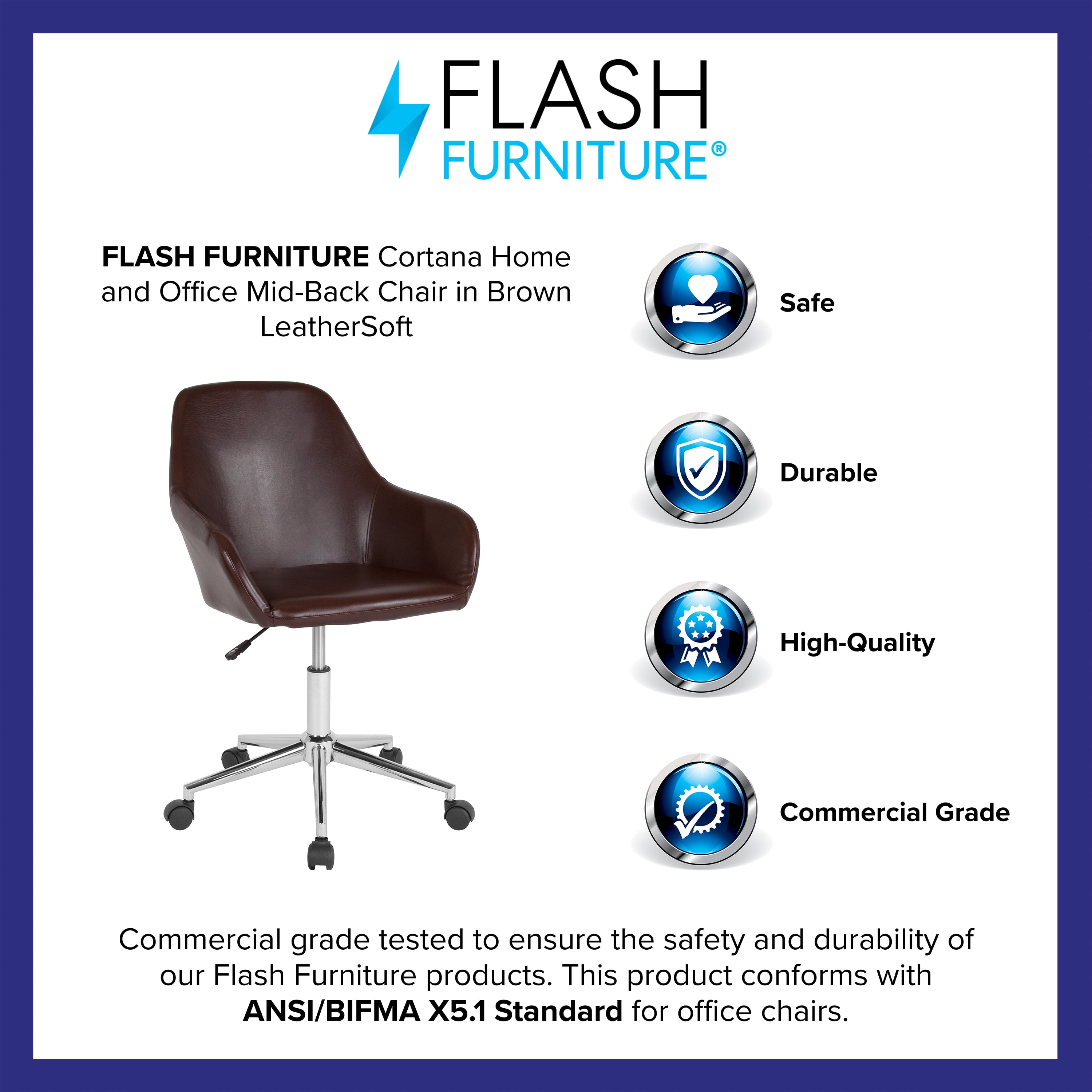 Contemporary Task Office Chair Brown LeatherSoft Upholstery Mid-Back Design CAL 117 Fire Retardant Foam Swivel Seat Pneumatic Seat Height Adjustment Integrated Flared Arms Heavy Duty Chrome Base Dual Wheel Casters LeatherSoft is leather and polyurethane for added Softness and Durability