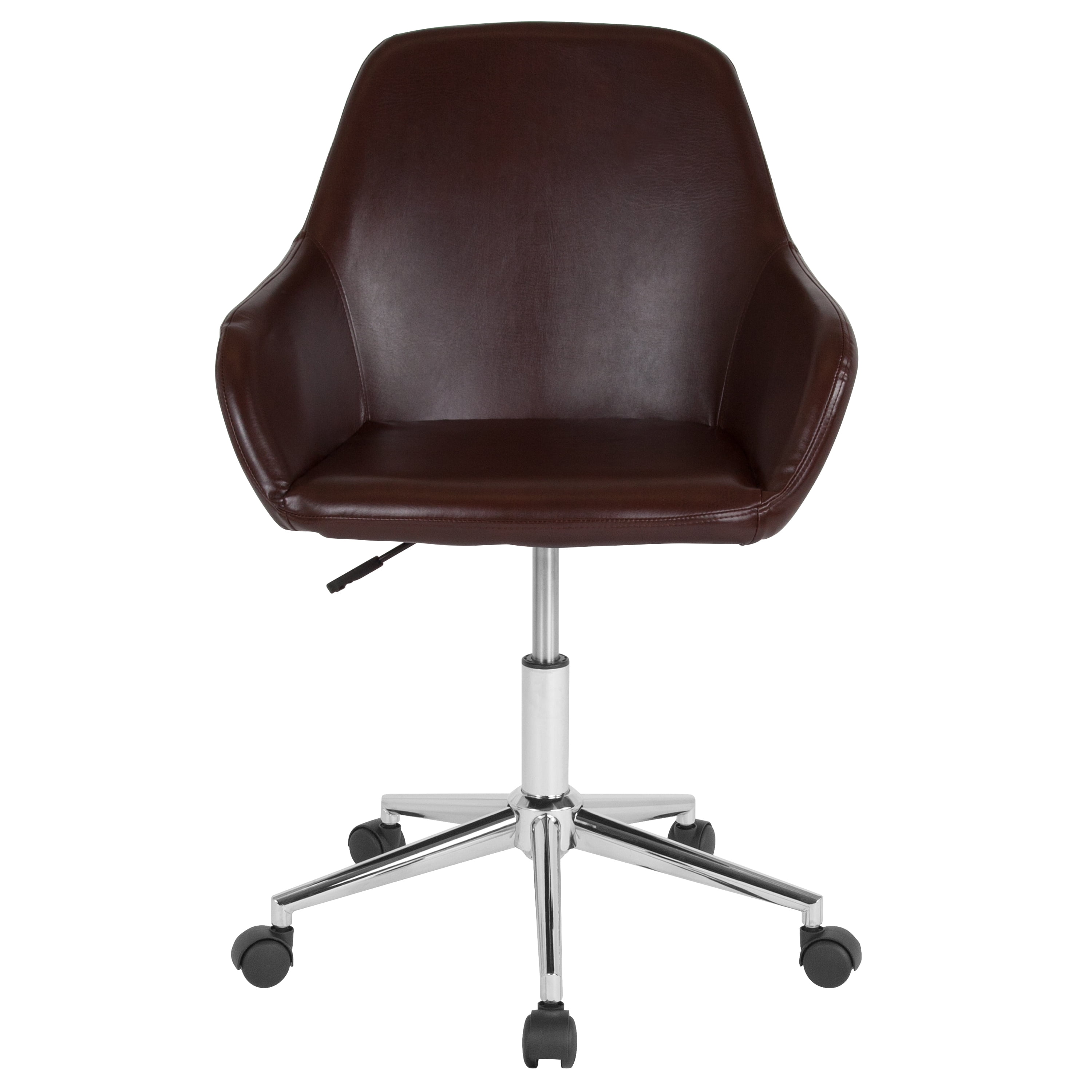 Reminiscent of an earlier time, the classic style of this bucket type task chair will always be popular. This chair boasts stylish integrated flared arms and brown LeatherSoft upholstery. LeatherSoft is leather and polyurethane for added softness and durability. This chair is ideal for those who spend the bulk of their day seated because of the mid back support that it offers to the mid to upper back region. Chair rotates 360 degrees to provide easy access to all of your work surfaces. A pneumatic seat height adjustment lever lets you easily position the chair at a height that is most comfortable for you. The chrome base provides a modern finish to this sophisticated versatile home or office chair. This retro-modern office chair is a great choice to complete the look in any office, reception, conference room or home office.