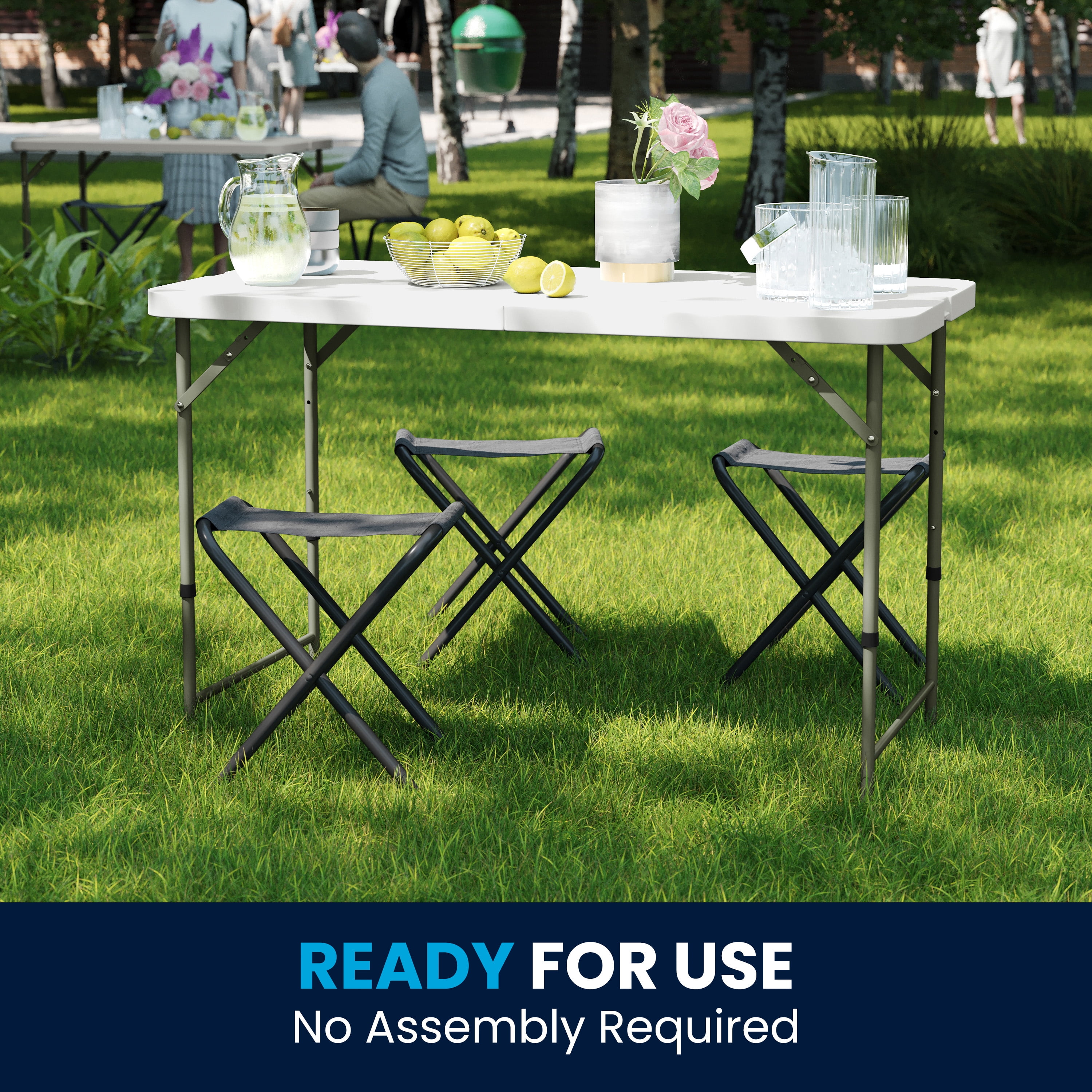 Ensure you have enough surface space for any function and take the stress out of hosting your next gathering. This set of 5 rectangular bi-fold adjustable height tables are 4 feet long each and are beneficial in a multitude of settings that include banquet halls, conference centers, cafeterias, and schools. Use as a temporary seating solution or setup for everyday use. These plastic folding tables comfortably seat up to four adults each while ensuring plenty of legroom. Speed up the time it takes to set-up and tear-down wedding receptions, graduation parties, banquets, buffets and other events with this folding table. Whether you’re hosting an indoor or outdoor gathering, the smooth design is easy to wipe clean. Store indoors to protect the frame from extreme moisture. The table legs fold under for storage and provide better portability. These tables are commercial grade to withstand everyday use in the hospitality industry.
