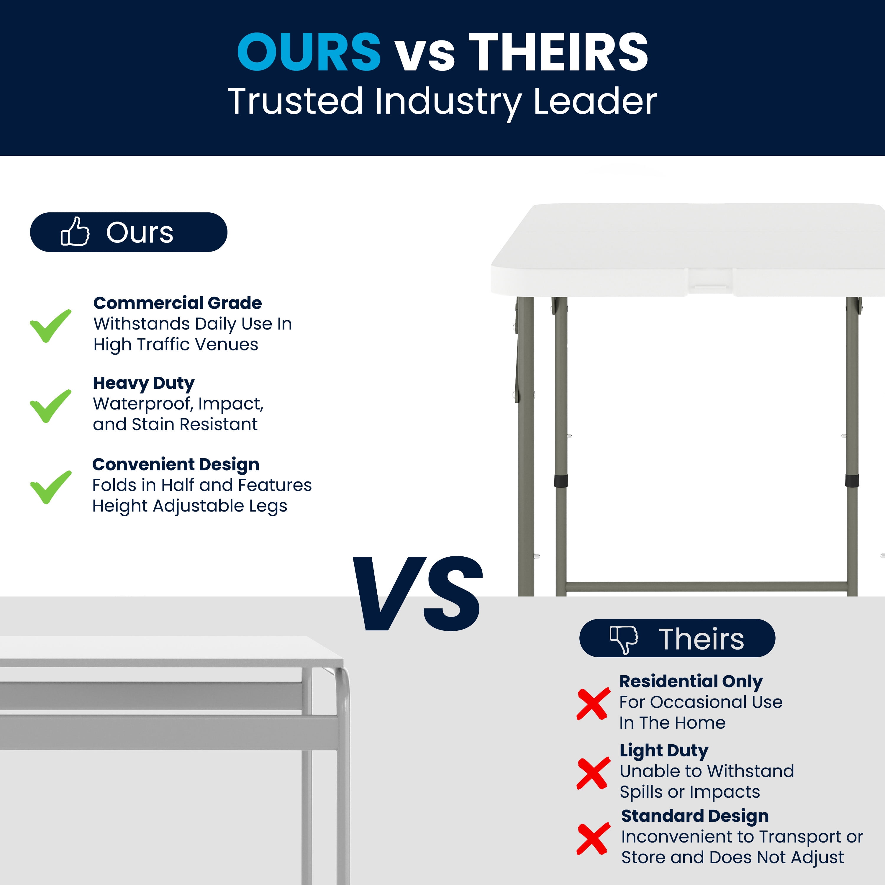 Flash Furniture Elon 4-Foot Height Adjustable Bi-Fold Granite White Plastic Folding Table – Set of 5 Set of 5 Ready To Use Adjustable Height Commercial Tables 4′ Folding Tables Seats up to 4 Adults Per Table 330 lb. Static Load Capacity Per Table 1.5″ Thick Granite White Tops are waterproof, impact and stain resistant Folds in half for storage and travel Includes convenient carrying handle Frames adjust 6.25″ to accommodate various seat heights Gray Powder Coated Locking Legs with protective floor caps, fold underneath top for flat storage No Assembly Required; Designed for Indoor and Outdoor Use PRODUCT MEASUREMENTS: Overall Size (5): 23.75″W x 47.75″D x 23-29.25″H; No Assembly Required