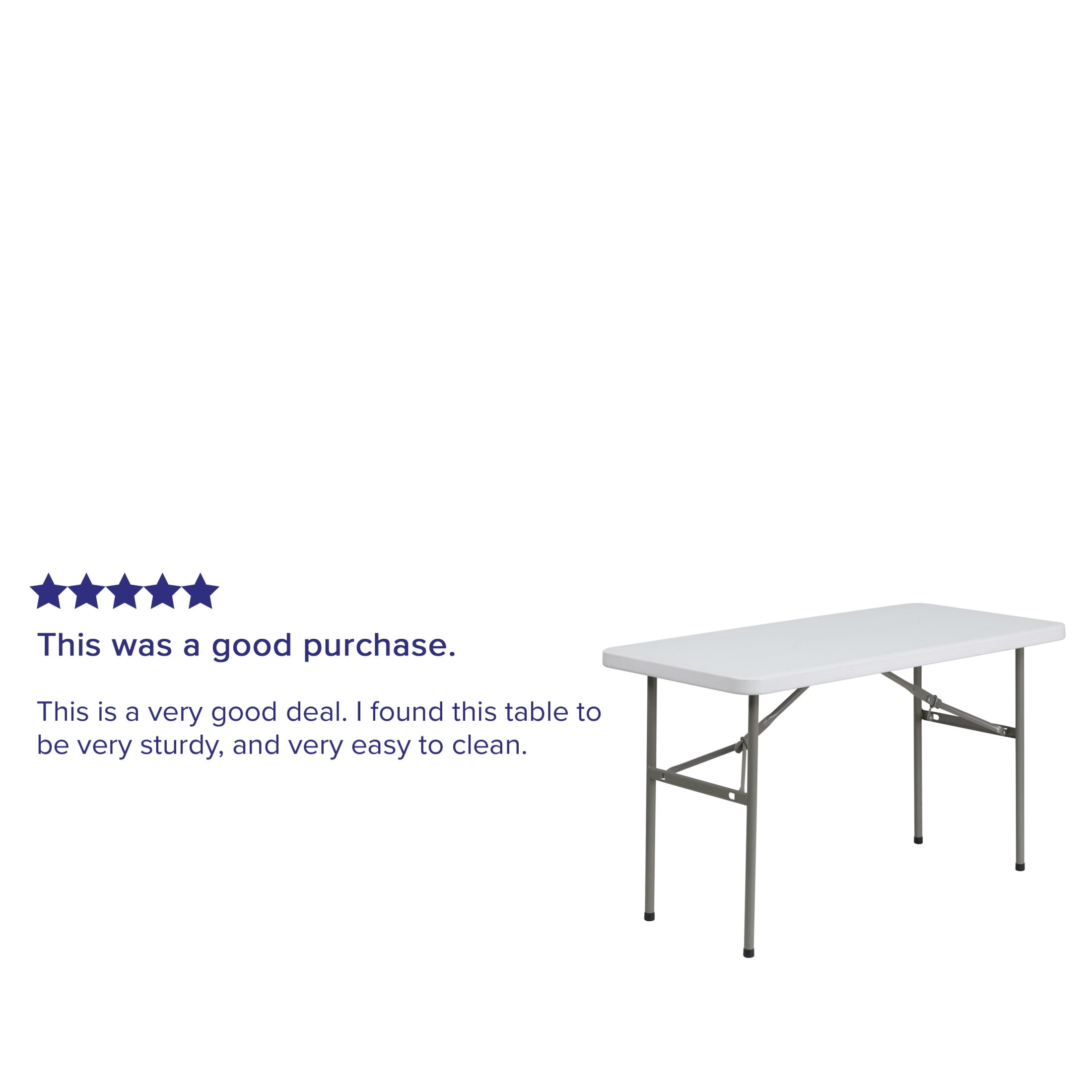 Flash Furniture Elon 4′ Rectangular All-Occasion Plastic Event Folding Table, White Comfortably seats up to 4 adults at various indoor or outdoor events Convenient foldable design for easy transportation and storage Powder-coated locking legs with non-marring floor caps 1.75″ thick waterproof and impact and stain-resistant tabletop Can be used as is or dressed up with a tablecloth to achieve a custom look No assembly required; wipes down with a solvent and water-based cleaner Overall size: 24″ W x 48.25″ D x 29″ H; Supports up to 330 lbs. of static weight Easy to clean – wipe down with a solvent and water-based cleaner as needed Supports up to 330 lbs. of static weight Overall size: 24″W x 48.25″D x 29″H NO ASSEMBLY REQUIRED: Supports up to 330 lbs. of static weight and measures 24″ W x 48.25″ D x 29″ H with no assembly required, so you can start setting up for events right away