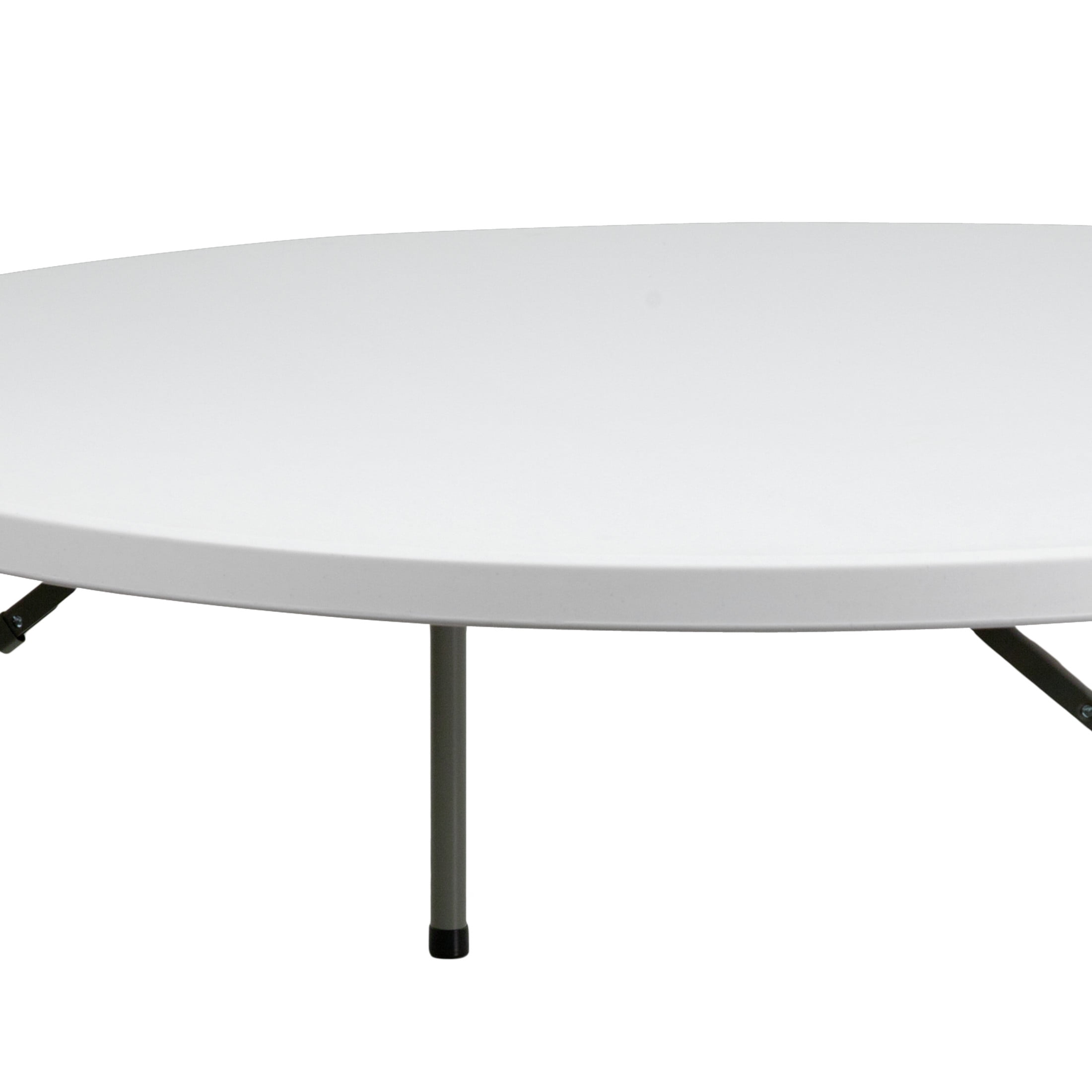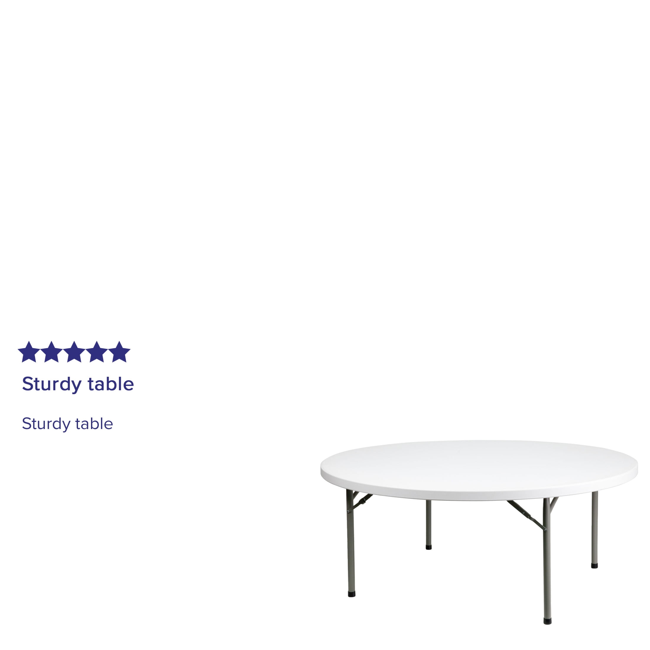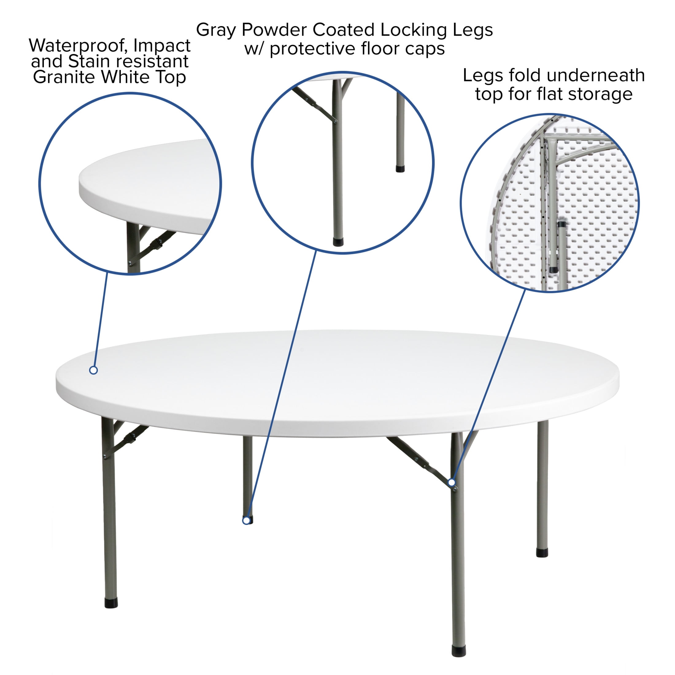 Flash Furniture Elon 6′ Round All-Occasion Plastic Folding Event Table, White Great for various indoor or outdoor home, school, or business events Comfortably seats up to 10 adults Convenient foldable design for easy transportation and storage Powder-coated locking legs with non-marring floor glides 2.125″ thick waterproof and impact and stain-resistant tabletop Can be used as is or dressed up with a tablecloth to achieve a custom look No assembly required Easy to clean – wipe down with a solvent and water-based cleaner as needed Supports up to 1,100 lbs. of static weight Overall size: 71″W x 71″D x 29″H NO ASSEMBLY REQUIRED: Supports up to 1,100 lbs. of static weight and measures 71″ W x 71″ D x 29″ H with no assembly required, so you can start setting up for events right away
