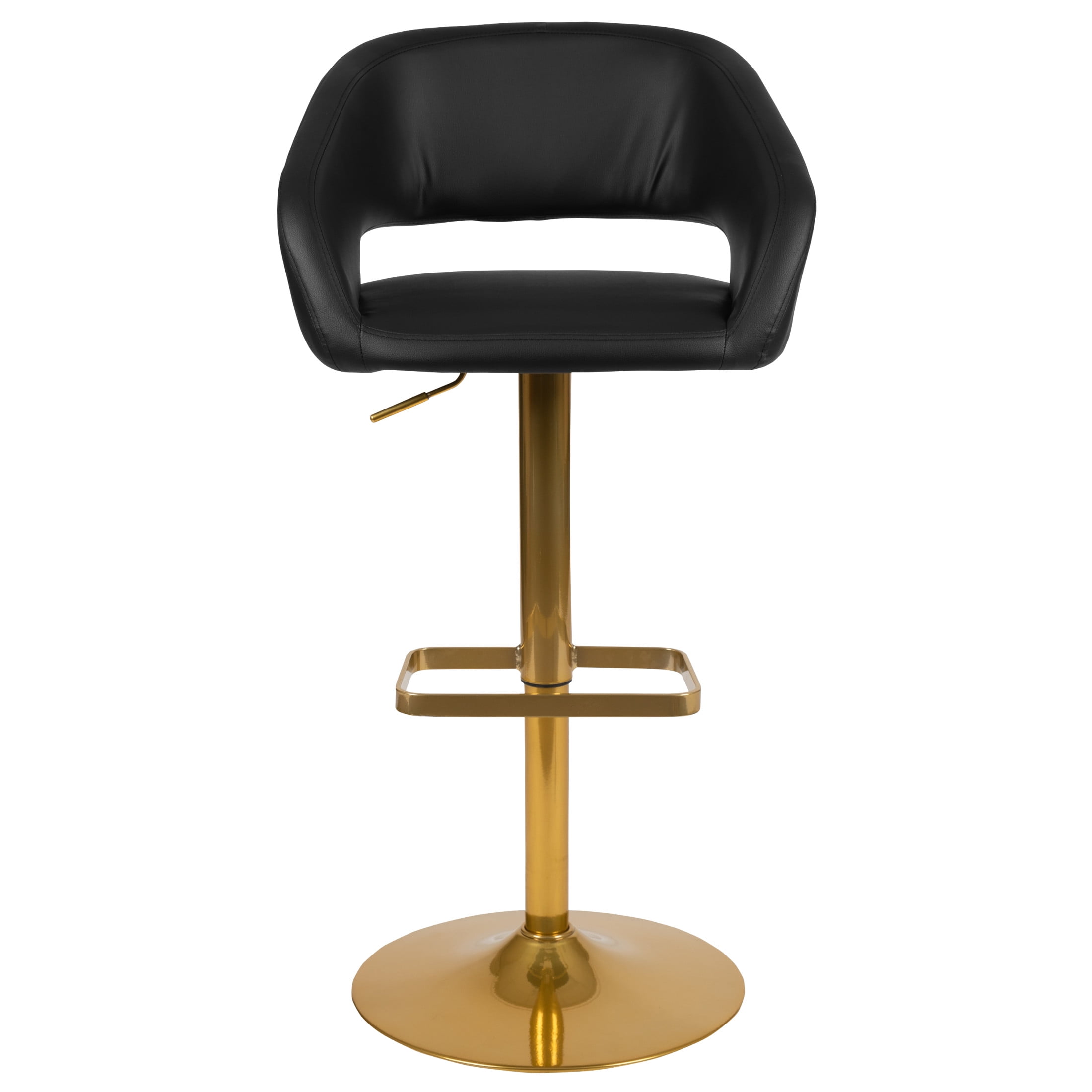 Flash Furniture Erik Contemporary Vinyl Barstool, Black Contemporary Adjustable Bar Stool Rounded Cutout Mid-Back Design Black Vinyl Upholstery Padded Seat with CAL 117 Fire Retardant Foam 360 Degree Swivel Seat Height Adjustable Seat with Gas Lift Seat Adjusts from Counter to Bar Height Footrest Provides Better Sitting Experience Trendy Gold Pedestal Base: 17.625″ Swivel barstool for kitchen island and home bar EASY TO ASSEMBLE: Measures 21″W x 20.5″D x 33.5-42″H with a 15″W x 16″D x 23.25-32″H seat size and 12″W x 11″H back size; easy to assemble with the included tools and step-by-step instructions
