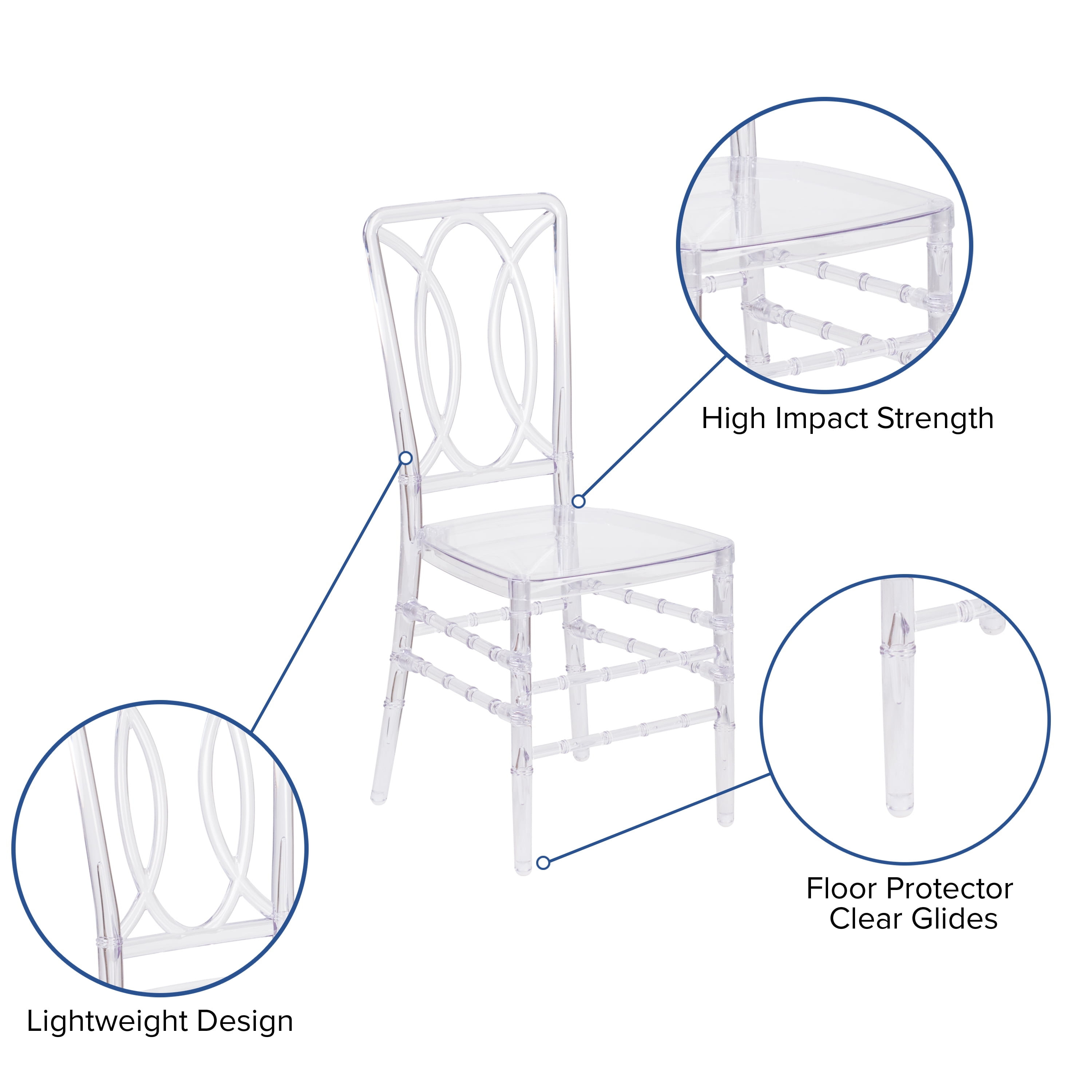 Commercial Grade Chiavari Seatingfor indoor and outdoor use Transparent Clear Ice Finish blends in any décor, gives the illusion of space in small areas Stack up to 10 High for floor maintenance, transport or storage Lightweight Design for easy movement Constructed of Ultra-Strong Polycarbonate and holds up to 800 lbs. to accommodate most users High Impact Strength reduces damage from accidental drops and scratches UV Resistant prevents fading when used for outdoor events Floor Protector Clear Glides alleviate damage to hard flooring surfaces Ships Fully Assembled for your convenience Unique event seating ideal for weddings, banquets and other special events or everyday use in your dining room