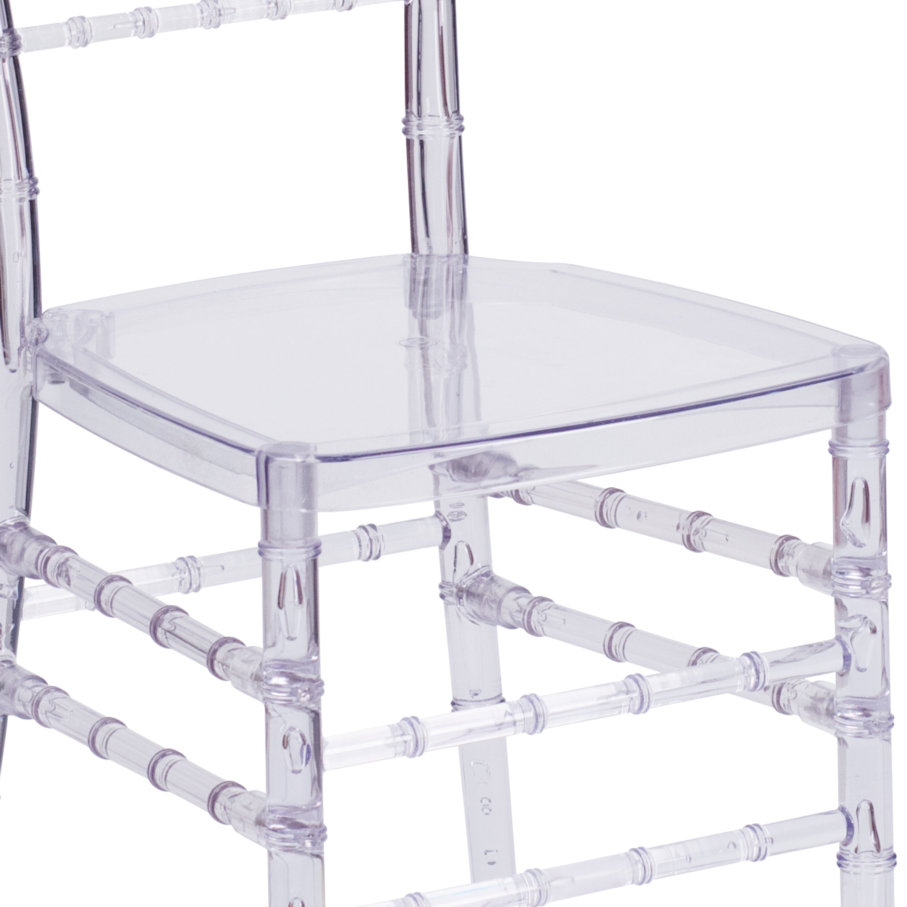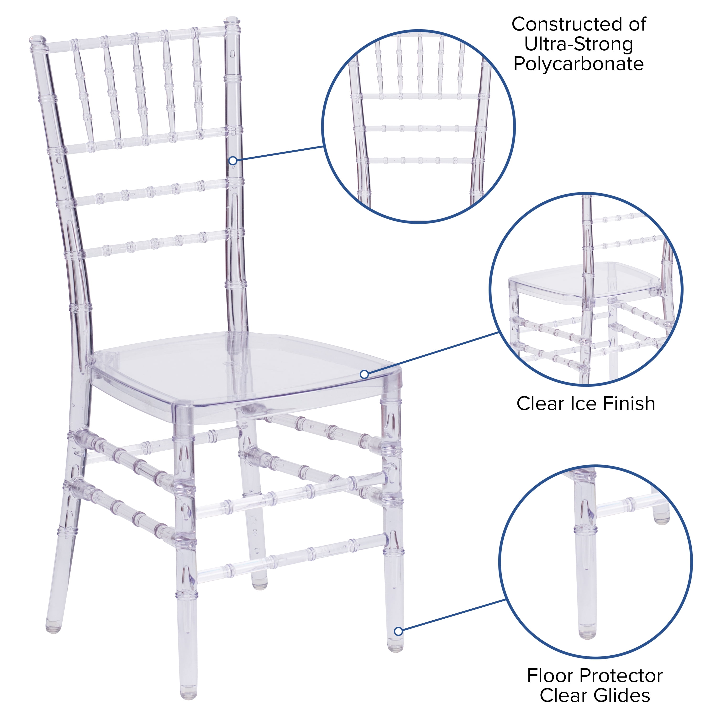 Transparent Chiavari Chair for Indoor or Outdoor Events 1100 lb. Weight Capacity Stack Quantity: 10 Lightweight frame constructed of Ultra-Strong Polycarbonate High Impact Strength, Low Temperature Resistant, Fireproof and Waterproof Floor Glides protect flooring while using indoors Ready to Use – Ships Fully Assembled Designed for Commercial Use 2 Year Limited Warranty on Frame Clear accent chair for dining room, kitchen, patio, banquet hall, wholesalers