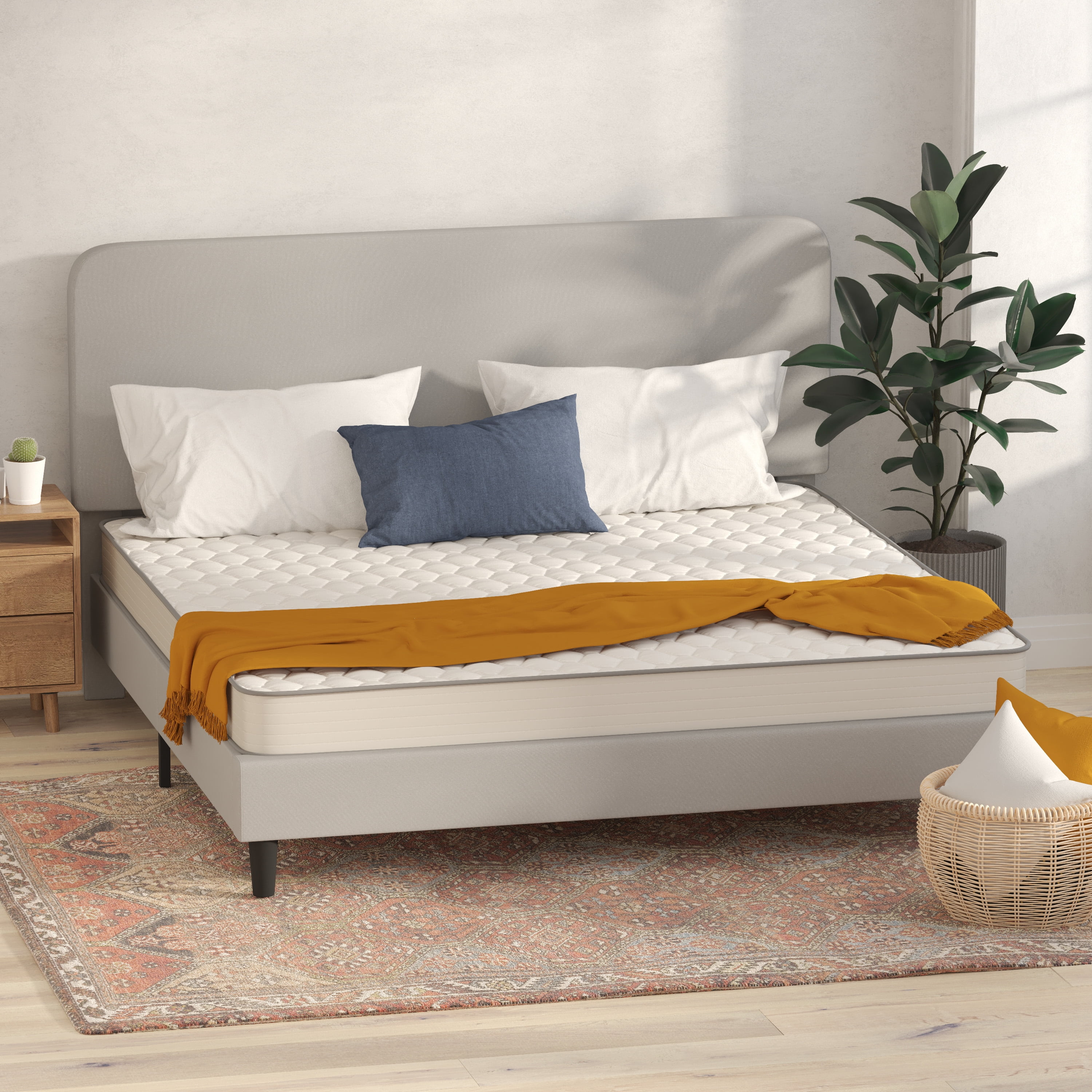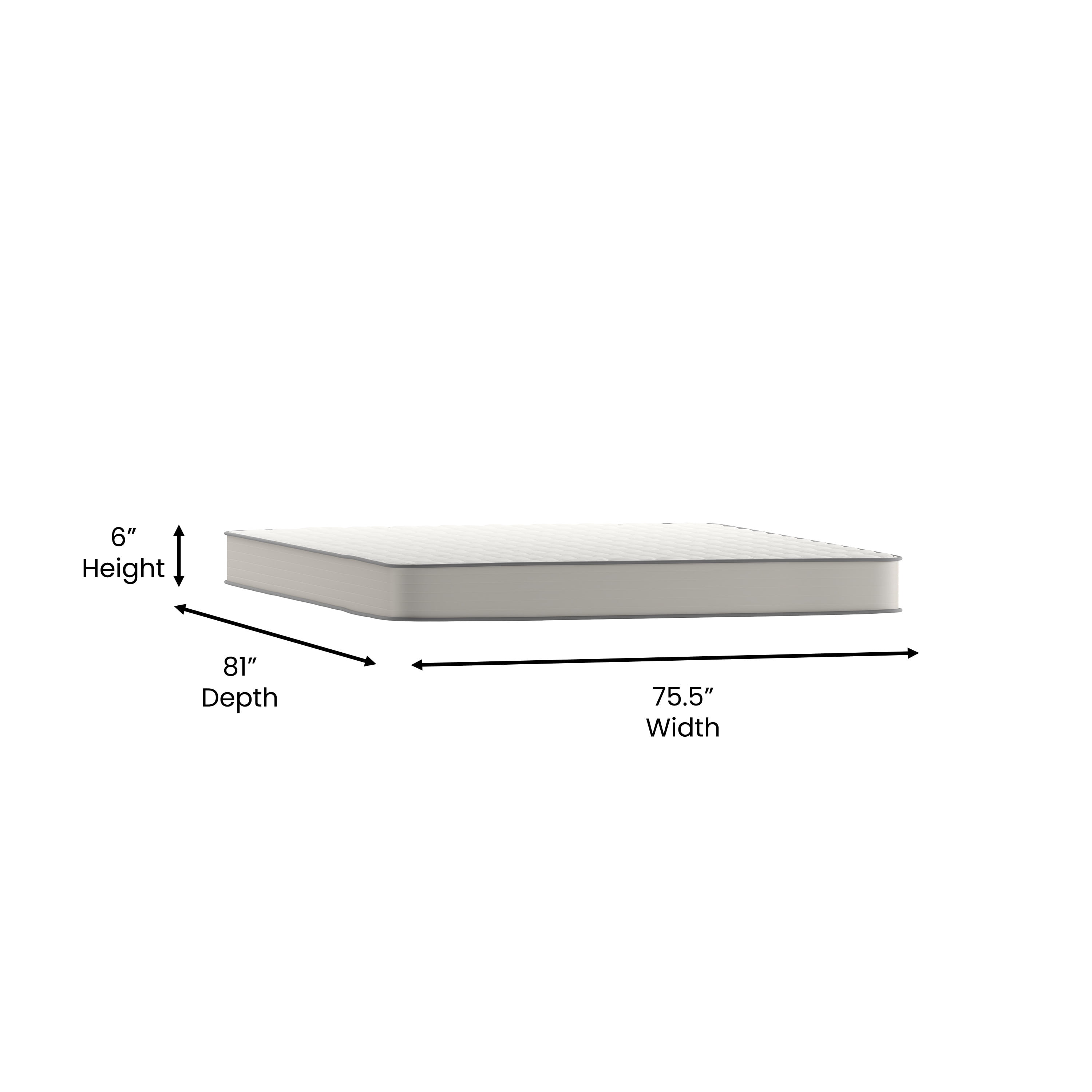 Flash Furniture Flash Furniture Capri Comfortable Sleep 6″ Medium Tight Top Hybrid Innerspring Mattress, King Hybrid Foam and Innerspring King Mattress in a Box Knitted Breathable Quilted Fabric Covering CertiPUR-US Certified High Density Foam Supportive Heavy Gauge Tempered Steel Innerspring Coils Designed for All Sleep Positions Fits Most Bed Frames with a Foundation or Slatted Supports Ideal for RV’s, Trundle Beds, Bunk Beds, Day Beds, and Adjustable Bed Frames Expertly Packed and Conveniently Delivered Compressed and Boxed For Easy Handling Please Allow 48-72 Hours for Complete Expansion PRODUCT MEASUREMENTS: Overall Size: 75.5″W x 81″D x 6″H; Limited Warranty Included; No Assembly Required