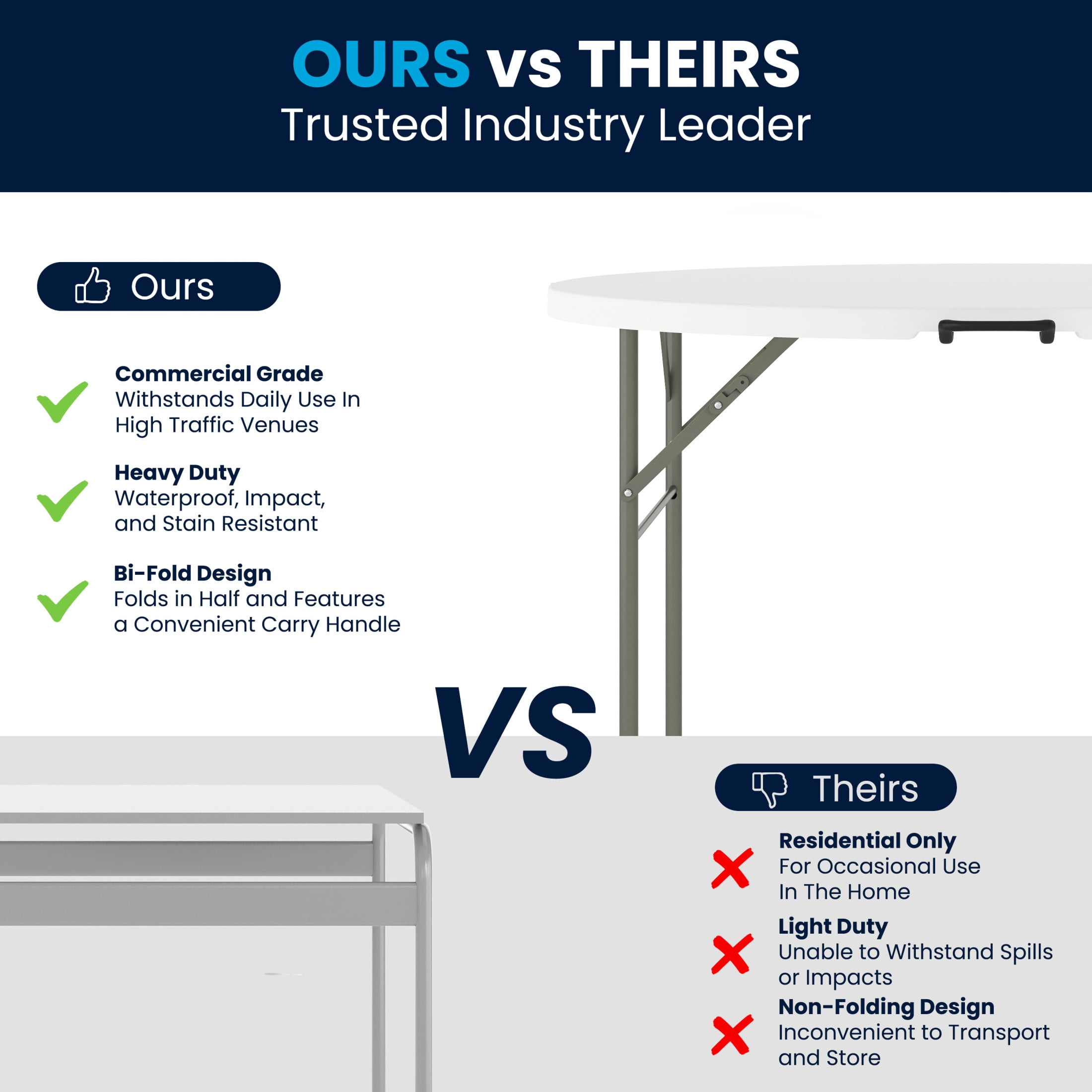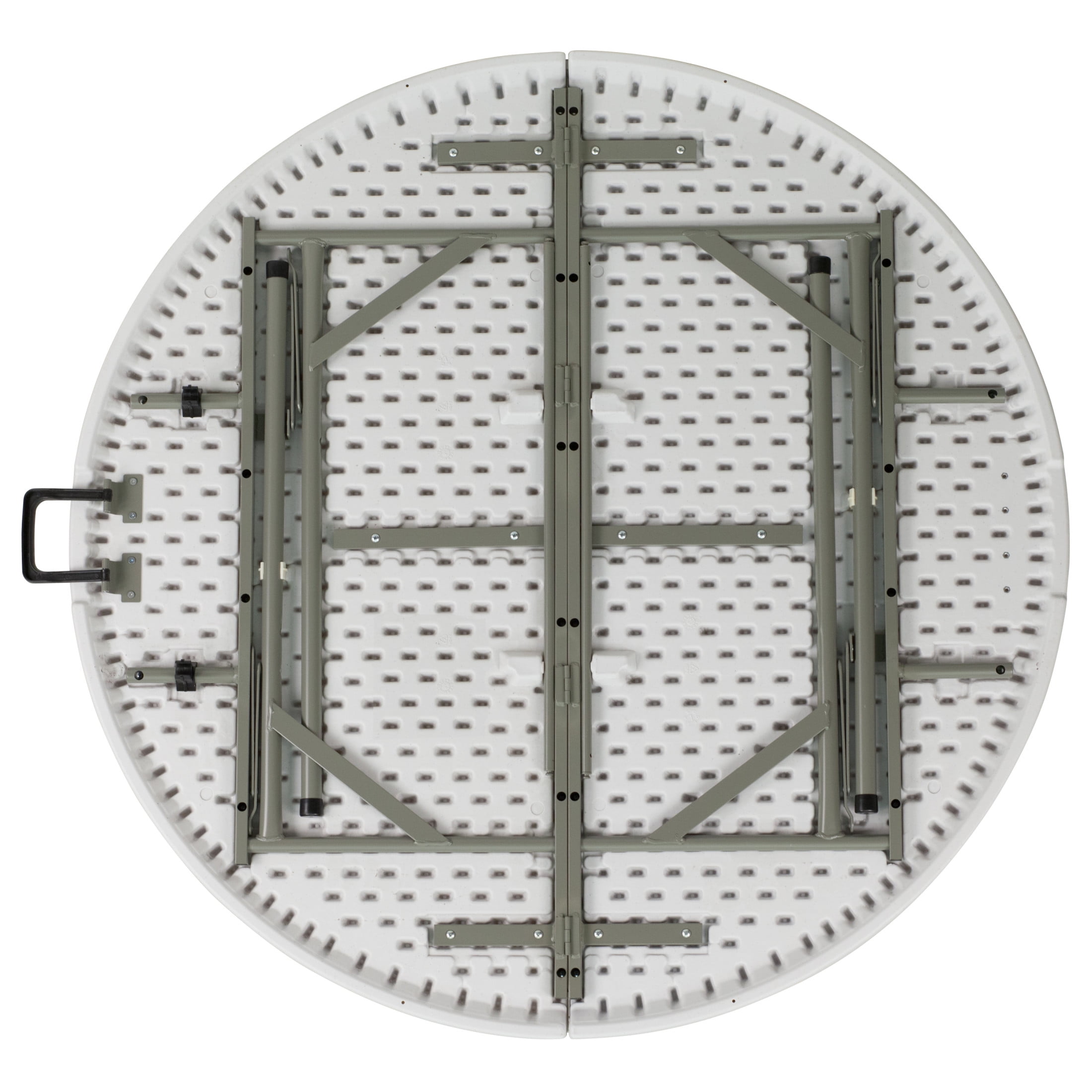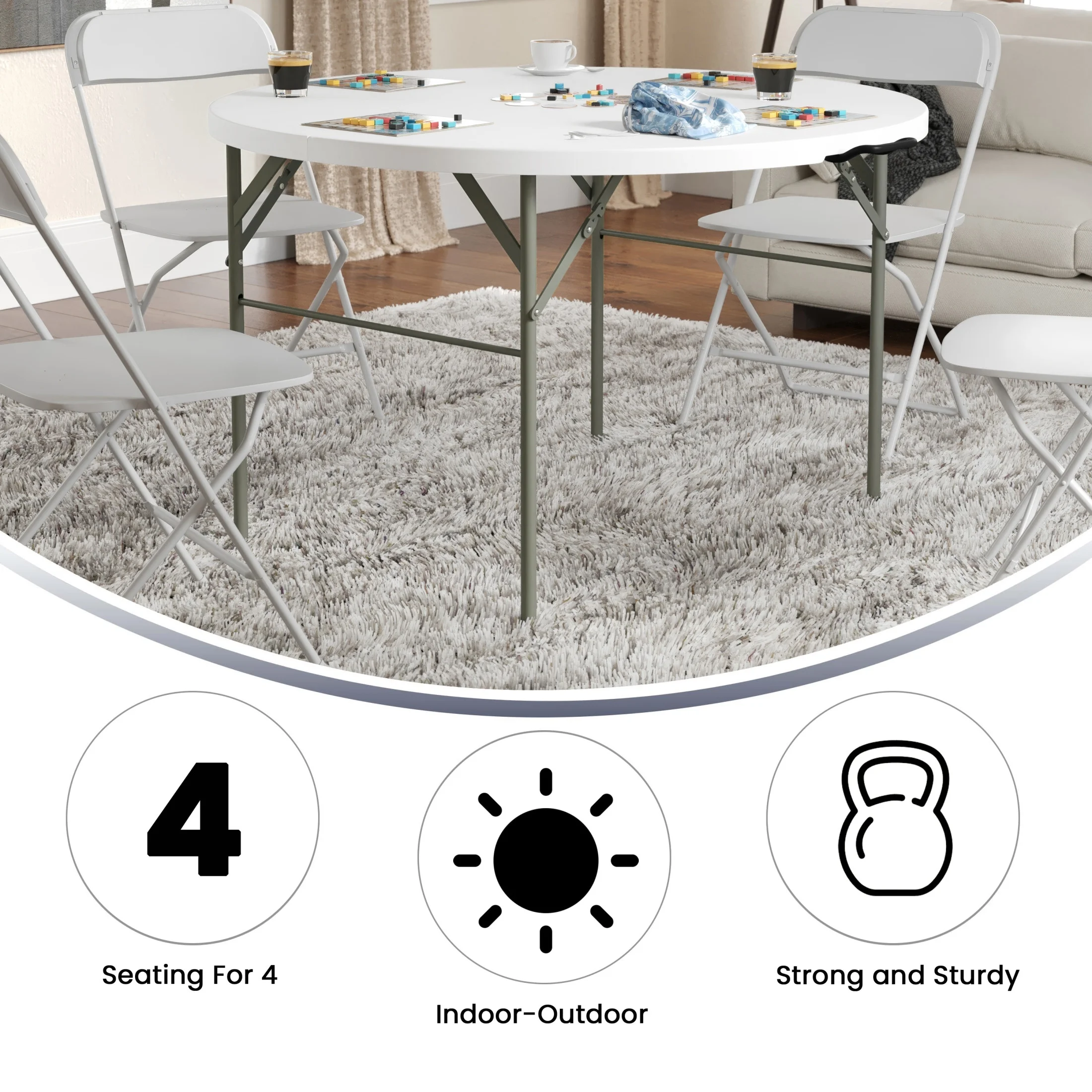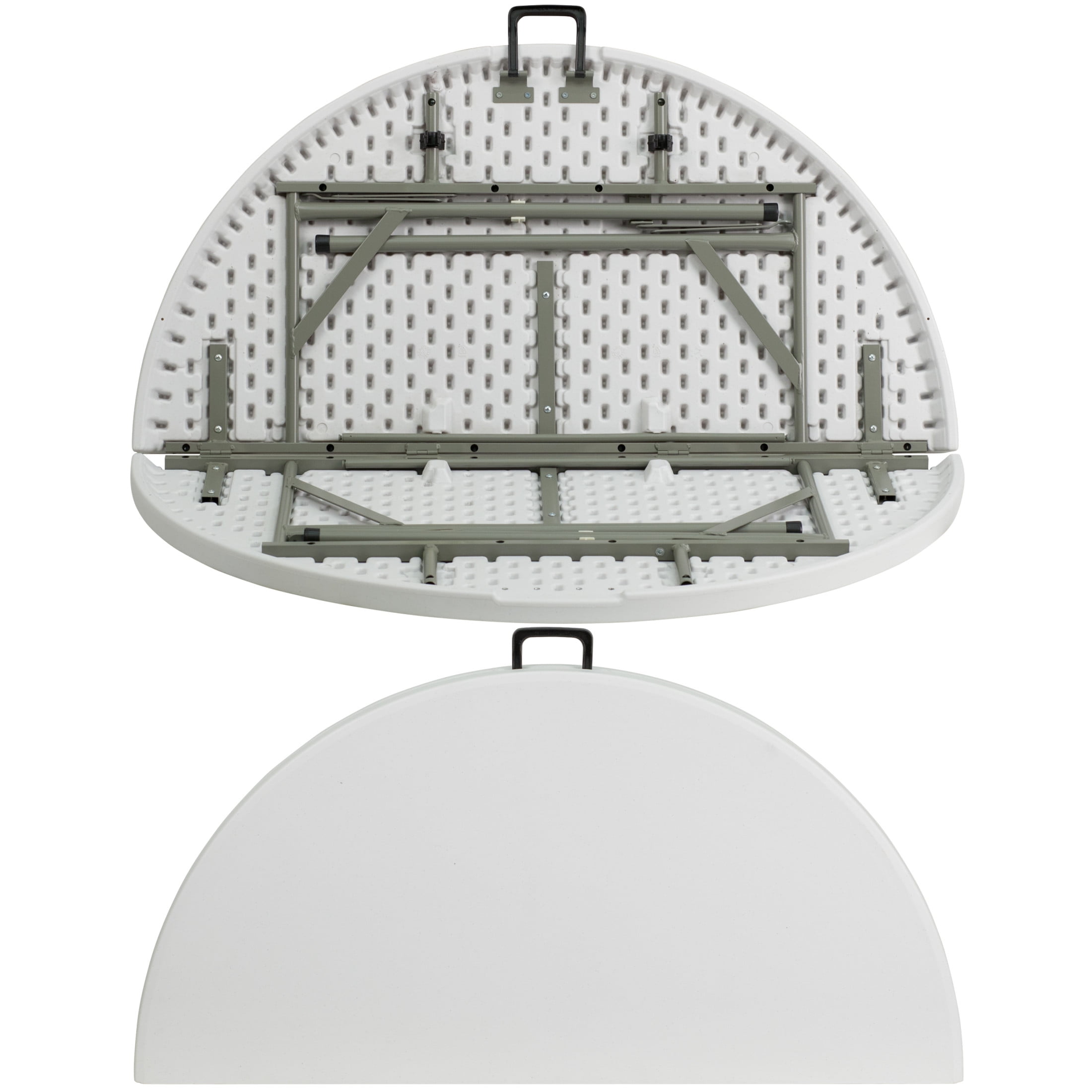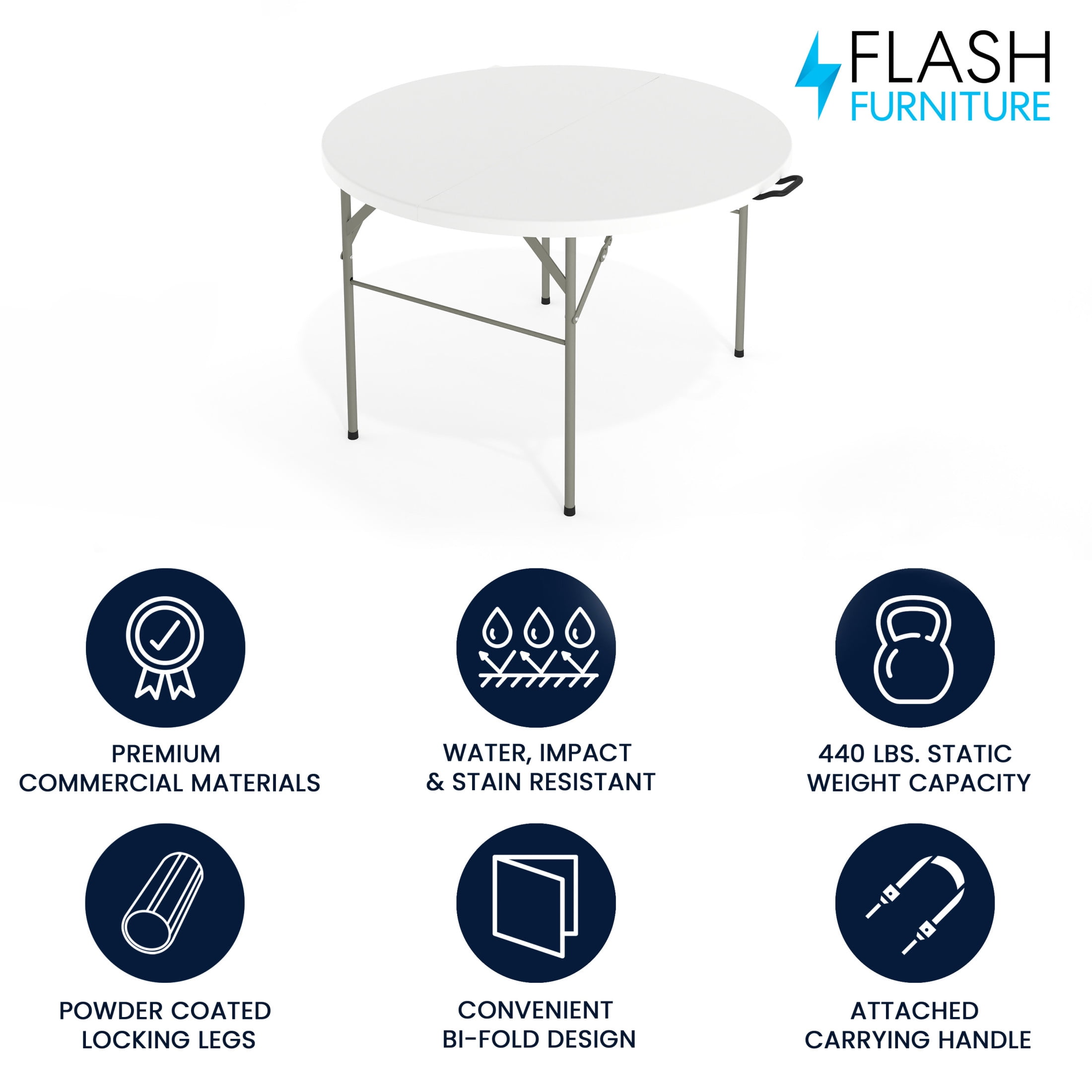 Flash Furniture Freeman 4-Foot Round Bi-Fold Granite White Plastic Banquet and Event Folding Table with Carrying Handle Ready To Use Commercial Table 4′ Folding Table Seats up to 4 Adults 440 lb. Static Load Capacity 1.75″ Thick Granite White Top is waterproof, impact and stain resistant Folds in half for storage and travel Includes convenient carrying handle Gray Powder Coated Locking Legs with protective floor caps Legs fold underneath top for flat storage No Assembly Required; Designed for Indoor and Outdoor Use NO ASSEMBLY REQUIRED: Supports up to 440 lbs. of static weight and measures 47.75″ W x 47.75″ D x 29.5″ H open and 19″ W x 4.5″ D x 41″ H folded with no assembly required, so you can start setting up for events right away