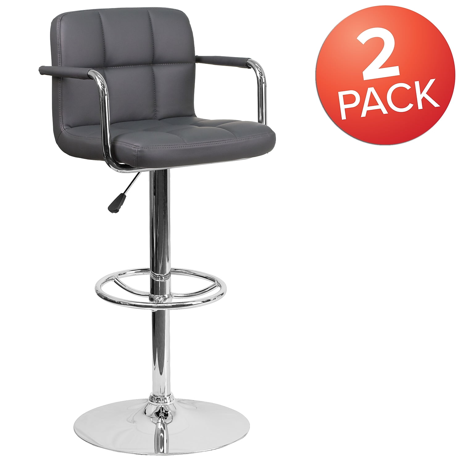 Flash Furniture Genna 2 Pk. Contemporary Gray Quilted Vinyl Adjustable Height Barstool with Arms and Chrome Base Set of 2 Contemporary Adjustable Swivel Bar Stools with Vinyl Wrapped Chrome Arms Mid-Back Design Gray Vinyl Upholstery Quilted Design Covering Padded Seat with CAL 117 Fire Retardant Foam 360 Degree Swivel Seat Gas Lift Seat adjusts from Counter to Bar Heights Footrest provides better sitting experience 19.5″ Round Chrome Base Designed for Residential Use Only PRODUCT MEASUREMENTS: Overall Size: 20″W x 18″D x 36.75-45.25″H; Seat Size: 17.5″W x 15″D x 24.75-33.25″H; Back Size: 16.5″W x 11.25″H; Arm Size: 31.25-40″H from floor; 7″H from seat