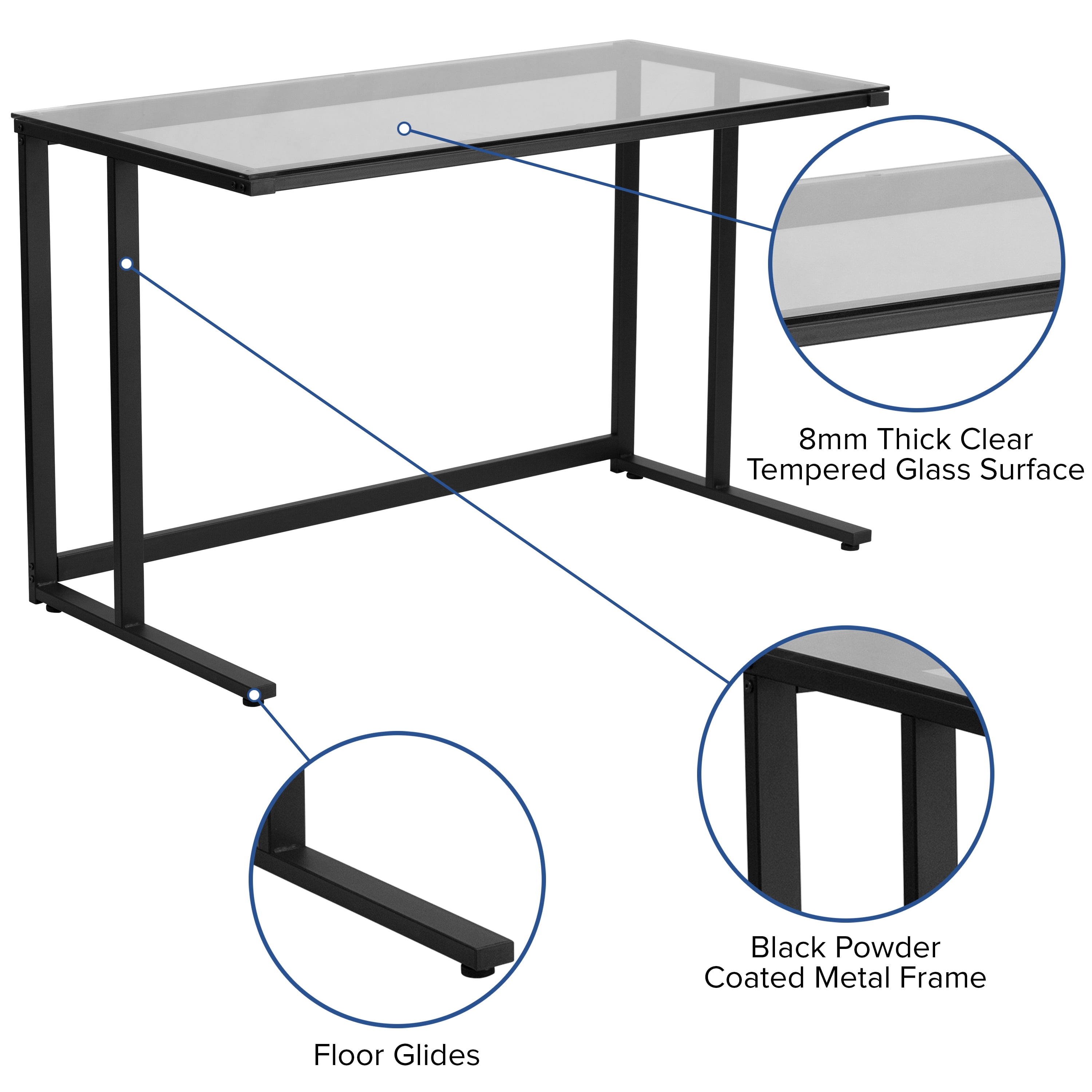 Contemporary Style Computer Desk Clear Tempered Glass Surface 8mm Thick Glass Spacious Rectangular Desktop Pedestal Metal Frame Black Powder Coated Metal Frame Floor Glides
