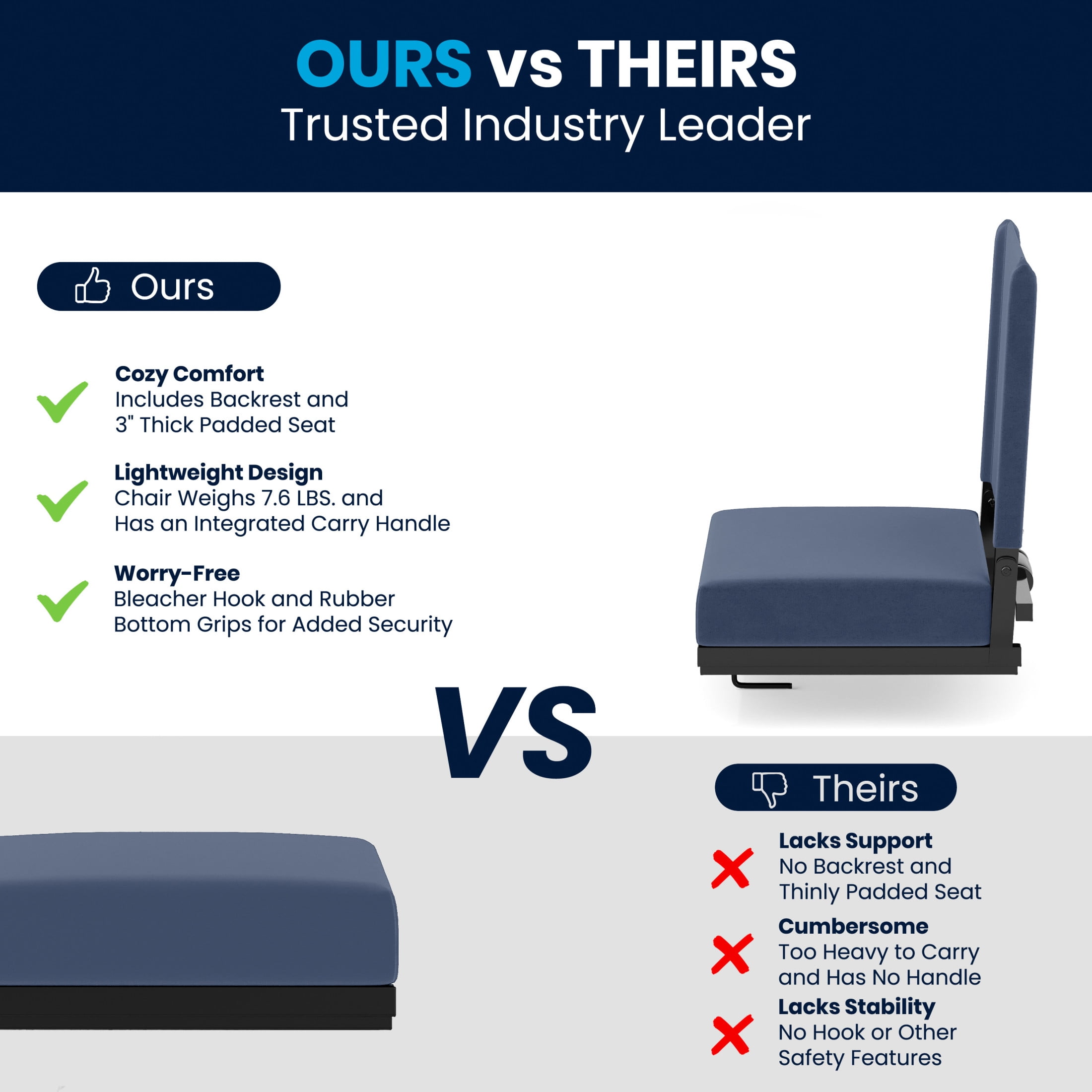 Flash Furniture Grandstand Folding Stadium Chair, Navy Folding Stadium Chair with Carrying Handle Grip for all indoor and outdoor events Lightweight Portable Chair weighs a mere 7.6 pounds for easy transport Black Aluminum Frame Holds Up to 500 Pounds Weight Capacity for a worry free seating experience 3″ Thick Padded Seat with CAL 117 Fire Retardant Foam Bleacher Hook and Rubber Bottom Grips stabilize chair on benches Spot Clean durable canvas covers with a wet cloth, for tough stains use a solvent based cleaner Folded Size: 18″W x 15.5″D x 6″H Stadium Chair with Back Support provides supreme comfort for athletic events, concerts, school programs and graduations and visits to the park Top Review: I recently purchased 3 of these chairs to use at HS competitions and we absolutely love them! They’re so comfortable they feel like you’re sitting on a sofa!!!! NO ASSEMBLY REQUIRED: Measures 18″W x 14″D x 18″H when open and 18″W x 15.5″D x 6″H when folded for compact storage after use, and no assembly is required