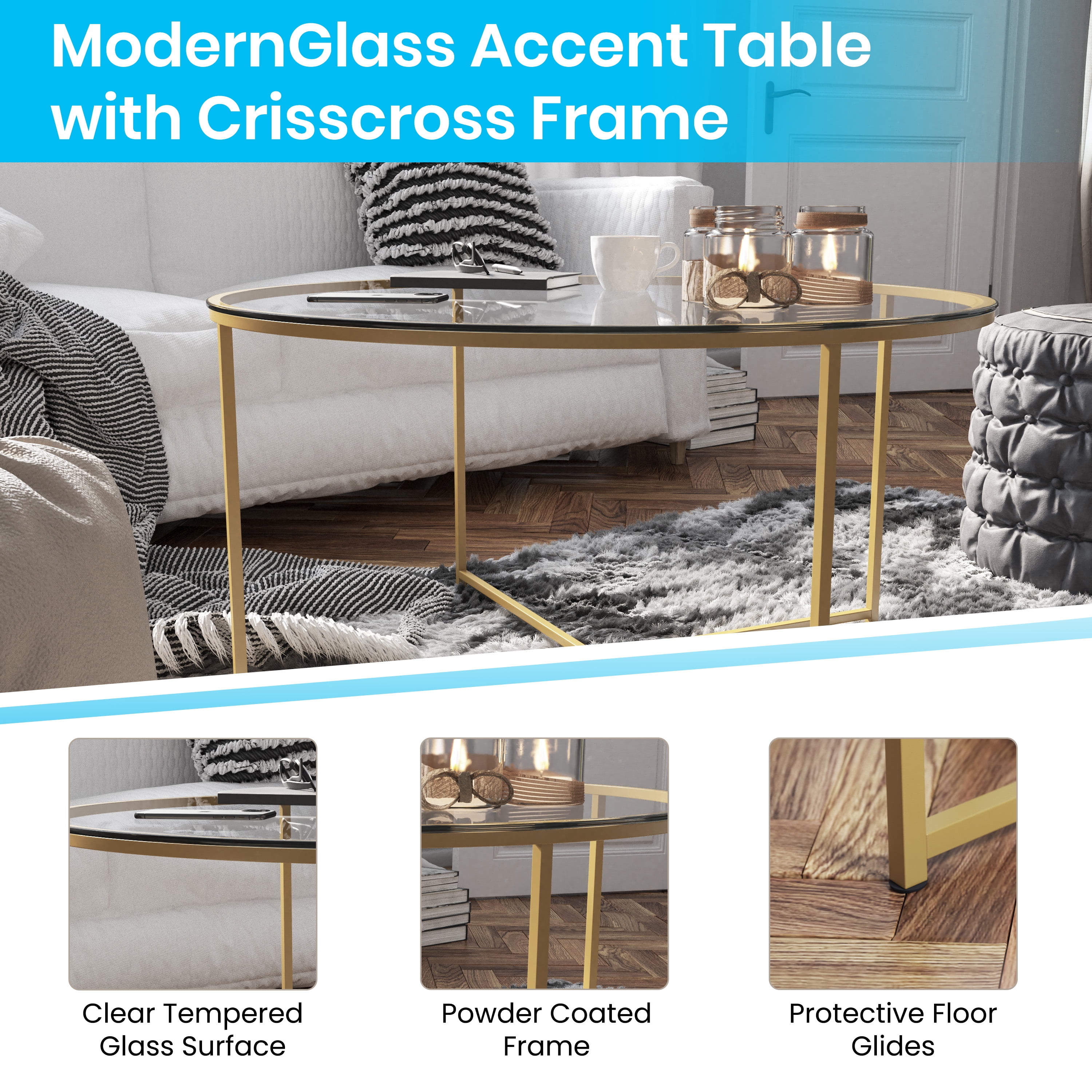 Add an upscale look to any room in your living space with the effortless style of this coffee table. Featuring a crystal clear glass top, this occasional table set lends an open, airy feel to any space. The round shape atop modern crisscross brushed gold metal legs completes the overall look of this stunning piece. Whether you’re serving coffee, tea, or just want a place for decorative items, you will never have to worry about the safety of this table. Strong, 6mm tempered glass resists breakage even with daily use while the sturdy cross brace metal frame keeps your possessions secure. A durable powder coated finish ensures this living room table will look great for years to come. Have your new table ready upon arrival in under 30 minutes with the included step-by-step instructions and included tools. Floor glides will protect your hard flooring surfaces from scuffs and scrape and messes clean up quickly and easily with a water based cleaning agent.