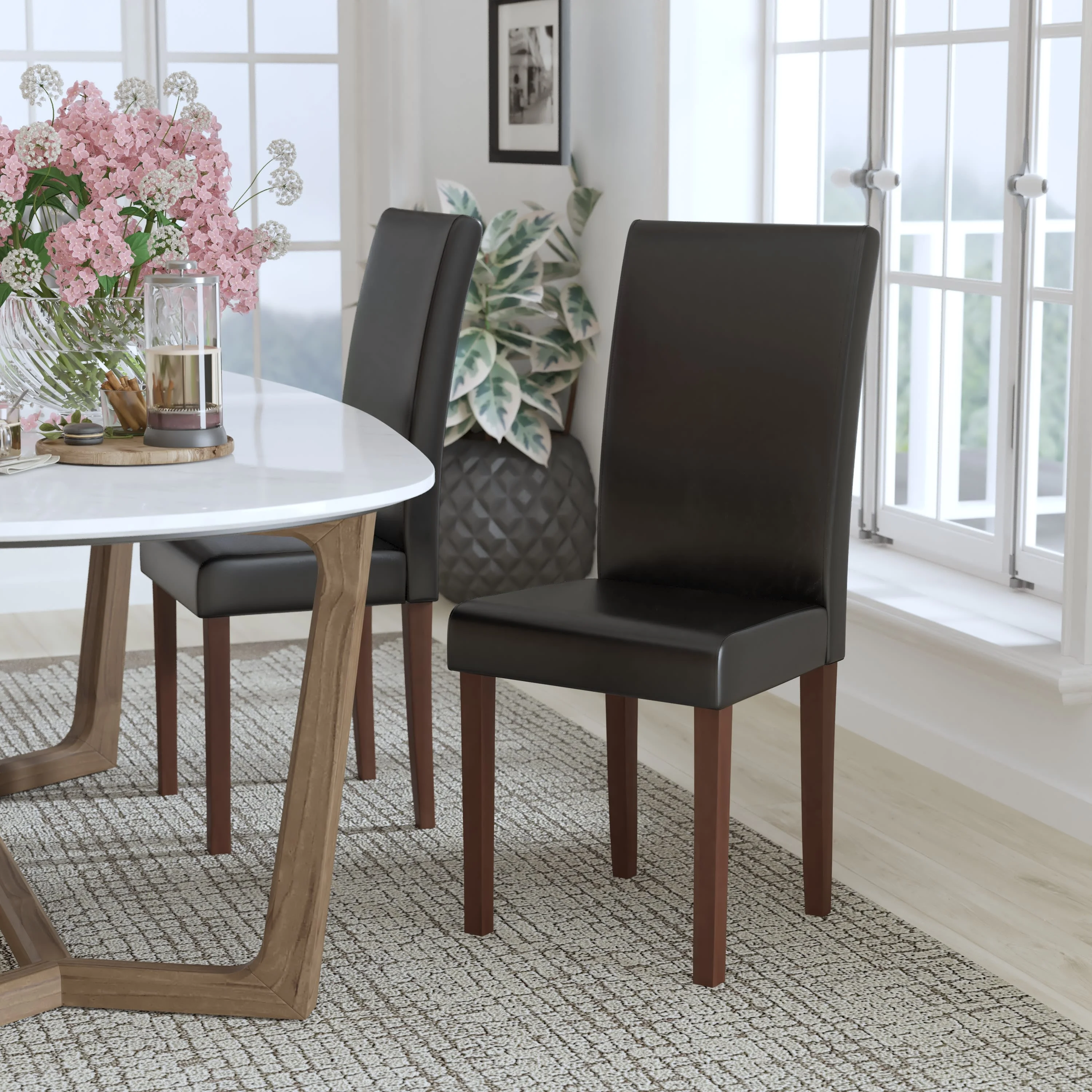 Flash Furniture Greenwich Series Black LeatherSoft Upholstered Panel Back Mid-Century Parsons Dining Chair Mid-Century Style Parsons Chair for Residential Use Black LeatherSoft Upholstered Back and Seat High Panel Back Design High Density CAL 117 Fire Retardant Foam Padding Sleek Mahogany Finished Wooden Legs Mahogany Wood Legs Protective Floor Glides Designed for Residential Use Only Vacuum or brush lightly to remove dirt LeatherSoft option is leather and polyurethane for added Softness and Durability PRODUCT MEASUREMENTS: Overall Size: 19″W x 21.5″D x 40″H; Seat Size: 16-19″W x 19″H; Back Size: 15.5″W x 22.75″H