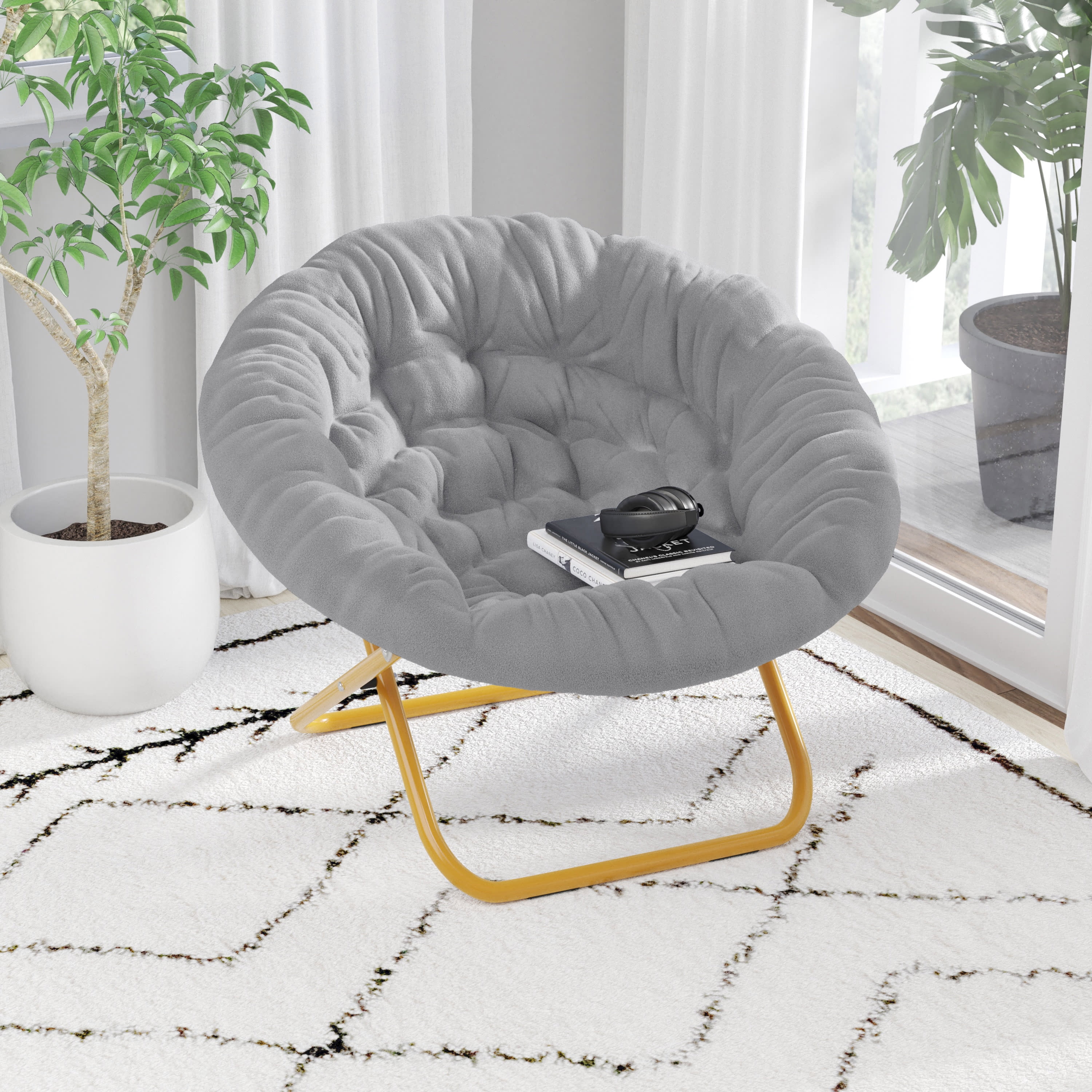 Flash Furniture Gwen 38″ Oversize Portable Faux Fur Folding Saucer Moon Chair for Dorm and Bedroom, Gray Faux Fur/Soft Gold Frame Contemporary Oversized Folding Saucer Chair Gray Faux Fur Upholstery Thickly Padded Back and Seat Extra Large for Comfort Foldable Design for Storage and Portability Soft gold steel Frame Holds up to 300 LBS. Static Weight Wipe Clean with a Mild Detergent and Damp Cloth No Assembly Required PRODUCT MEASUREMENTS: Overall Size: 35.75″W x 31″D x 33.5″H; Seat Size: 18.5″W x 18.5″D x 18.5″H; Back Size: 24.5″W x 16.5″H