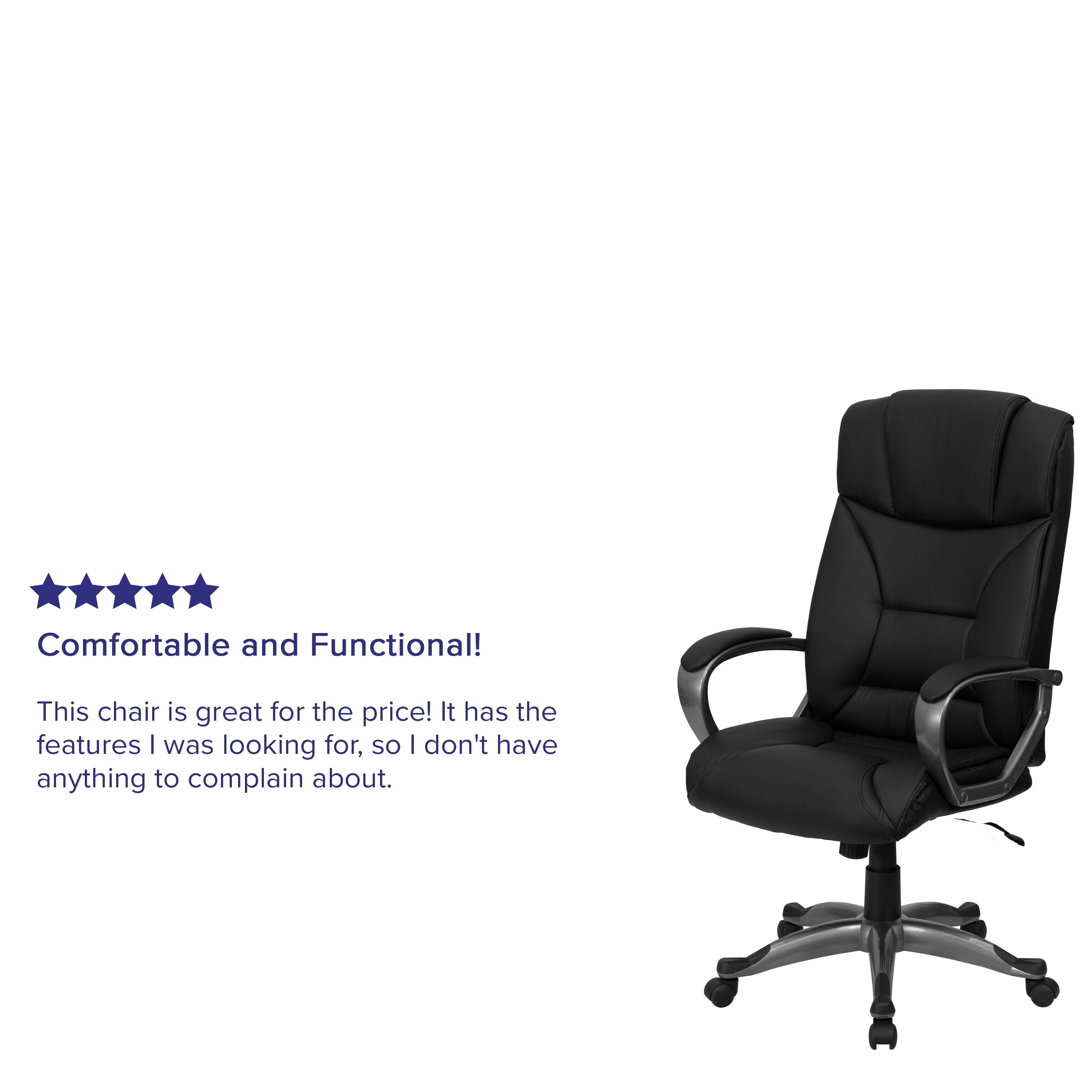 Flash Furniture Hansel High Back Black LeatherSoft Executive Swivel Office Chair with Arms Contemporary Office Chair Black LeatherSoft Upholstery High Back Design with Headrest, Padded Arms Built-In Lumbar Support, Contoured Back and Seat Tilt Lock Mechanism rocks/tilts the chair and locks in an upright position, Tilt Tension Adjustment Knob adjusts the chair’s backward tilt resistance CAL 117 Fire Retardant Foam Waterfall Seat reduces pressure on your legs Pneumatic Swivel Seat Height Adjustment Heavy Duty Titanium Nylon Base with Black End Caps, Dual Wheel Casters LeatherSoft is leather and polyurethane for added Softness and Durability PRODUCT MEASUREMENTS: Overall Size: 26.25″W x 25″D x 45.25-49.25″H; Seat Size: 21.5″W x 19.5″D x 18.75-22.75″H; Back Size: 21.75″W x 29.25″H; Arm Size: 7.75″H from seat