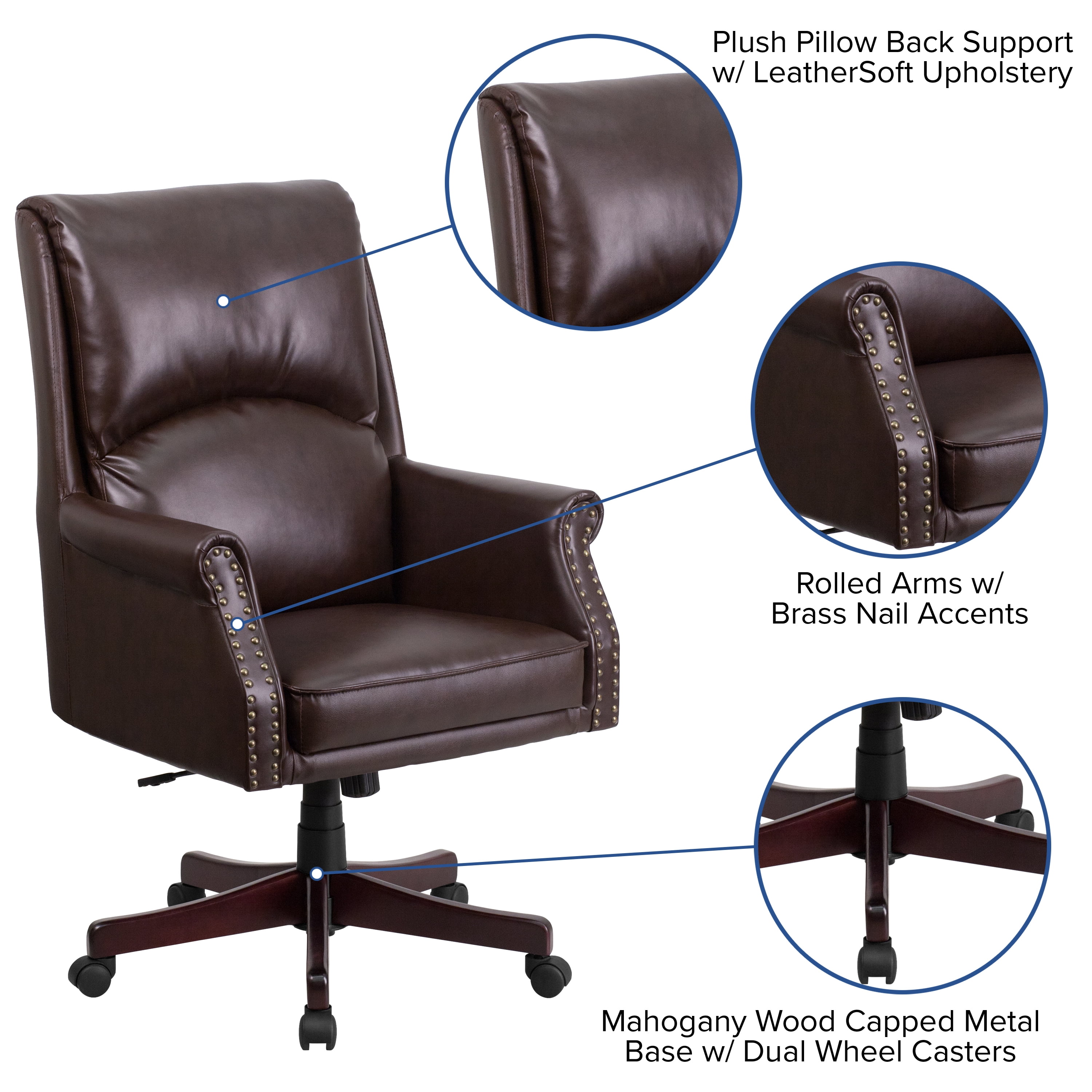 This luxurious traditional chair features soft Brown LeatherSoft upholstery and brass nail accents that trim the rolled arms. Having the support of an ergonomic office chair may help promote good posture and reduce future back problems or pain. High back office chairs have backs extending to the upper back for greater support. The high back design relieves tension in the lower back, preventing long term strain. The plush pillow back cushion provides excellent support, allowing your back to rest comfortably. Chair easily swivels 360 degrees to get the maximum use of your workspace without strain. The pneumatic adjustment lever will allow you to easily adjust the seat to your desired height. The mahogany wood base adds to the charm of a traditional appearance.