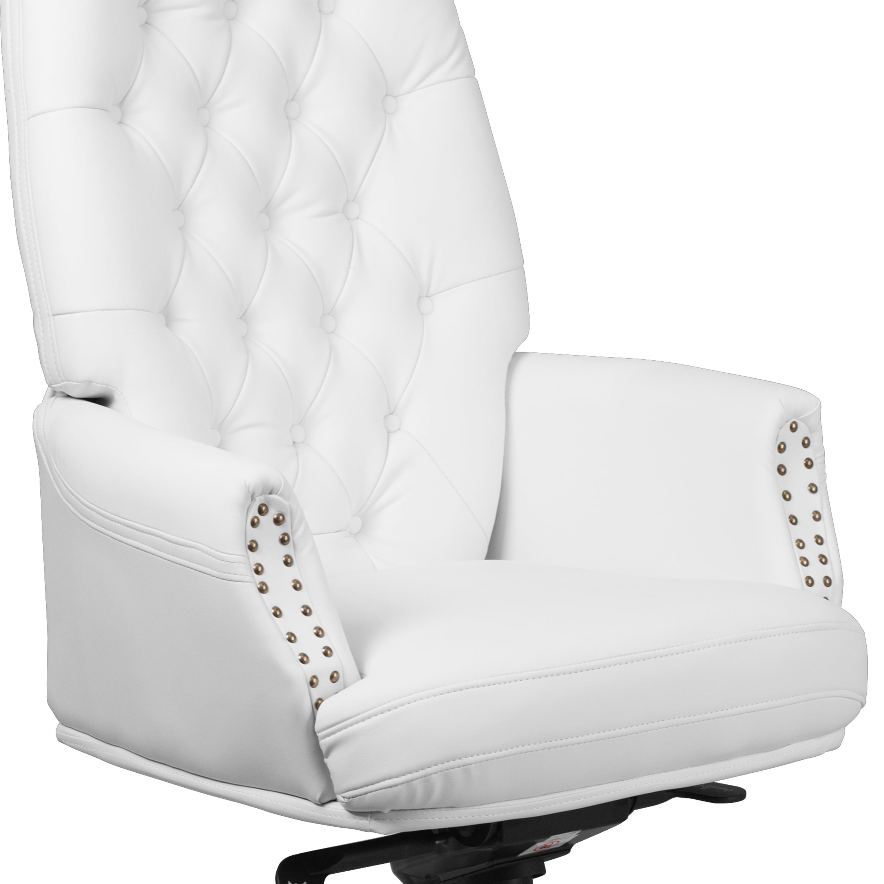 Flash Furniture Hansel High Back Traditional Tufted White LeatherSoft Multifunction Executive Swivel Ergonomic Office Chair with Arms Traditional Office Chair White LeatherSoft Upholstery High Back Design Button Tufted Back, Fully Upholstered Padded Arms with Brass Nail Accents Double Paddle Control Mechanism Multi-Tilt Lock Mechanism rocks/tilts and locks the chair in infinite positions, Tilt Tension Adjustment Knob adjusts the chair’s backward tilt resistance Pneumatic Swivel Seat Height Adjustment CAL 117 Fire Retardant Foam Heavy Duty Chrome Base, Dual Wheel Casters LeatherSoft is leather and polyurethane for added Softness and Durability PRODUCT MEASUREMENTS: Overall Size: 28″W x 28.5″D x 48-50.25″H; Seat Size: 19″W x 18.5″D x 21-23.25″H; Back Size: 22.5″W x 29″H; Arm Size: 27.75-30″H from floor; 8″H from seat