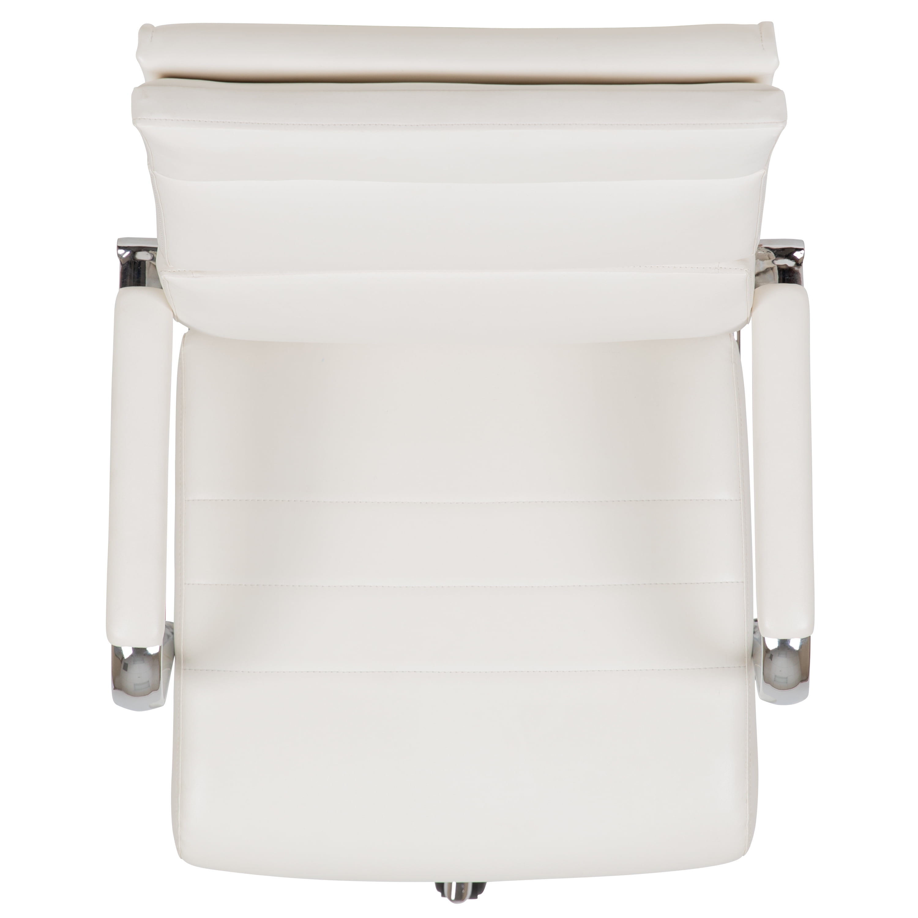 Flash Furniture Hansel High Back White LeatherSoft Contemporary Panel Executive Swivel Office Chair Modern Executive Office Chair White LeatherSoft Upholstery High Back Design with Coat Hanger Bar on Back Padded Seat with CAL 117 Fire Retardant Foam Padded Chrome Metal Arms provide support to upper body Tilt Lock Mechanism rocks/tilts the chair and locks in an upright position Tilt Tension Adjustment Knob adjusts the chair’s backward tilt resistance Pneumatic Seat Height Adjustment 5-Star Chrome Base with Dual-Wheel Casters LeatherSoft is leather and polyurethane for added Softness and Durability PRODUCT MEASUREMENTS: Overall Size: 27.25″W x 27.25″D x 42.25-46″H; Seat Size: 19.5″W x 19″D x 17-20.5″H; Back Size: 18.25″W x 25.25″H; Arm Size: 24.5-28.25″H from floor; 7.5″H from seat