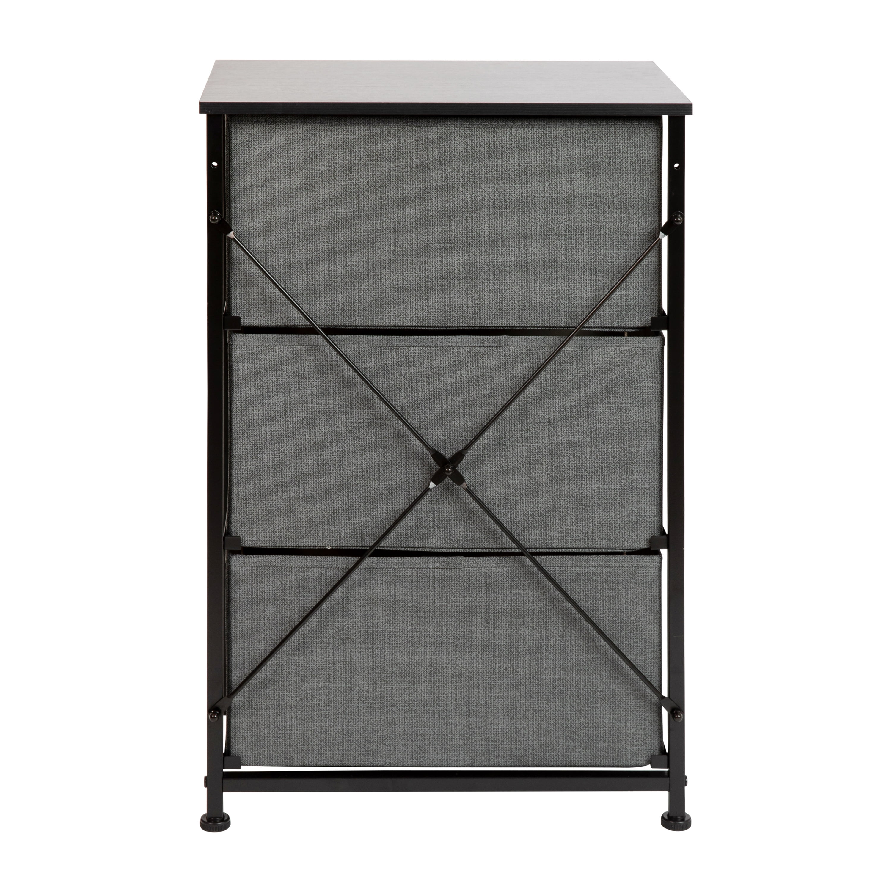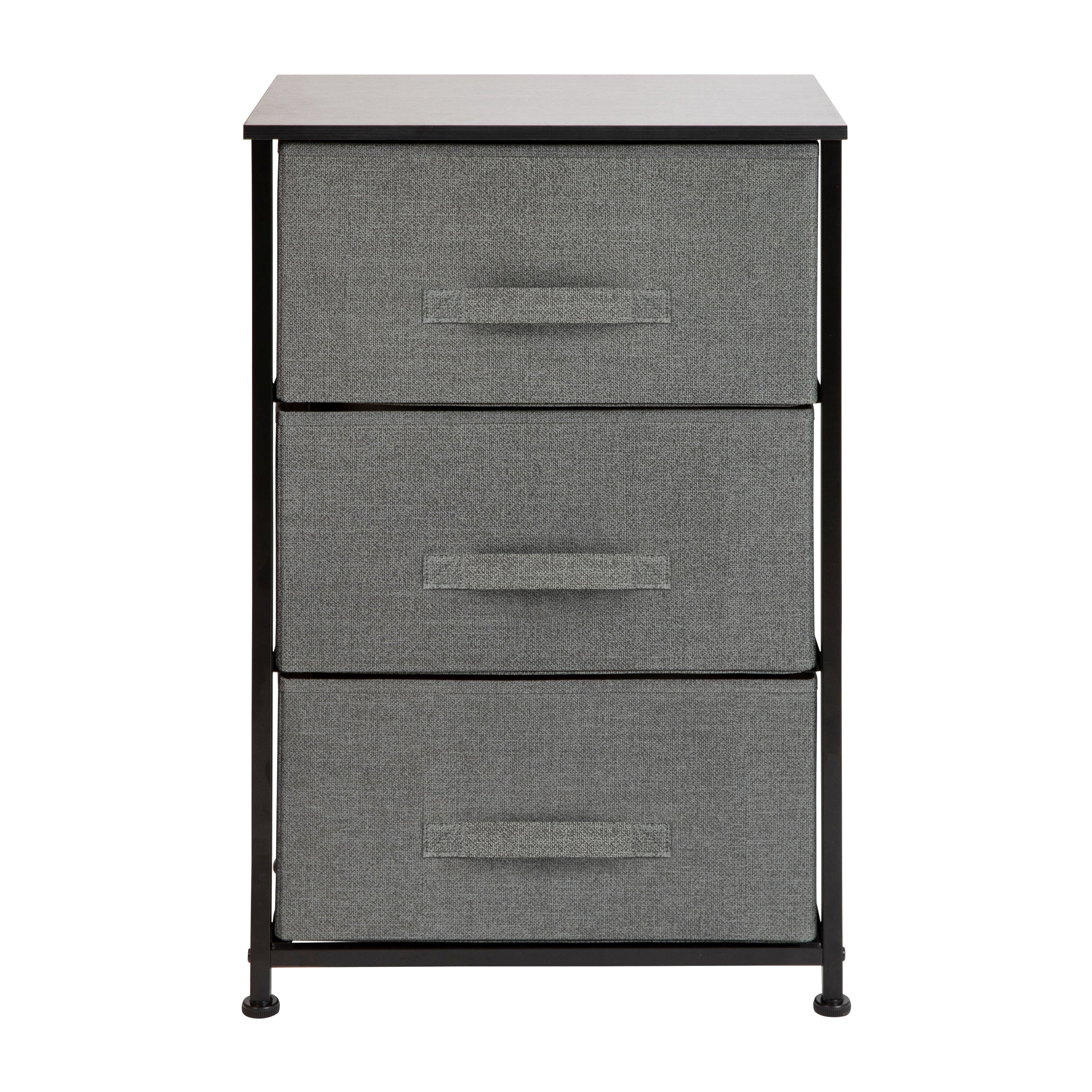Get much needed storage at an economical price that works anywhere in your living space with this 3 drawer vertical organizer. Whether you need a place for current or out of season clothing, washcloths, or charging cords and remote controls, the three easy pull fabric drawers are a perfect solution. Use this vertical storage tower as a nightstand to hold your cell phone, glasses, or nighttime glass of water. Storage doesn’t have to be bulky to be strong. Metal screw construction securely joins the powder coated cast iron frame of this fabric dresser together. The durable engineered wood top provides a hard surface to set books, lamps, or a vase of fresh flowers and holds up to 40 lbs. static weight capacity. Non-Woven fiber drawers not only look great but are fade and stain resistant to help this dresser with drawers retain its great looks. Quick and easy assembly can be achieved in 10 minutes or less with the step-by-step illustrated instructions or online PDF. Plastic adjustable floor glides protect your hard flooring surfaces and provide a stable platform on uneven flooring surfaces. Quickly remove spills with a clean damp cloth. Use this vertical dresser in or out of your closet for extra organization that goes above and beyond plain plastic bins.