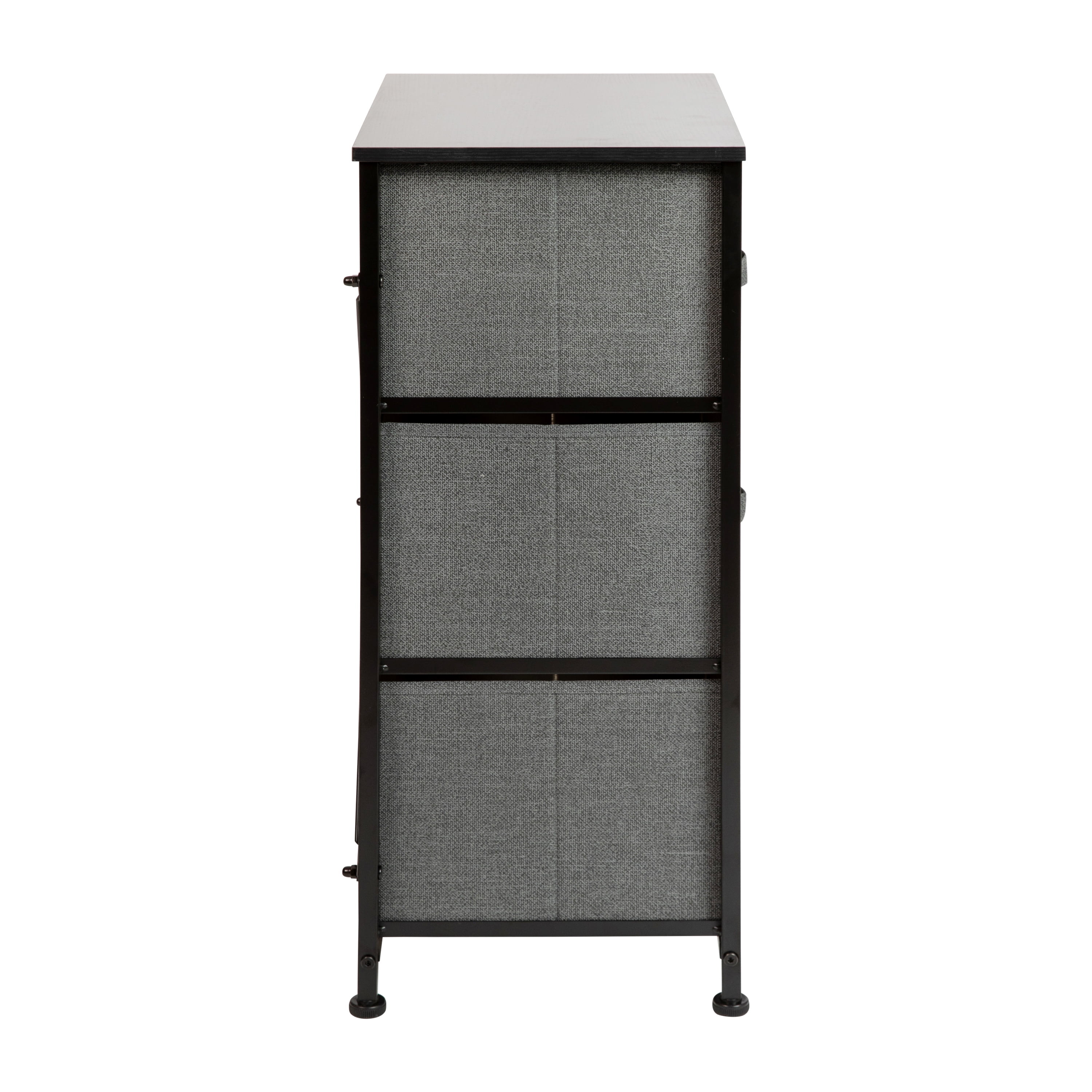 Flash Furniture Harris 3 Drawer Wood Top Black Cast Iron Frame Vertical Storage Dresser with Dark Gray Easy Pull Fabric Drawers 3 Drawer Storage Organizer for Bedroom & Closet for stylish storage solutions Easy Pull Dark Gray Non-Woven Fabric Drawers are fade and stain resistant Drawer Size (3): 15.875″W x 11″D x 8.5″H Engineered Wood Top supports up to 40 lbs. static weight capacity Cross Brace Supports prevent unit from leaning Rust Resistant Black Cast Iron Frame with Long-Lasting Metal Screw Construction Adjustable Plastic Floor Glides provide a stable, level surface and protect hard flooring surfaces Easily Cleans with Damp Cloth to retain its great looks Assembles in Under 10 Minutes with illustrated instructions or online PDF Stable storage solution for any room, mix and match from our entire collection PRODUCT MEASUREMENTS: Overall Size: 17.75″W x 11.75″D x 37.25″H; Drawer Size (3): 15.875″W x 11″D x 8.5″H