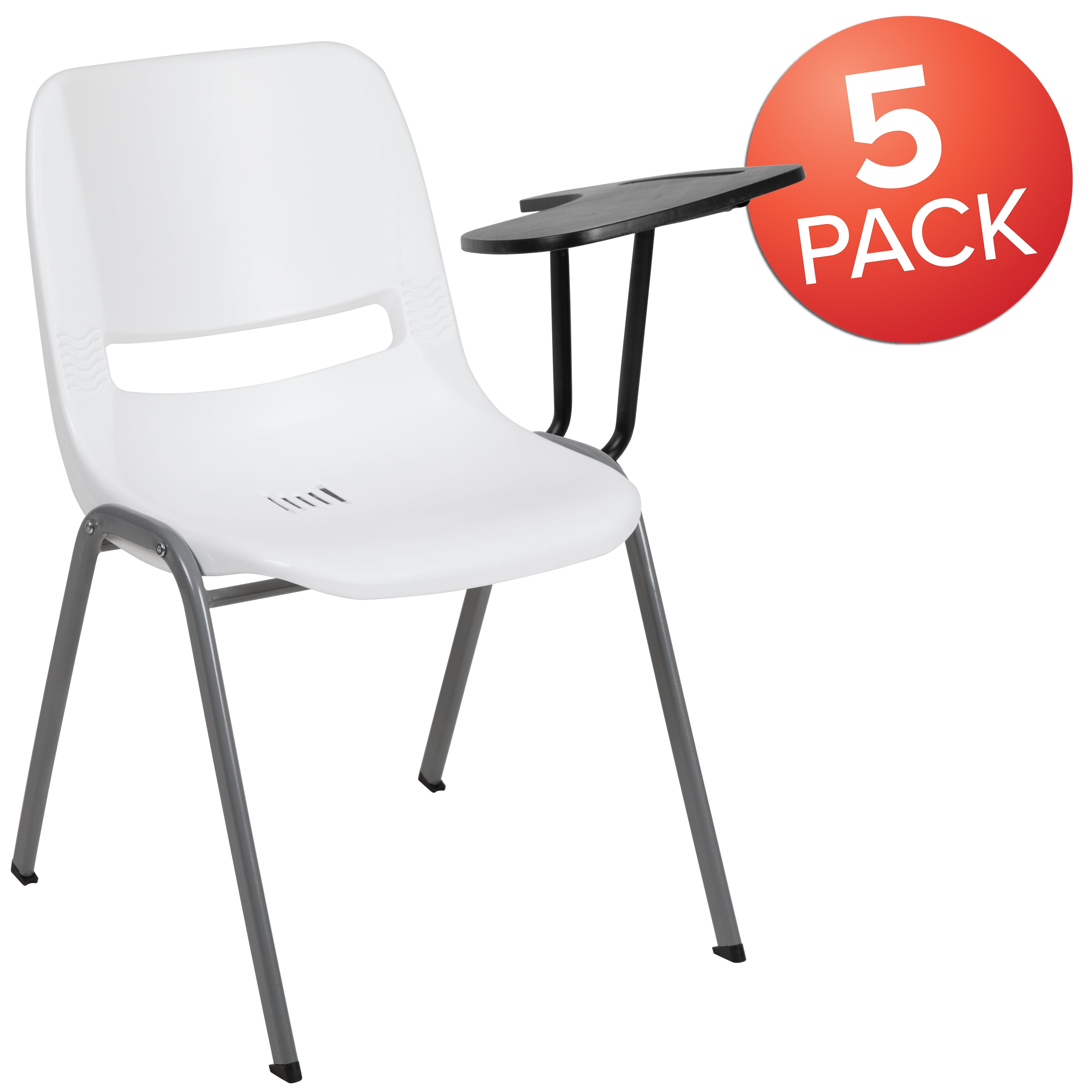 Flash Furniture HERCULES 5 Pack White Ergonomic Shell Chair with Left Handed Flip-Up Tablet Arm Set of 5 Multipurpose Tablet Arm Chairs Compact Size Desk 880 lb. Weight Capacity Ergonomically Contoured Design with White Plastic Back and Seat Left Handed Plastic Tablet Arm with pencil groove Tablet Size: 12.5″W x 15.75″D x 9.75″H from seat Some Assembly Required: attach tablet arm with 2 screws Gray Powder Coated Frame Finish with Plastic Floor Glides Designed for Commercial Use PRODUCT MEASUREMENTS: Overall Size: 21″W x 25.5″D x 32″H; Seat Size: 17.75″W x 15.5″D x 17.75″H; Back Size: 17″W x 15″H; Tablet Size: 12.5″W x 15.75″D x 9.75″H from seat