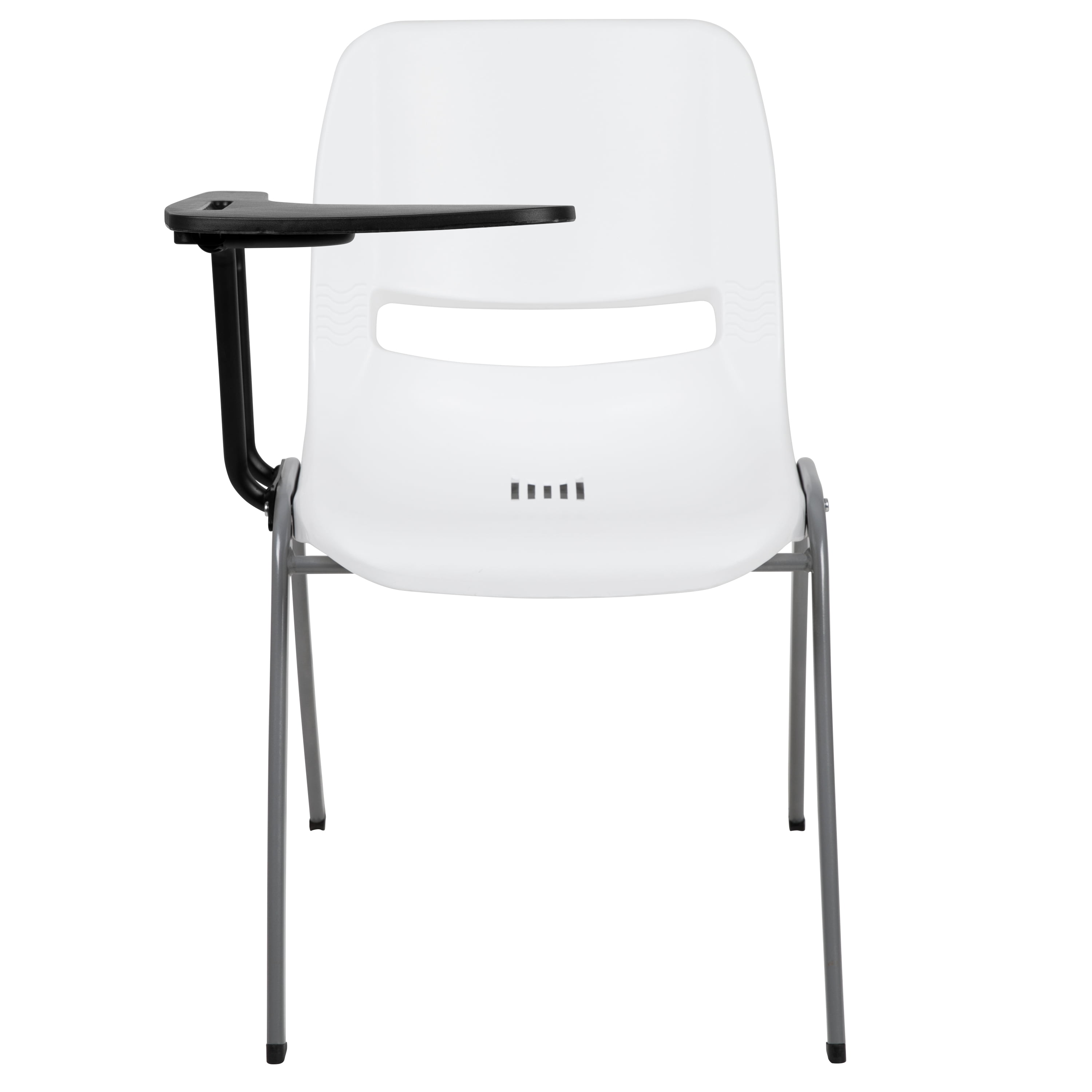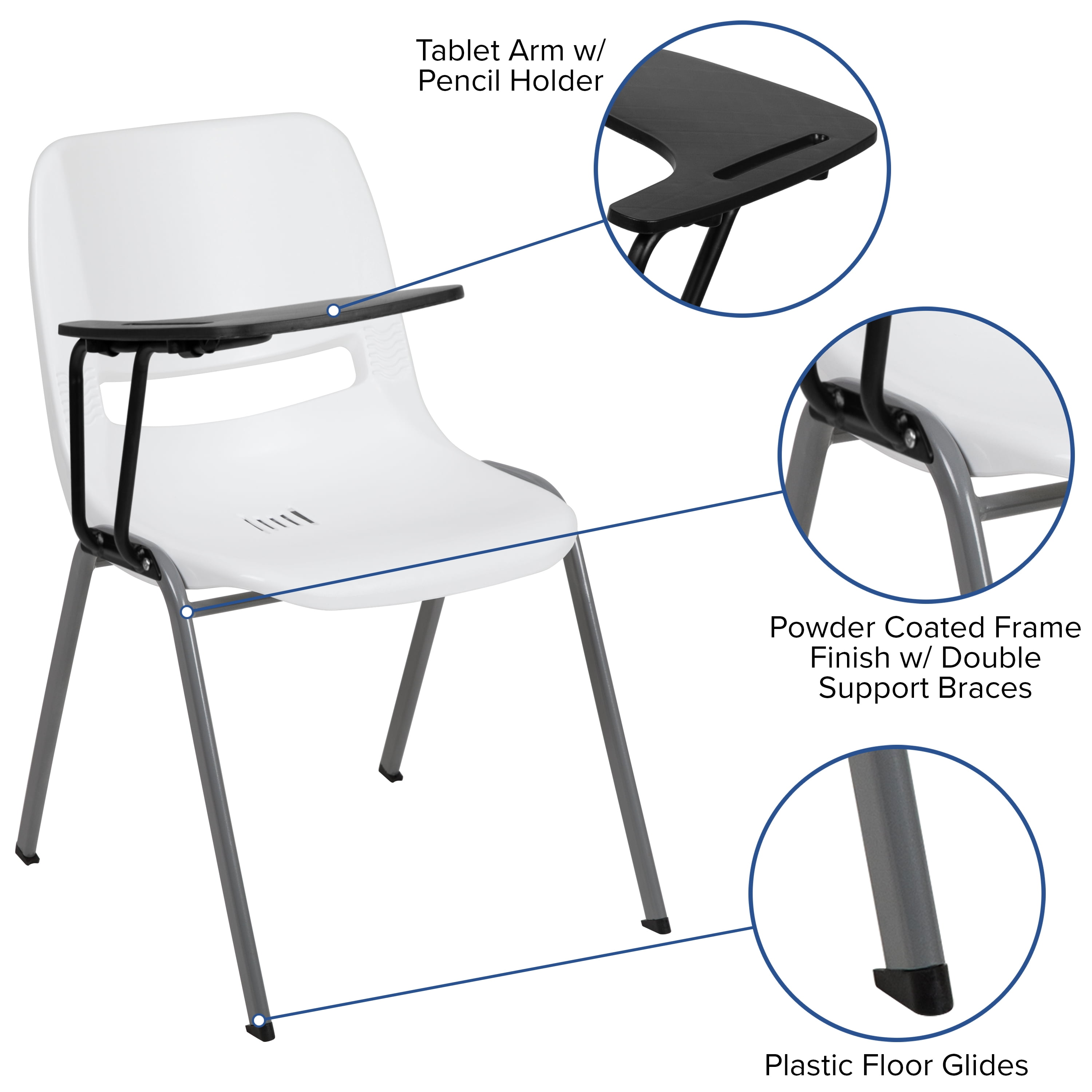 Flash Furniture HERCULES 5 Pack White Ergonomic Shell Chair with Right Handed Flip-Up Tablet Arm Set of 5 Multipurpose Tablet Arm Chairs Compact Size Desk 880 lb. Weight Capacity Ergonomically Contoured Design with White Plastic Back and Seat Right Handed Plastic Tablet Arm with pencil groove Tablet Size: 12.5″W x 15.75″D x 9.75″H from seat Some Assembly Required: attach tablet arm with 2 screws Gray Powder Coated Frame Finish with Plastic Floor Glides Designed for Commercial Use PRODUCT MEASUREMENTS: Overall Size: 21″W x 25.5″D x 32″H; Seat Size: 17.75″W x 15.5″D x 17.75″H; Back Size: 17″W x 15″H; Tablet Size: 12.5″W x 15.75″D x 9.75″H from seat