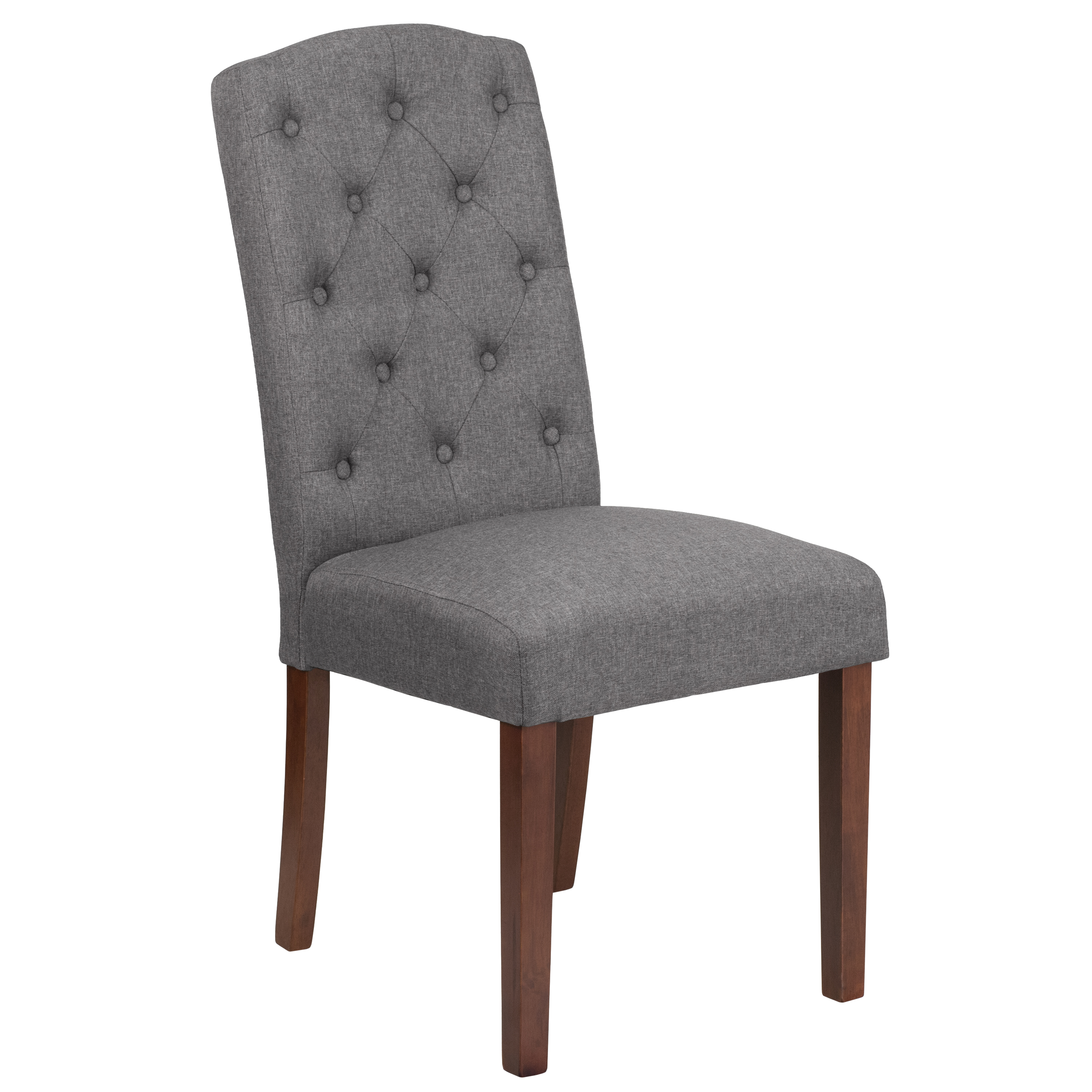 The classic design of this gray fabric upholstered parsons chair makes it a versatile seating option for your home. Button tufted detailing and a mahogany frame finish make them beautiful while high density foam padding and solid hardwood frame construction make them comfortable and durable. Parsons chairs are versatile and can be used not only in the dining room and kitchen but also as a reading chair or extra seating in the living room. The armless design gives the illusion of space which makes them great for small spaces. Vacuum or brush lightly to remove soil. Skirted chair covers can be used to soften their lines for living rooms and bedrooms. A parsons chair can be both formal or casual and are designed to go with almost any decor.