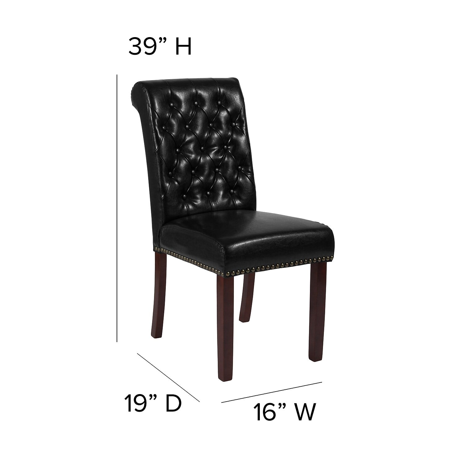Flash Furniture HERCULES Series Black LeatherSoft Parsons Chair with Rolled Back, Accent Nail Trim and Walnut Finish Mid-Century Style Parsons Chairs for Residential Use Soft and Durable Black LeatherSoft Upholstery Button Tufted Rolled Back Brass Nailhead Trim High Density CAL 117 Fire Retardant Foam Padding Walnut Wood Legs with Floor Protector Plastic Glides Designed for Residential Use Only LeatherSoft option is leather and polyurethane for added Softness and Durability PRODUCT MEASUREMENTS: Overall Size: 18.5″W x 27.5″D x 39.75″H; Seat Size: 17.5-18.5″W x 18.5″D x 20.5″H; Back Size: 17″W x 21″H