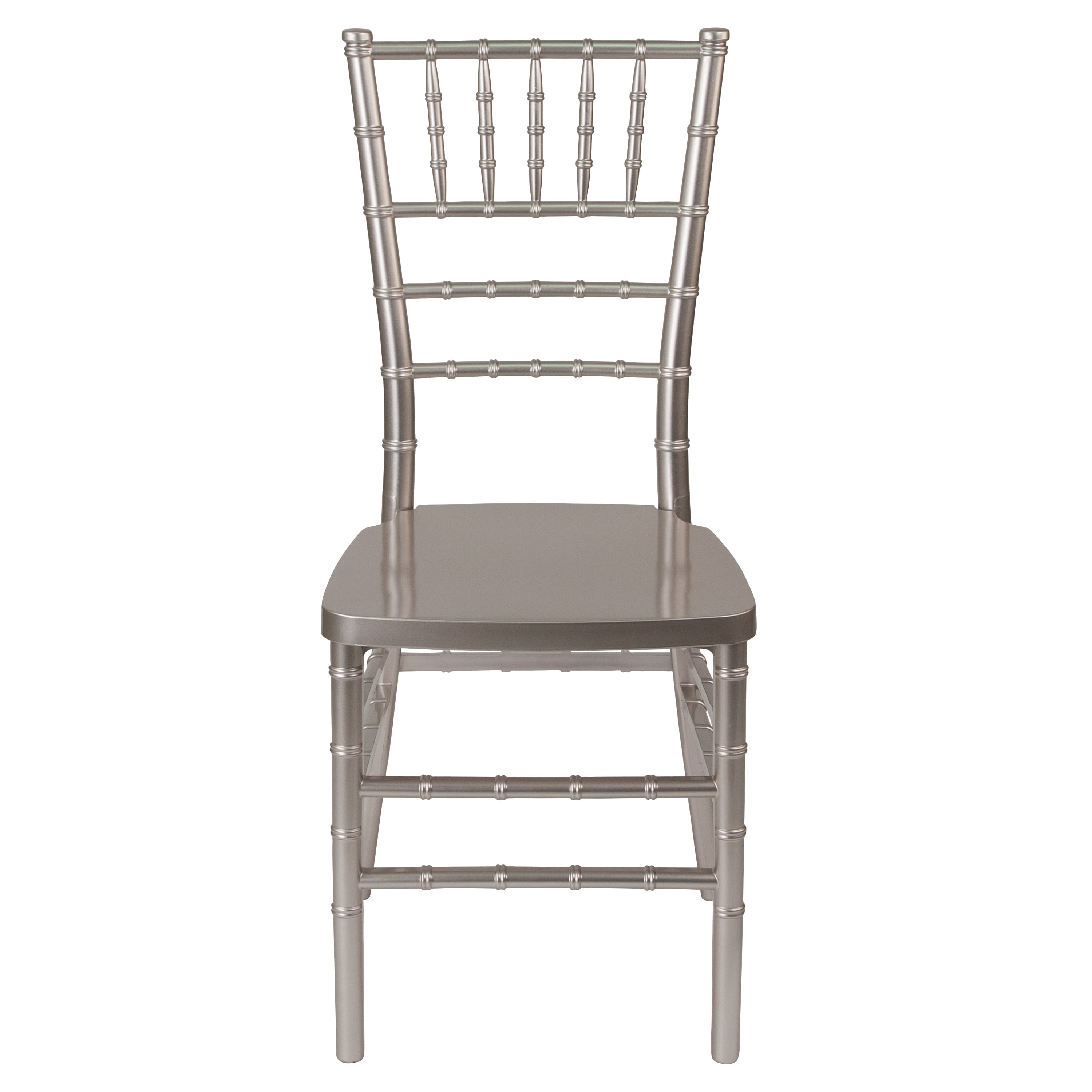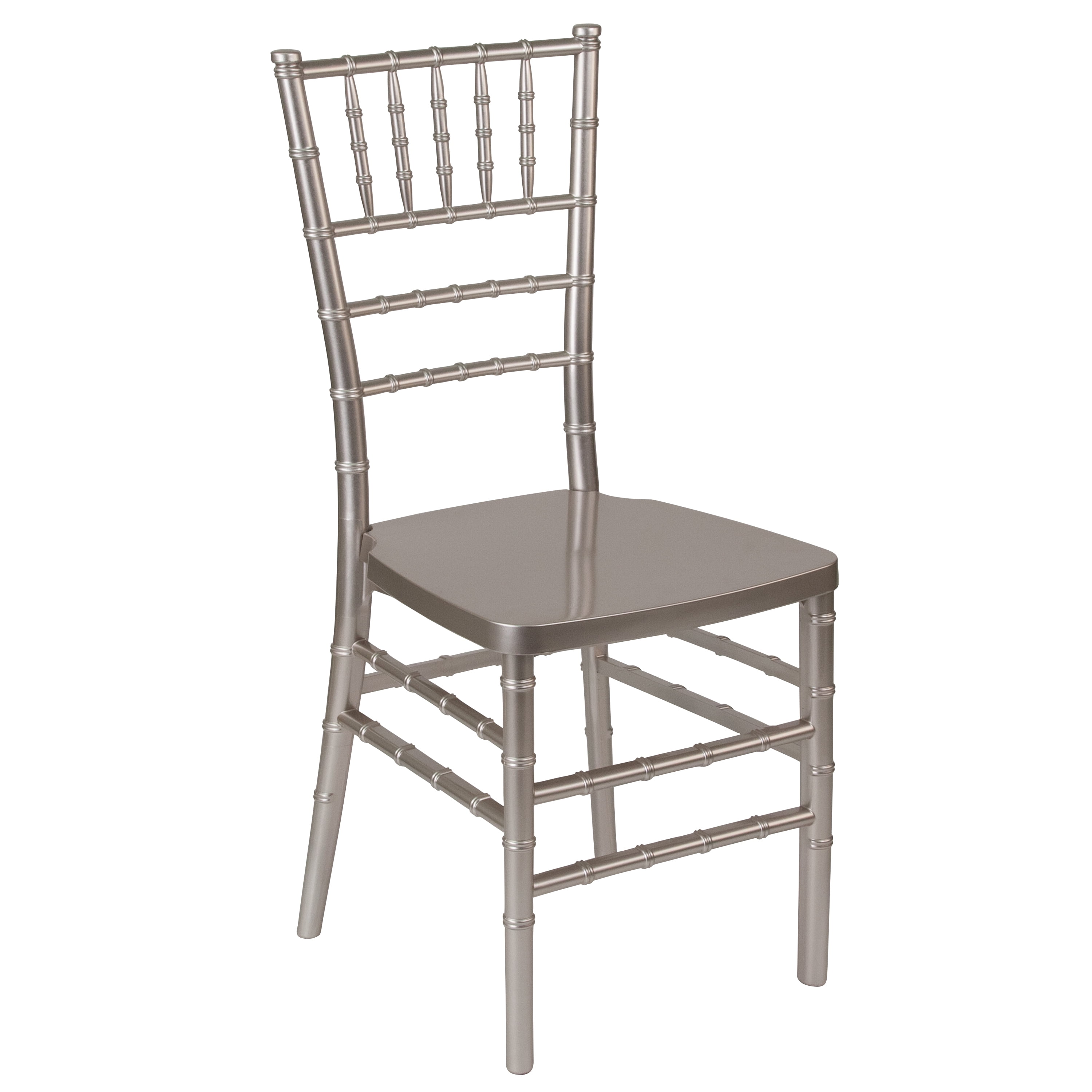 Pewter Resin Chiavari Chair for Indoor or Outdoor Events 1000 lb. Weight Capacity Stack Quantity: 8 Ultra-strong polycarbonate, non-stick and anti-static finish Wobble free one-piece frame, no screws Ships Fully Assembled 2 Year Limited Warranty on Frame Lightweight ballroom chair for weddings, banquet halls, restaurants, and rental companies