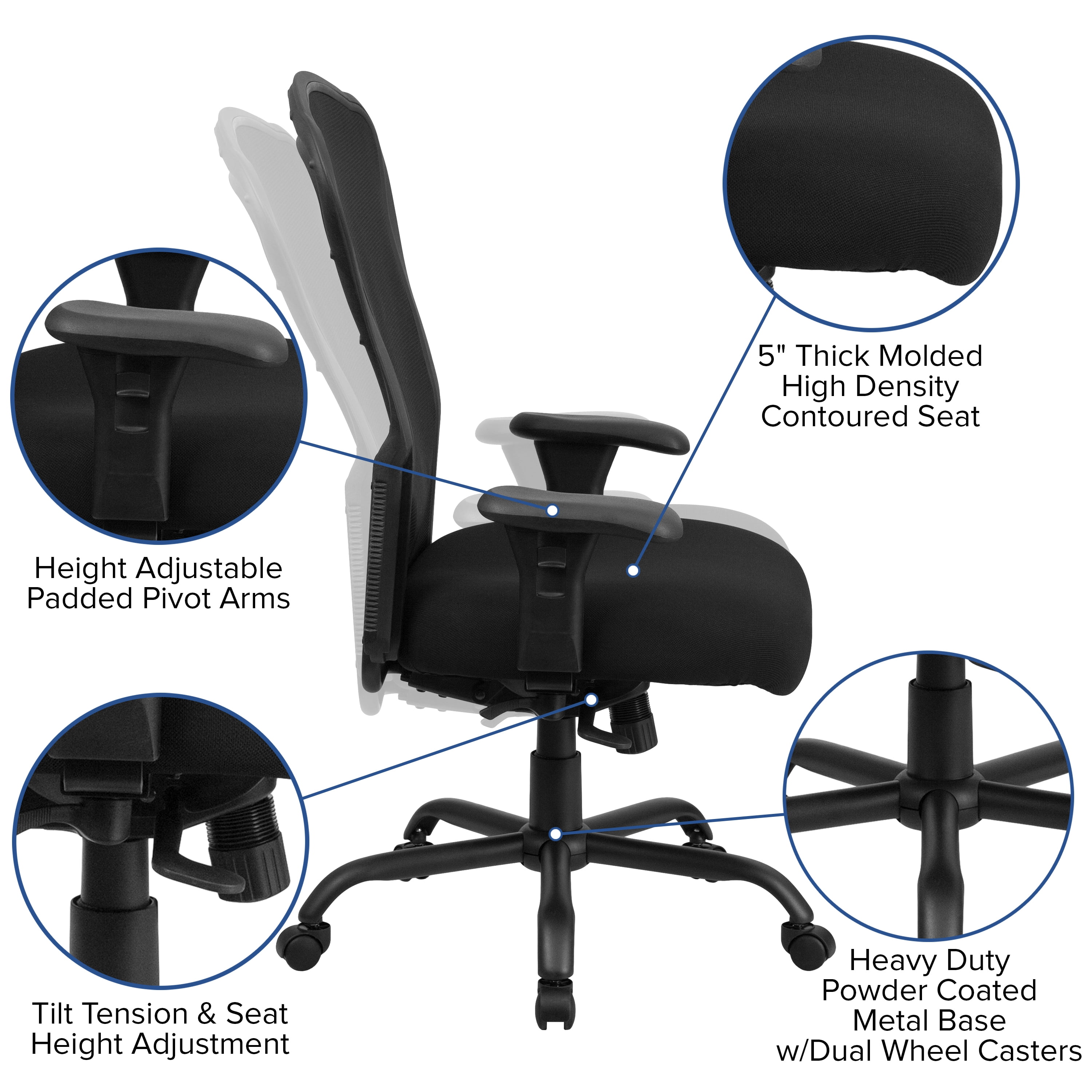 Contemporary 24/7 Multi-Shift Use Office Chair 400 lb. Weight Capacity High Back Design Ventilated Mesh Back Adjustable Height Lumbar Support Reinforced Back with metal frame support Dual Paddle Control Mechanism 2-to-1 Synchro Tilt Adjustment tilts the back and seat in unison for a comfortable seating position Tilt Tension Adjustment Knob adjusts the chair’s backward tilt resistance Padded Black Fabric Upholstered Seat 5″ Thick Molded, High Density Contoured Seat 24″ Wide Seat CA117 Fire Retardant Foam Swivel Seat Pneumatic Seat Height Adjustment Height & Width Adjustable Padded Pivot Arms Heavy Duty Powder Coated Metal Base Dual Wheel Casters