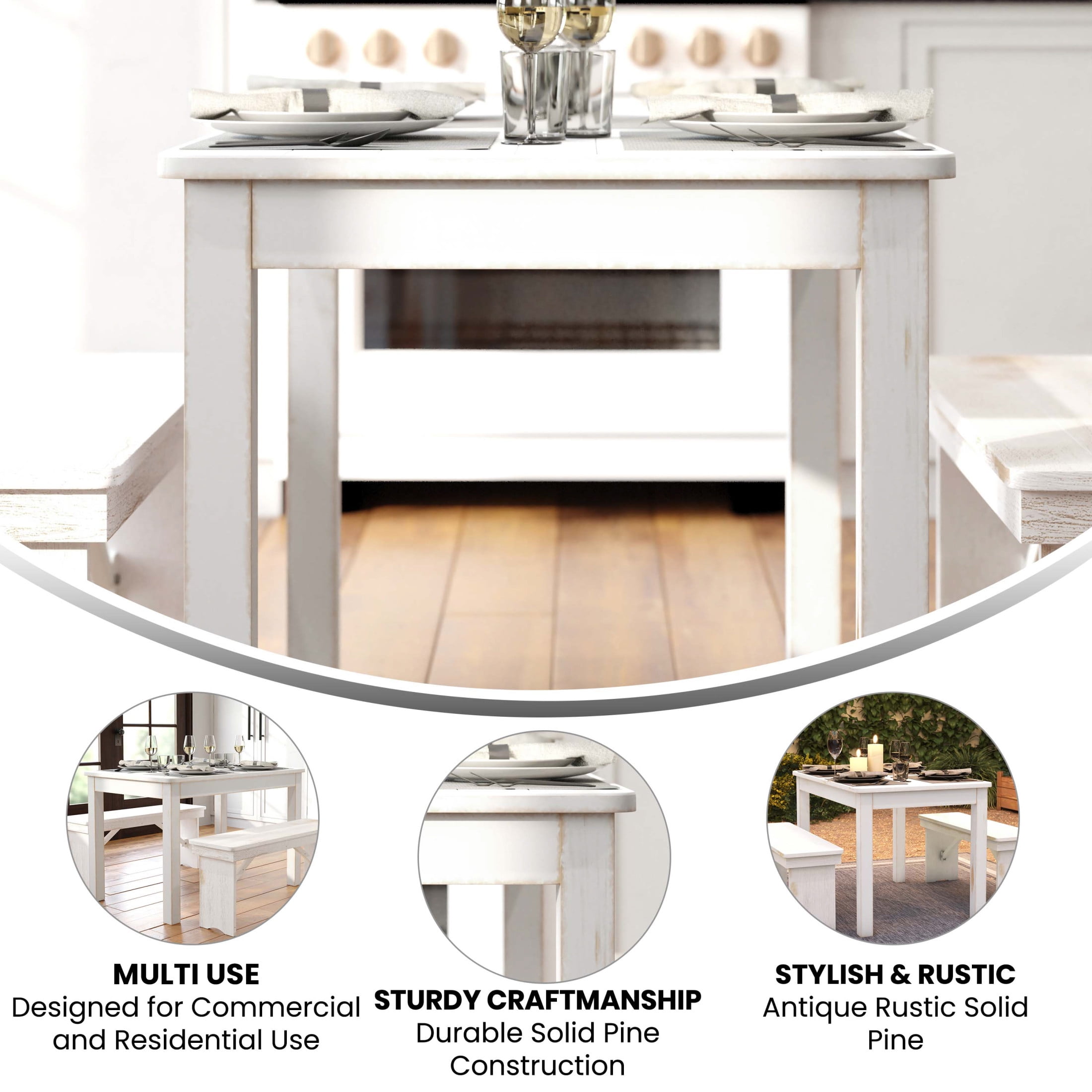 Set a stylish and rustic anchor in the heart of your home with this white rectangle dining room table where family can come together for delicious food and great conversation. Accommodate visiting guests with this rustic dining table that can comfortably seat up to four people. With its solid pine construction our beautiful farm table is suitable for daily use in restaurant and hospitality industries. To keep in spotless condition, use a water based cleaning agent and follow-up with a dry cloth. While constructed for indoor use, our sturdy dining room table can be taken outdoors for special events like family get-togethers and backyard barbecues during good weather. Achieve country-rustic appeal by leaving the table as-is, or easily dress it up with a tablecloth for elegant events.