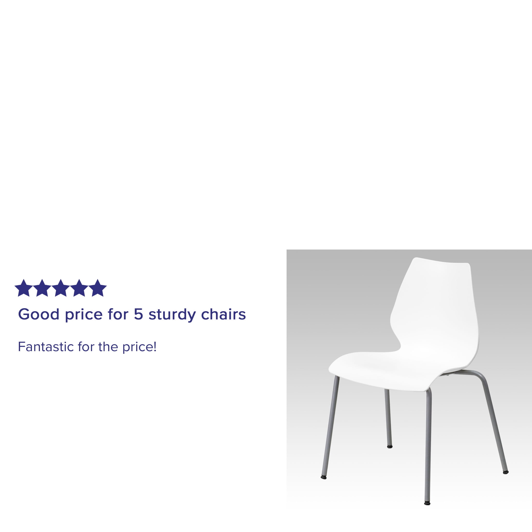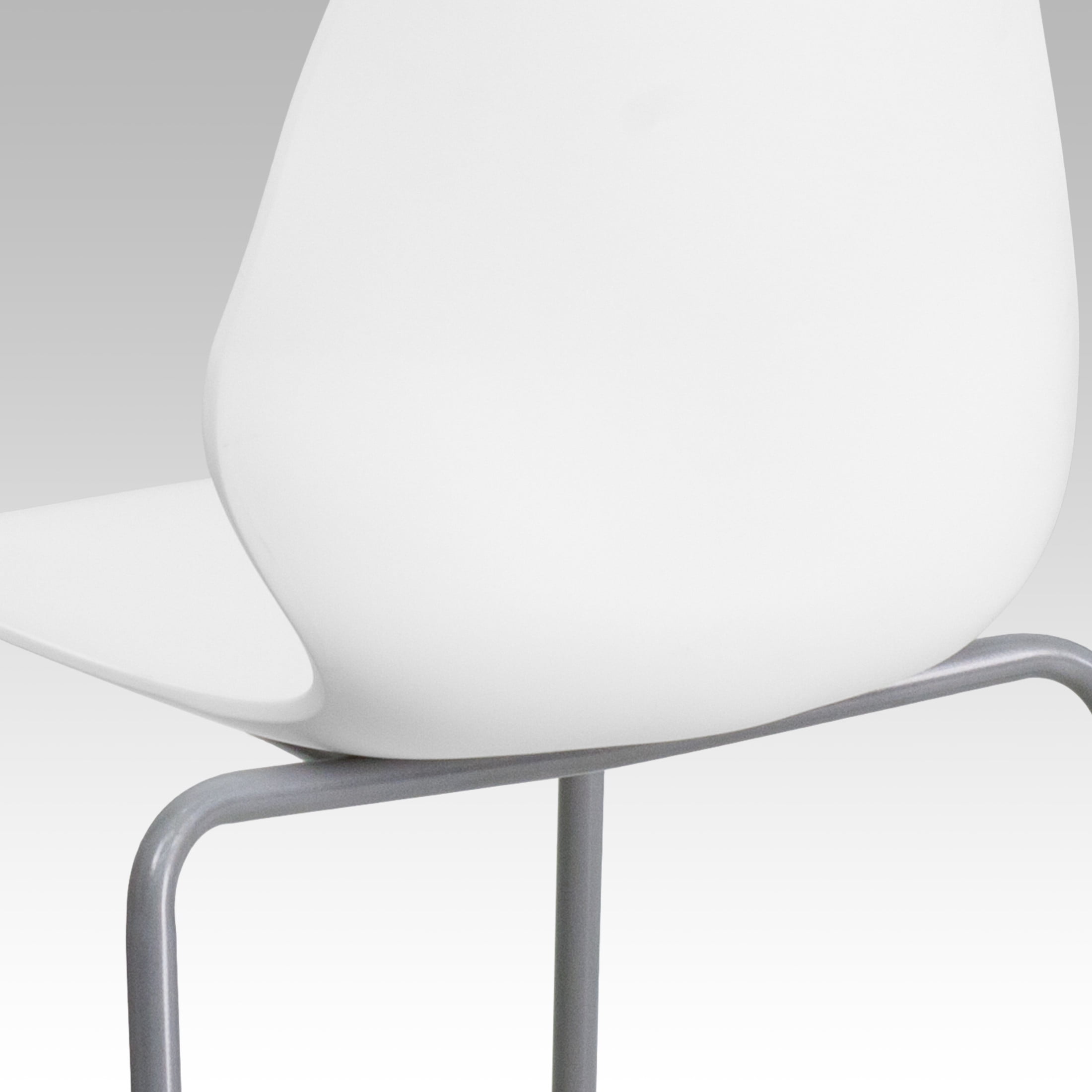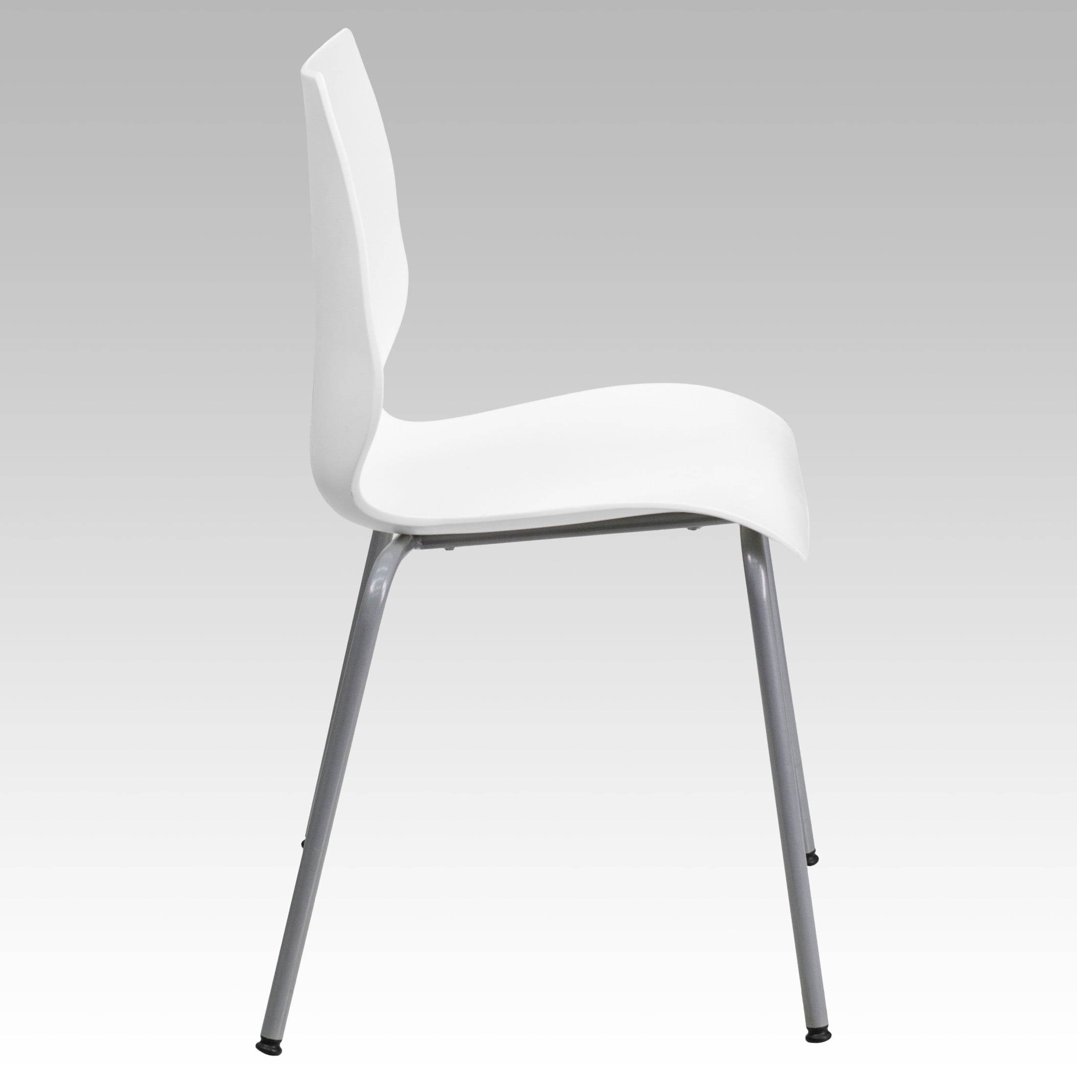 Flash Furniture HERCULES Series 770 lb. Capacity White Stack Chair with Lumbar Support and Silver Frame Multipurpose Stack Chair 770 lb. Weight Capacity Stack Quantity: 5 Ergonomically Contoured Design with White Plastic Back and Seat Retro Modern Design Curved Back supports lower back Easy to Clean Polypropylene Material Silver Powder Coated Frame Finish with Plastic Floor Glides Limited Lifetime Warranty on Frame Designed for Commercial Use Ships Fully Assembled PRODUCT MEASUREMENTS: Overall Size: 22.5″W x 17.75″D x 31.5″H; Seat Size: 15-18″W x 16″D x 17.5″H; Back Size: 16″W x 14.5″H; No Assembly Required