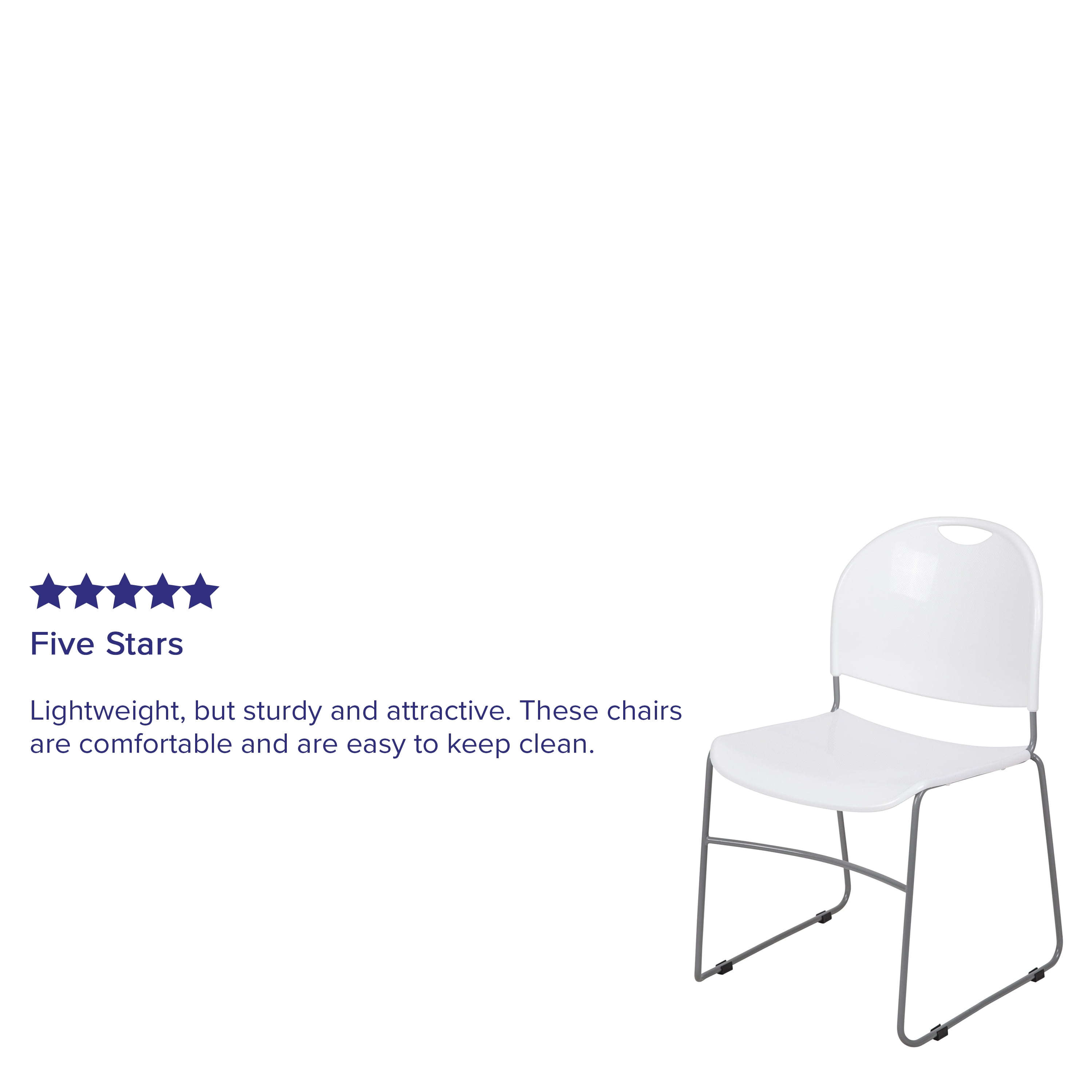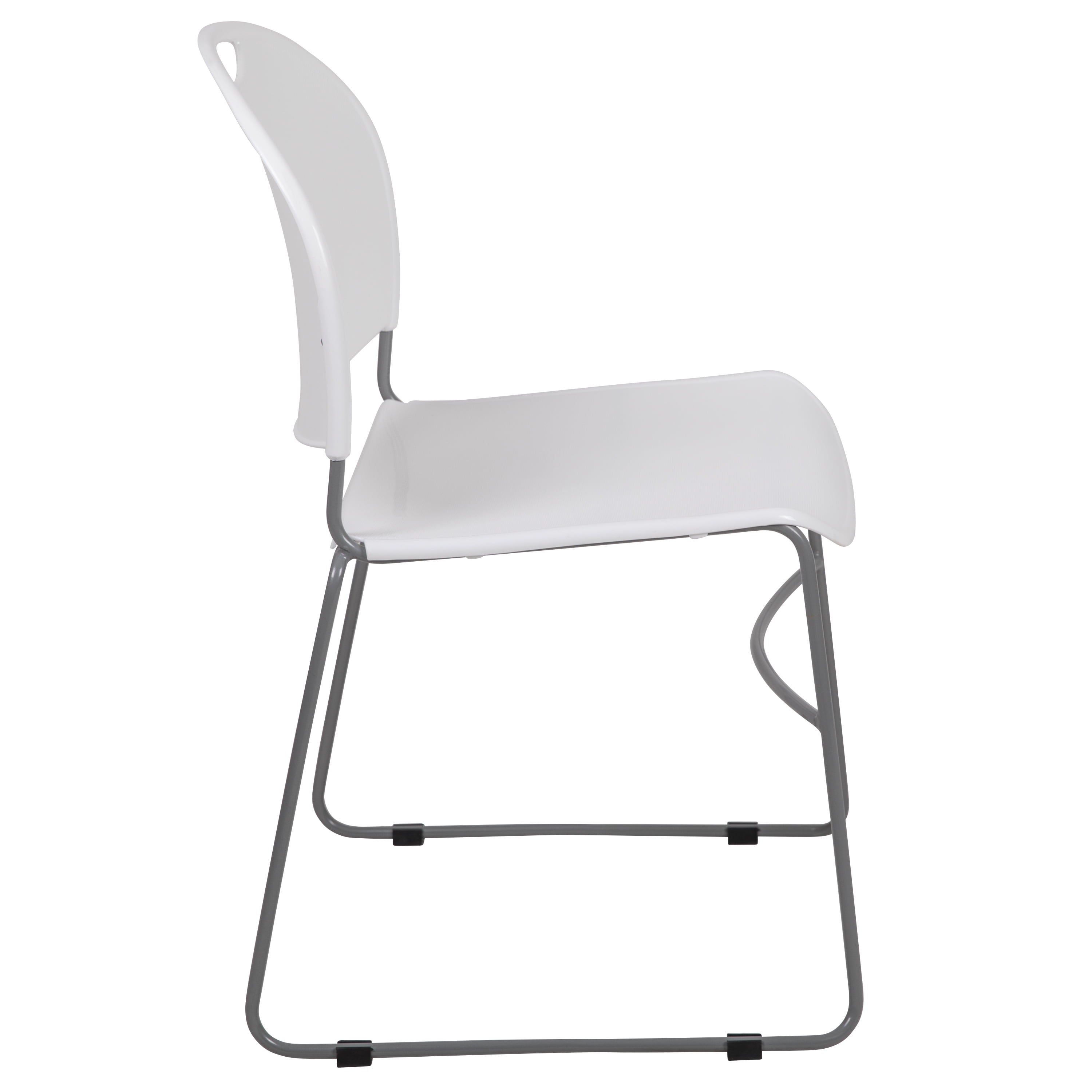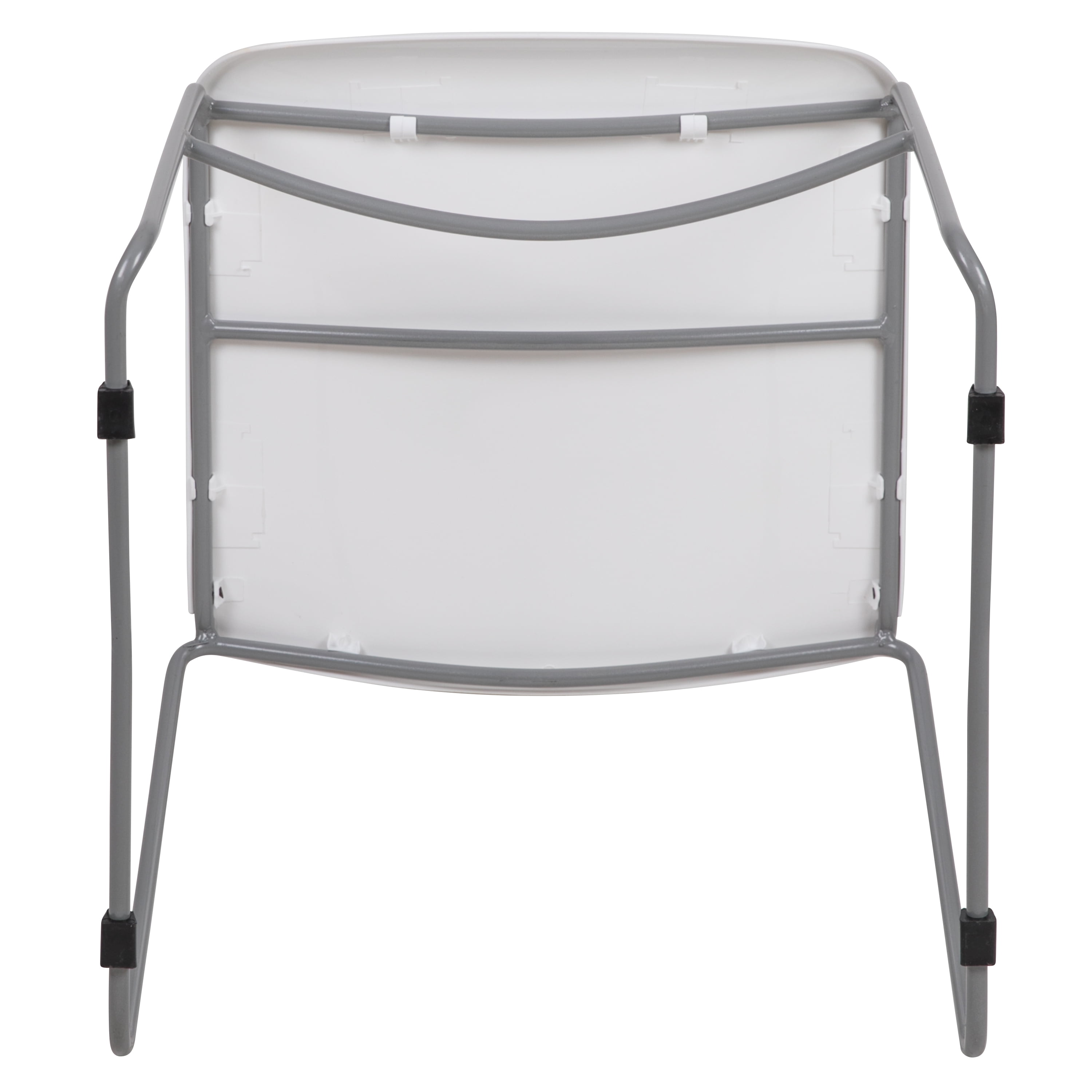 Multipurpose Stack Chair 880 lb. Weight Capacity Stack Quantity: 35 Ergonomically Contoured White Plastic Back and Seat Carrying Handle to better transport No-Fade Infused Polypropylene Material 15 Gauge Steel Frame Silver Sled Base Frame with non-marring plastic floor glides Limited Lifetime Warranty on Frame Ships Fully Assembled