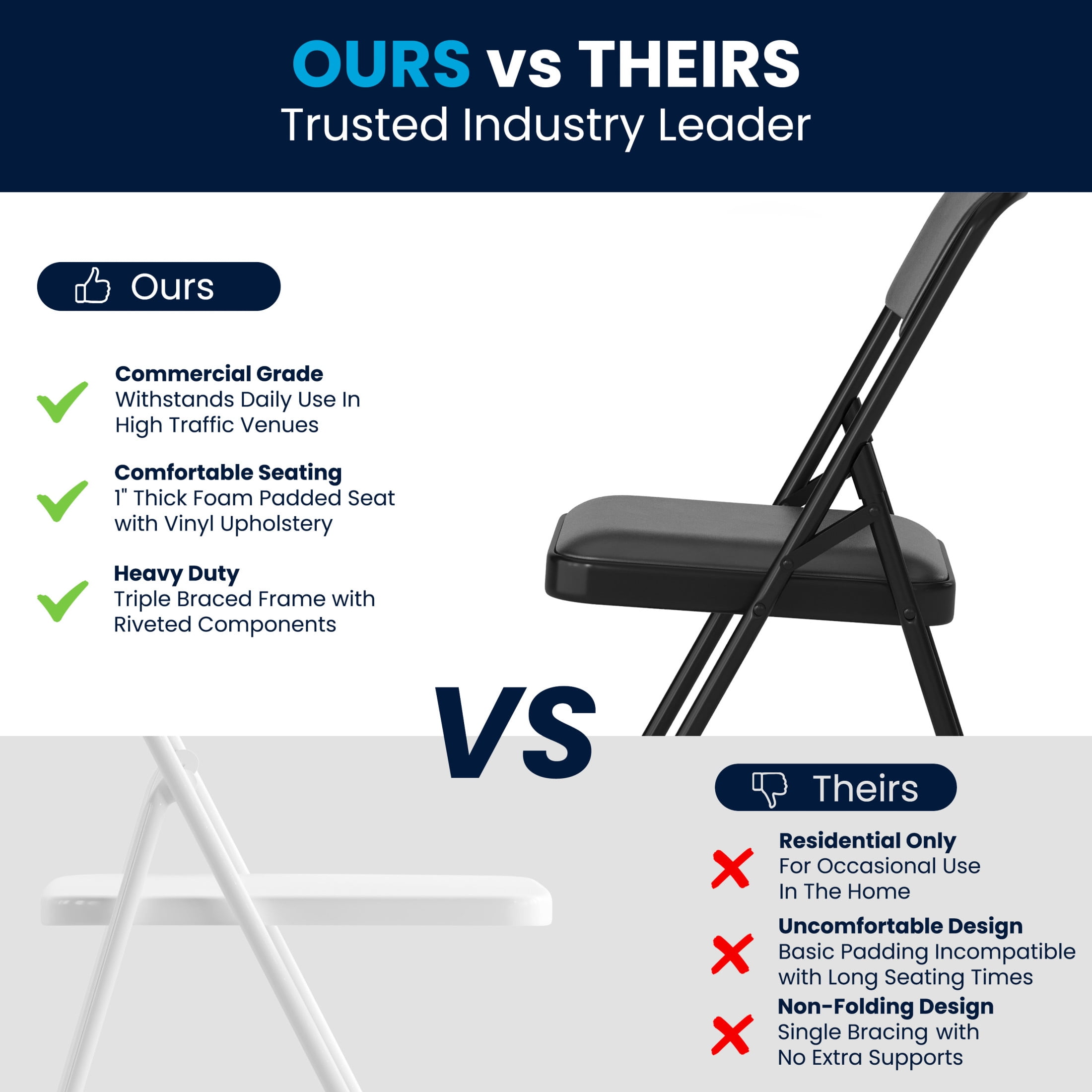 Flash Furniture Hercules Series Adult Triple Braced & Double Hinged Folding Chairs, Set of 4, Black Great for catering events, get-togethers, school functions, business meetings, and more 1″ thick, CAL 117 foam padded seat upholstered in soft vinyl Lightweight, foldable design allows for easy portability and compact storage Protective non-marring floor glides Durable 18-gauge steel, curved triple braced and double hinged frame with powder coat finish No assembly required Supports up to 300 lbs. of static weight EASY TO CLEAN: Chairs measure 18.5″W x 19″D x 30″H open and 18.5″W x 3″D x 39″H folded with no assembly required, and they can be wiped down with a damp cloth for easy cleaning as needed